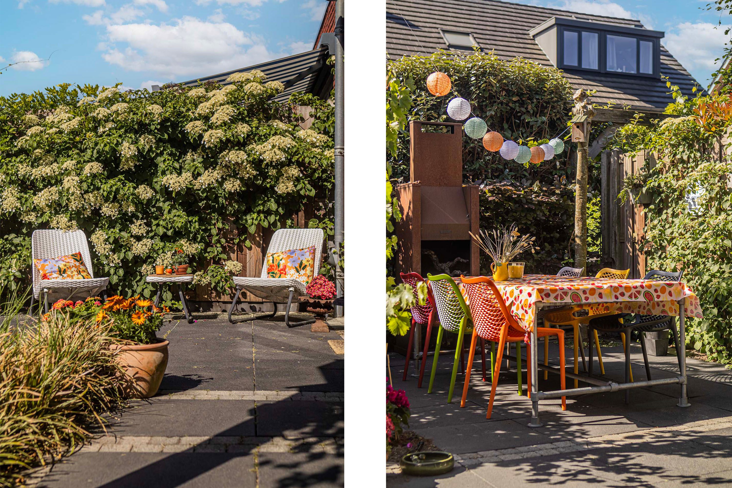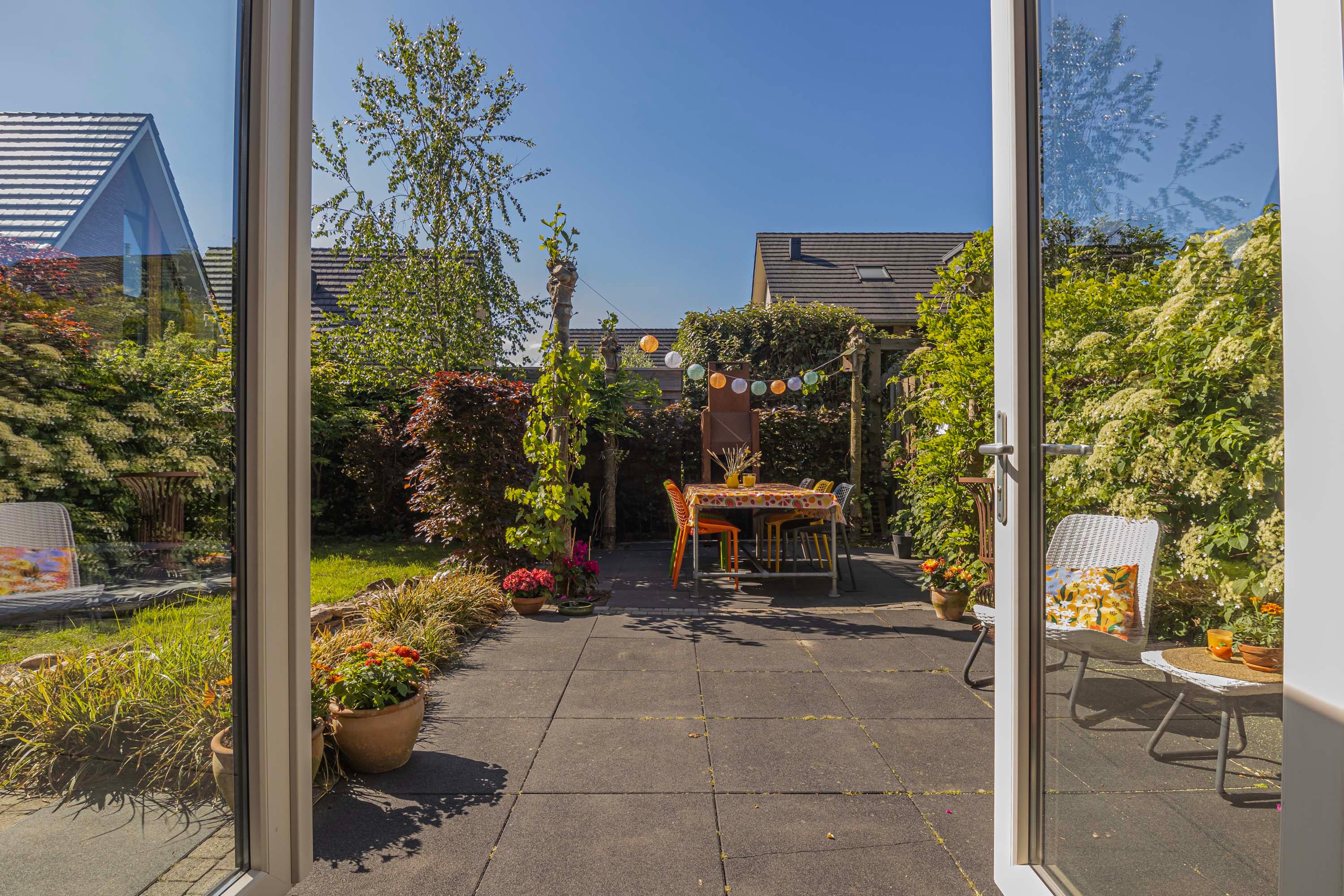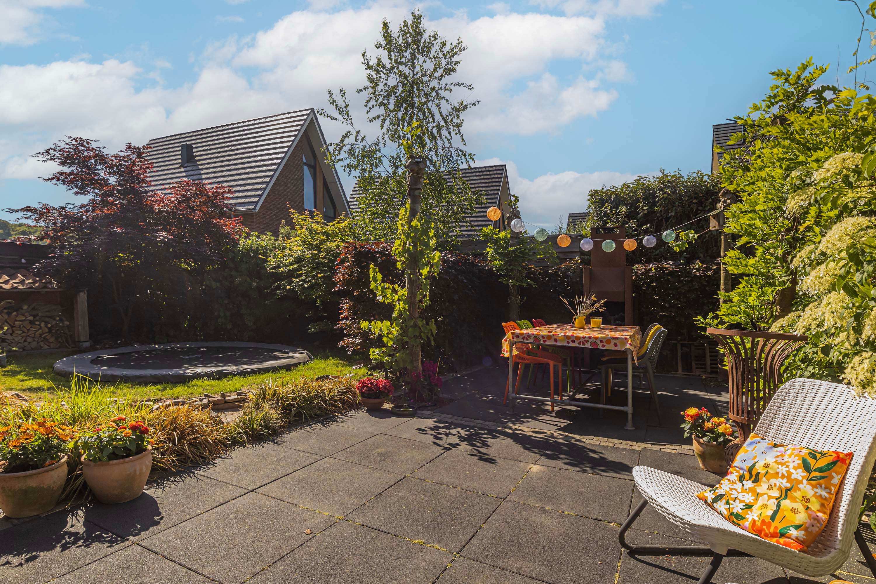 De royale, fraai aangelegde tuin ligt op het zuiden en biedt volop zon en privacy. Dankzij de diverse zitjes kun je op elk moment van de dag een fijne plek vinden om te ontspannen of buiten te eten.