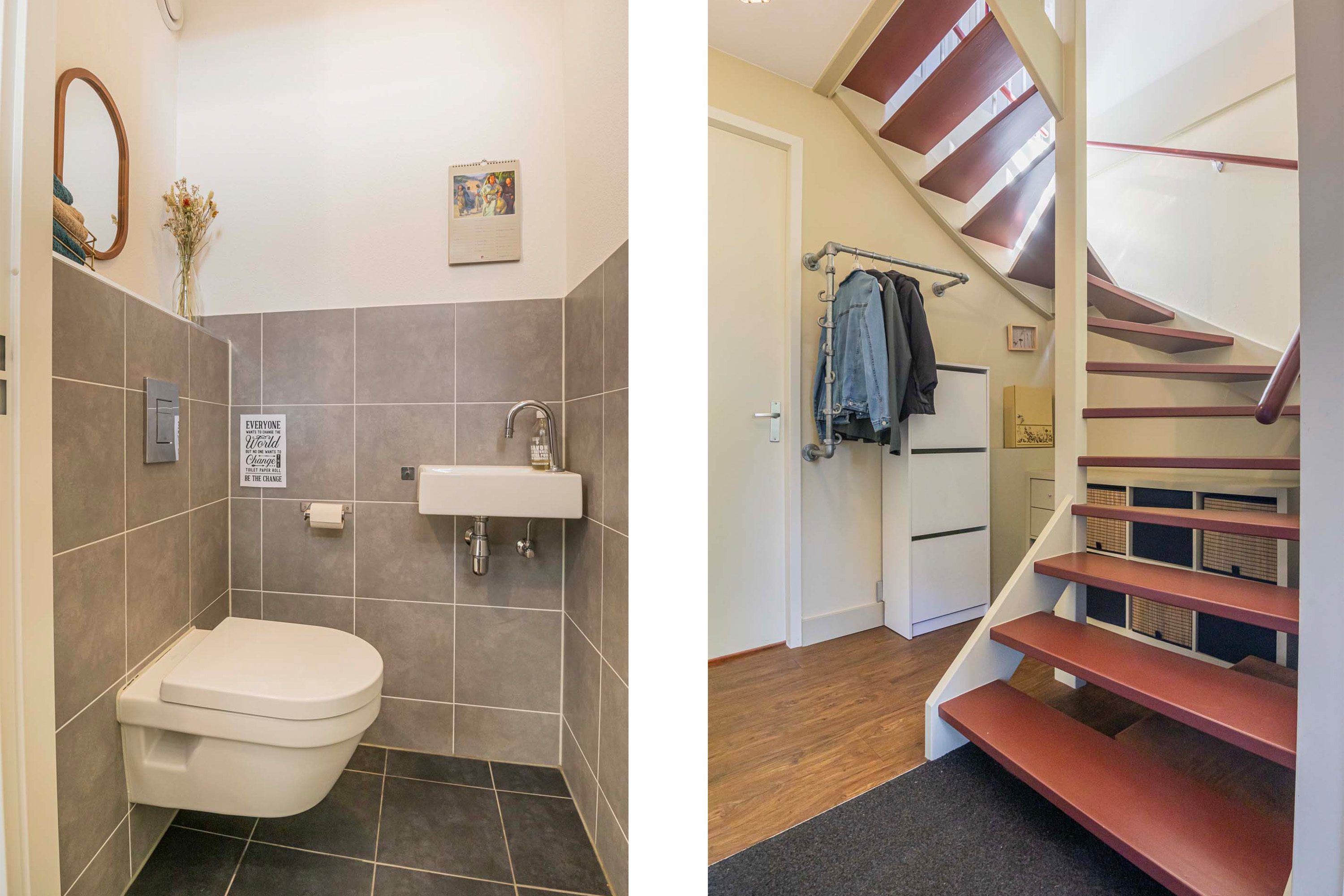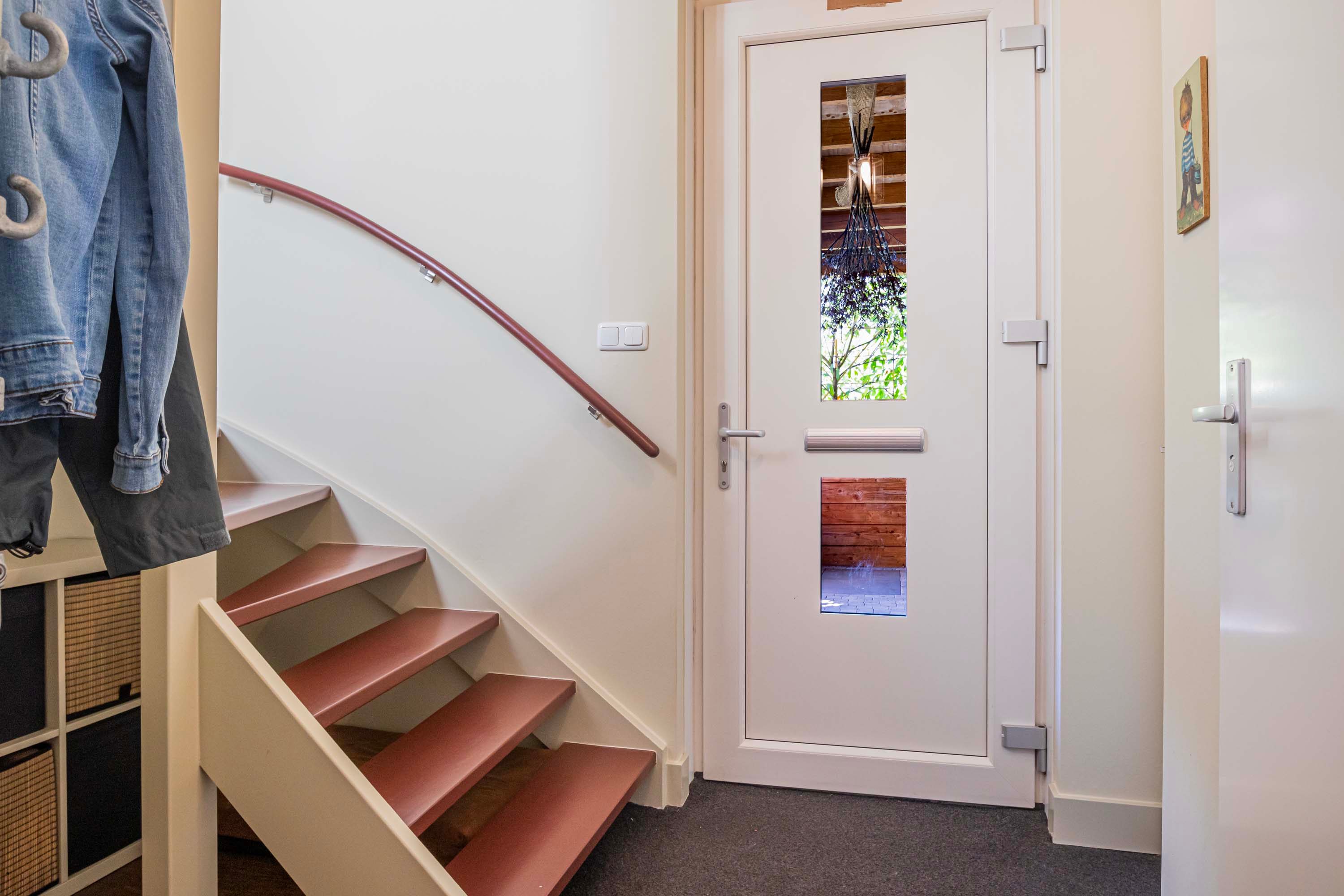 Via de overkapping bereik je de voordeur van de woning. Je komt binnen in een ruime entreehal die toegang biedt tot de meterkast, het toilet, de trap naar de eerste verdieping en de woonkamer.
