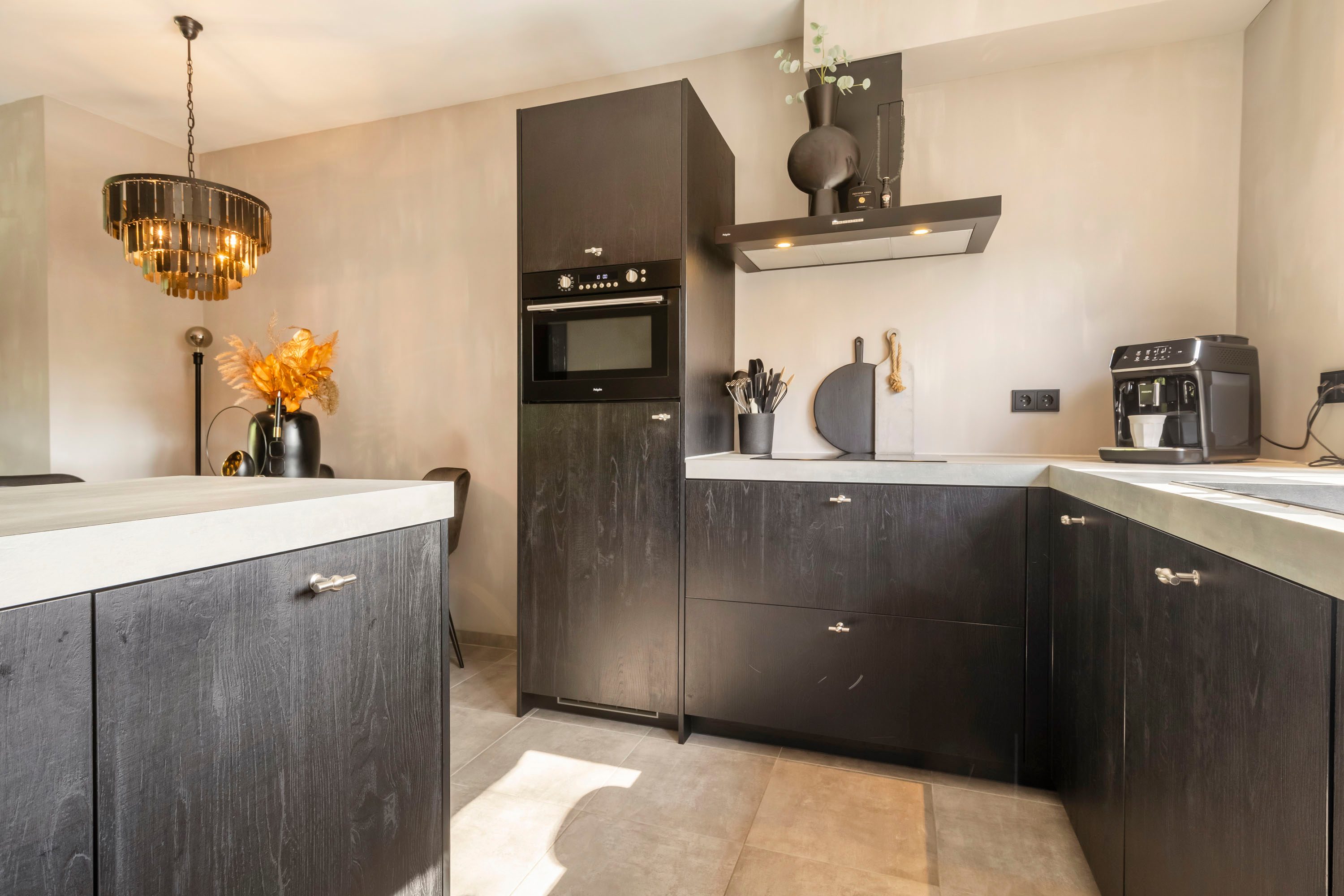 De open keuken is stijlvol en modern afgewerkt en volledig uitgerust met hoogwaardige inbouwapparatuur, waaronder een vaatwasser, kookplaat, afzuigkap, Quooker, oven en een koel-/vriescombinatie.