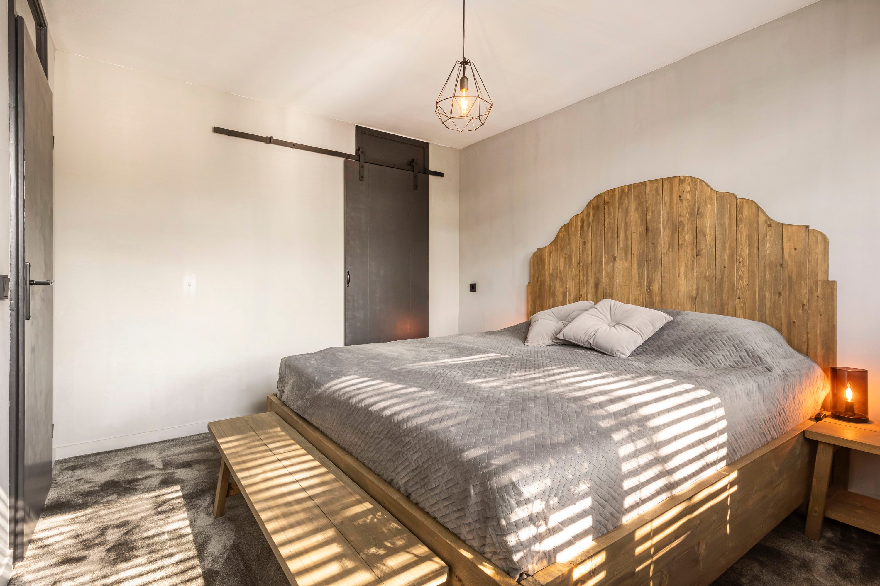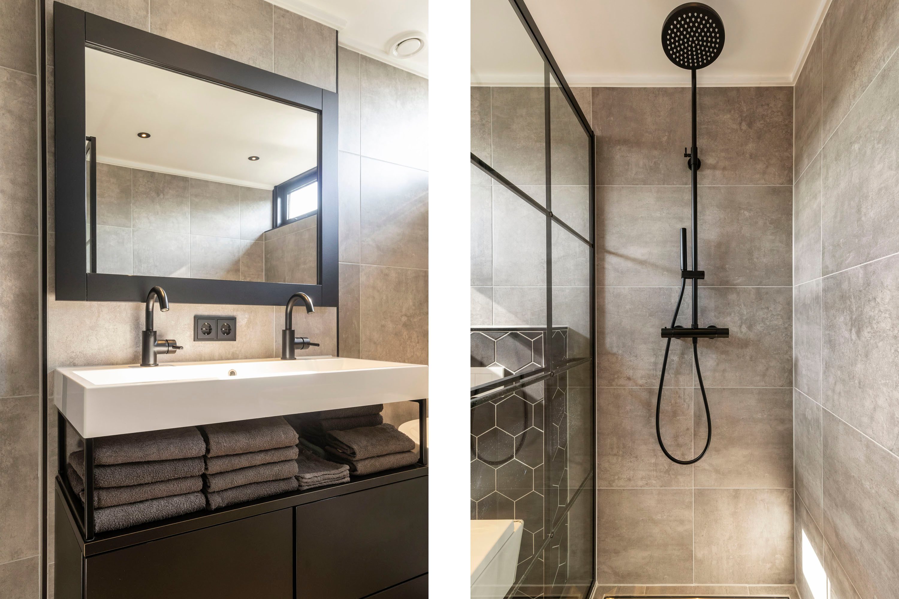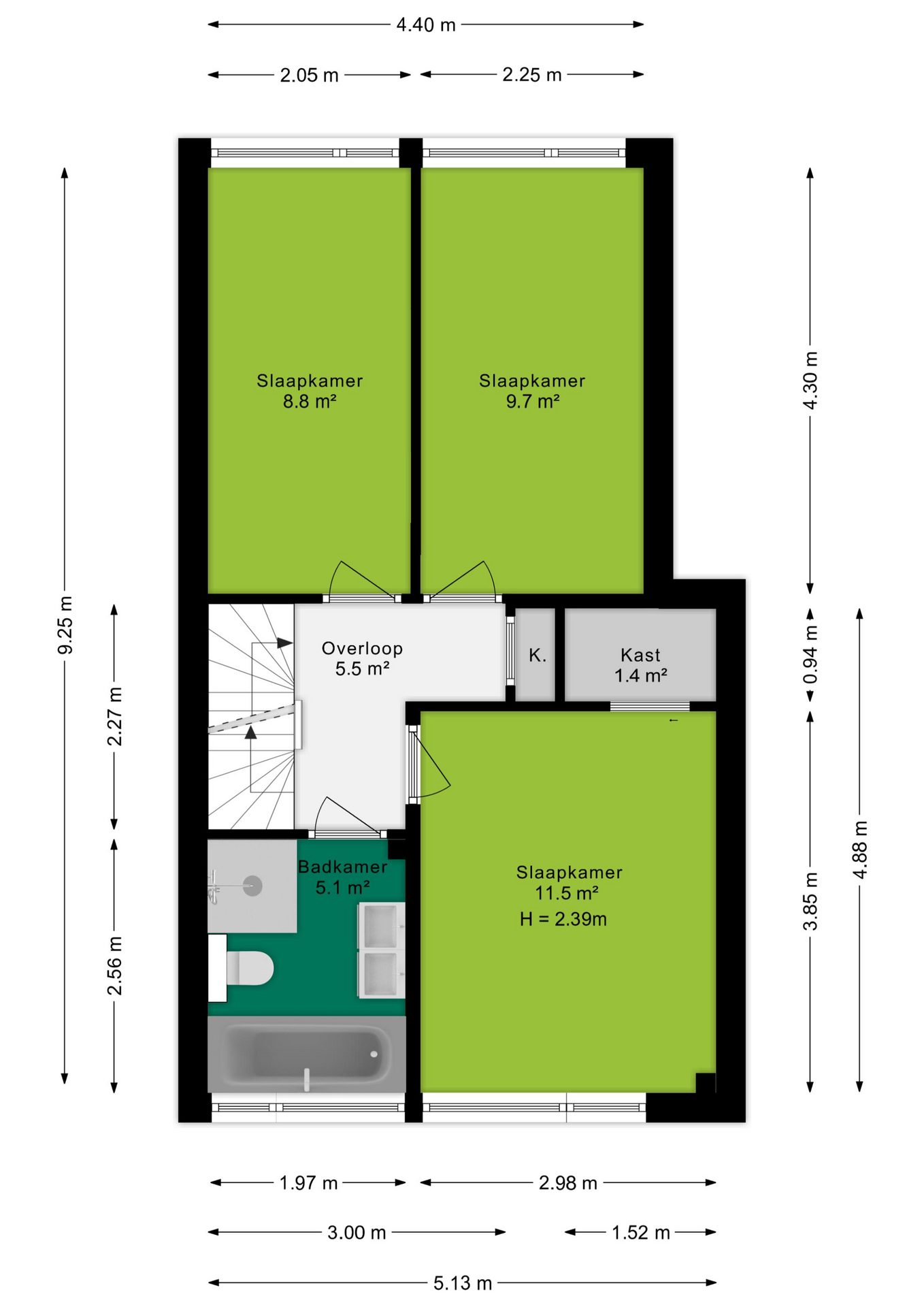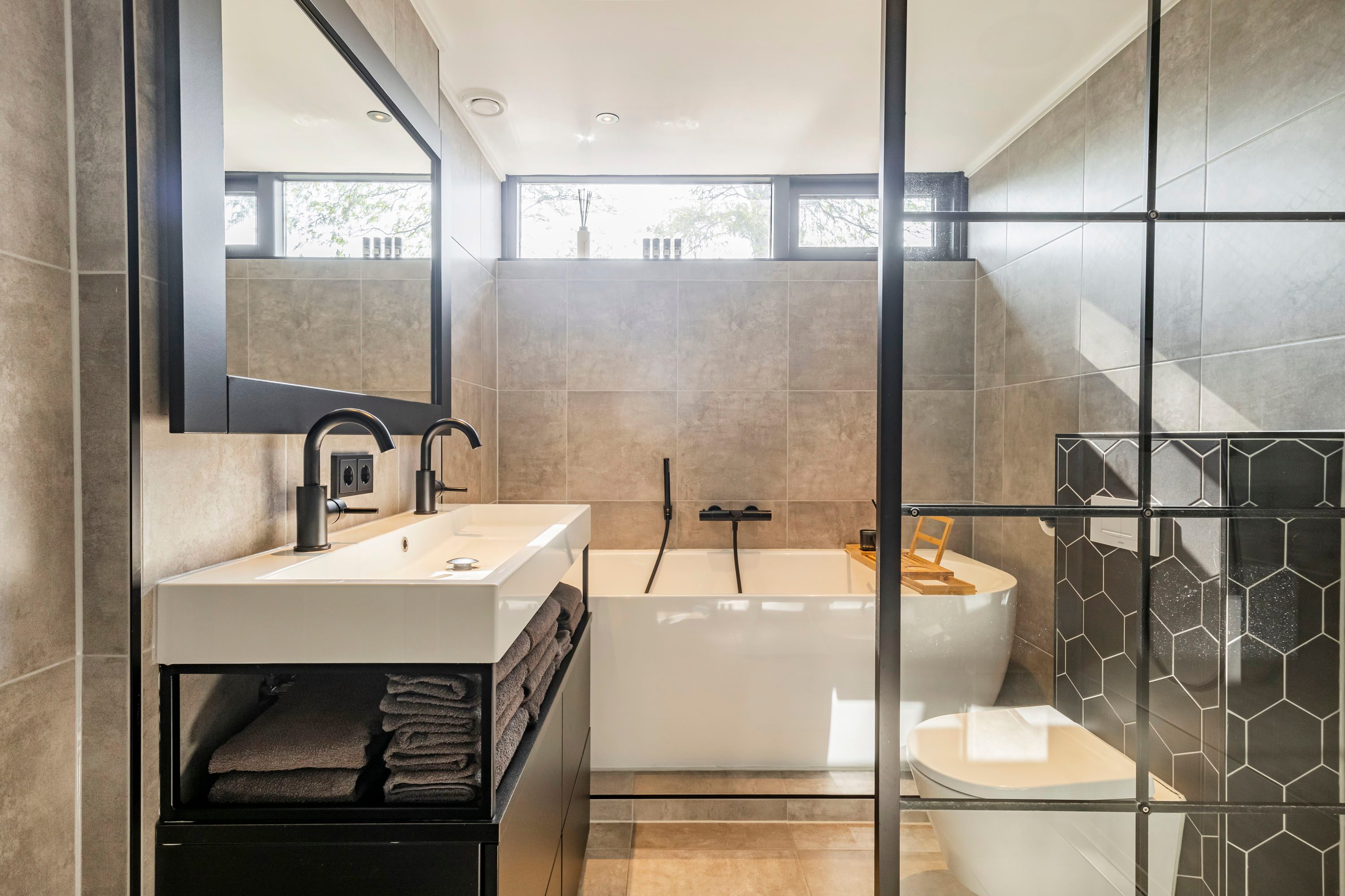 Op de eerste verdieping leidt de ruime overloop naar alle vertrekken. Hier bevinden zich drie slaapkamers met een oppervlakte van respectievelijk 11,6 m², 9,7 m² en 8,8 m². Alle kamers beschikken over grote ramen die veel lichtinval genereren, en één van de slaapkamers is voorzien van een praktische inbouwkast. De badkamer is modern ingericht en uitgerust met een ruim wastafelmeubel, een inloopdouche, een bad, een toilet en vloerverwarming. De antracietgrijze tegels zorgen voor een elegante uitstraling.