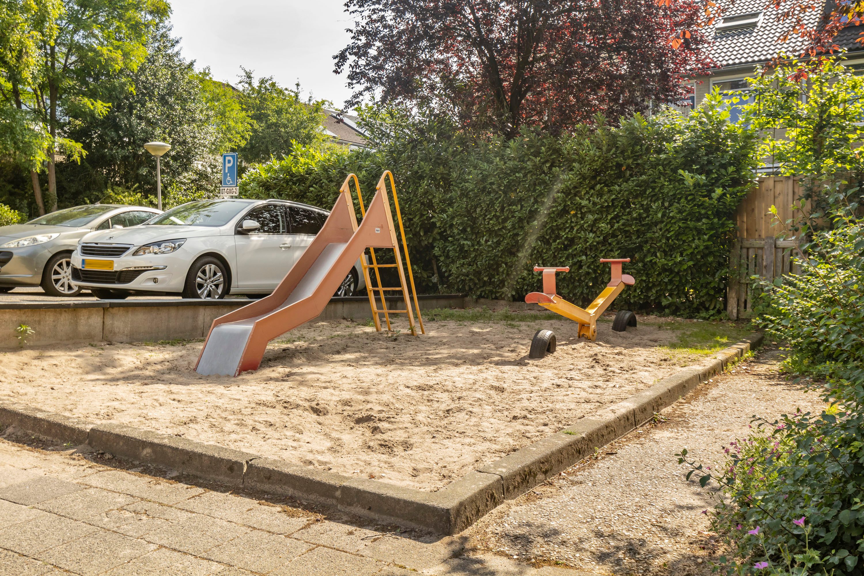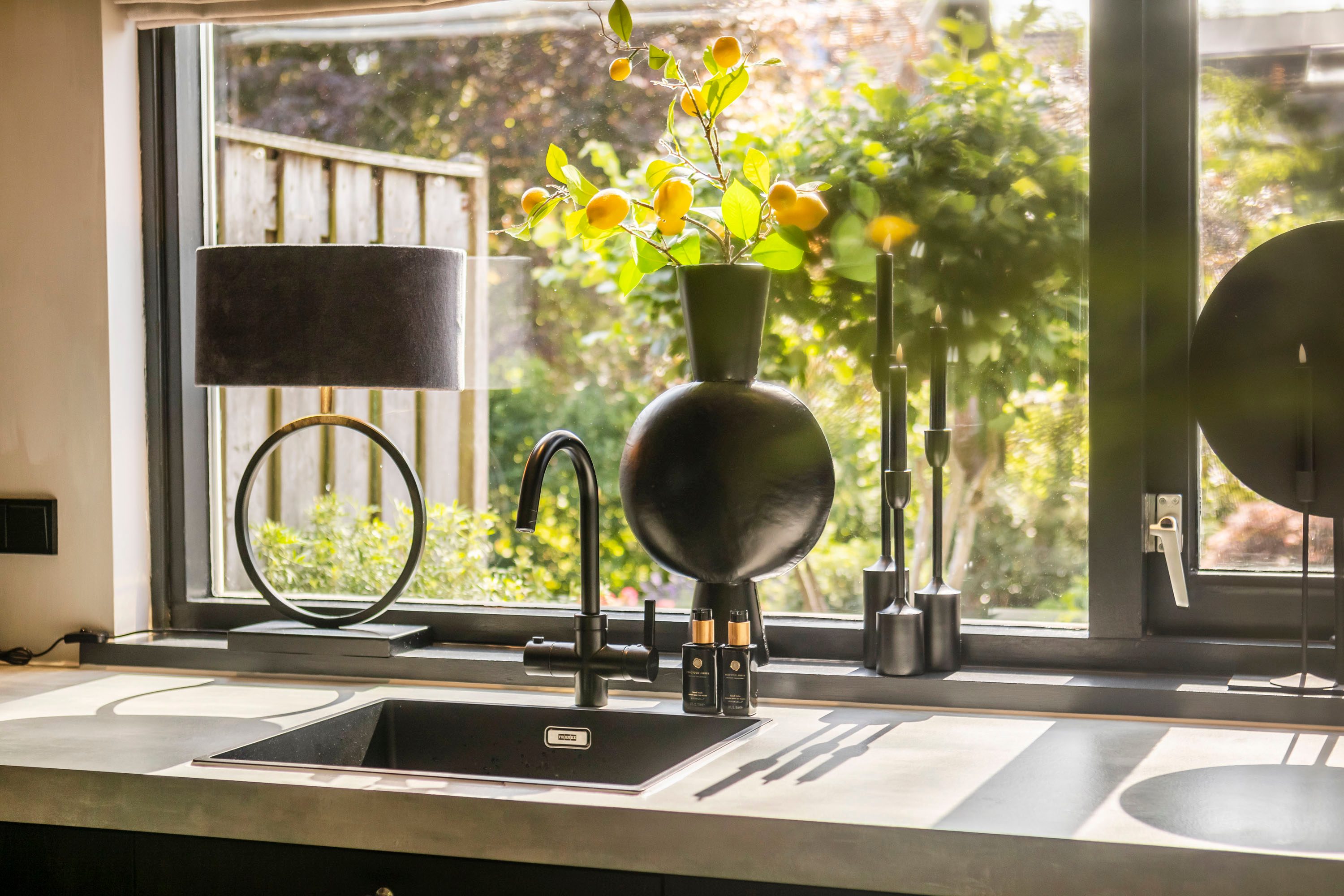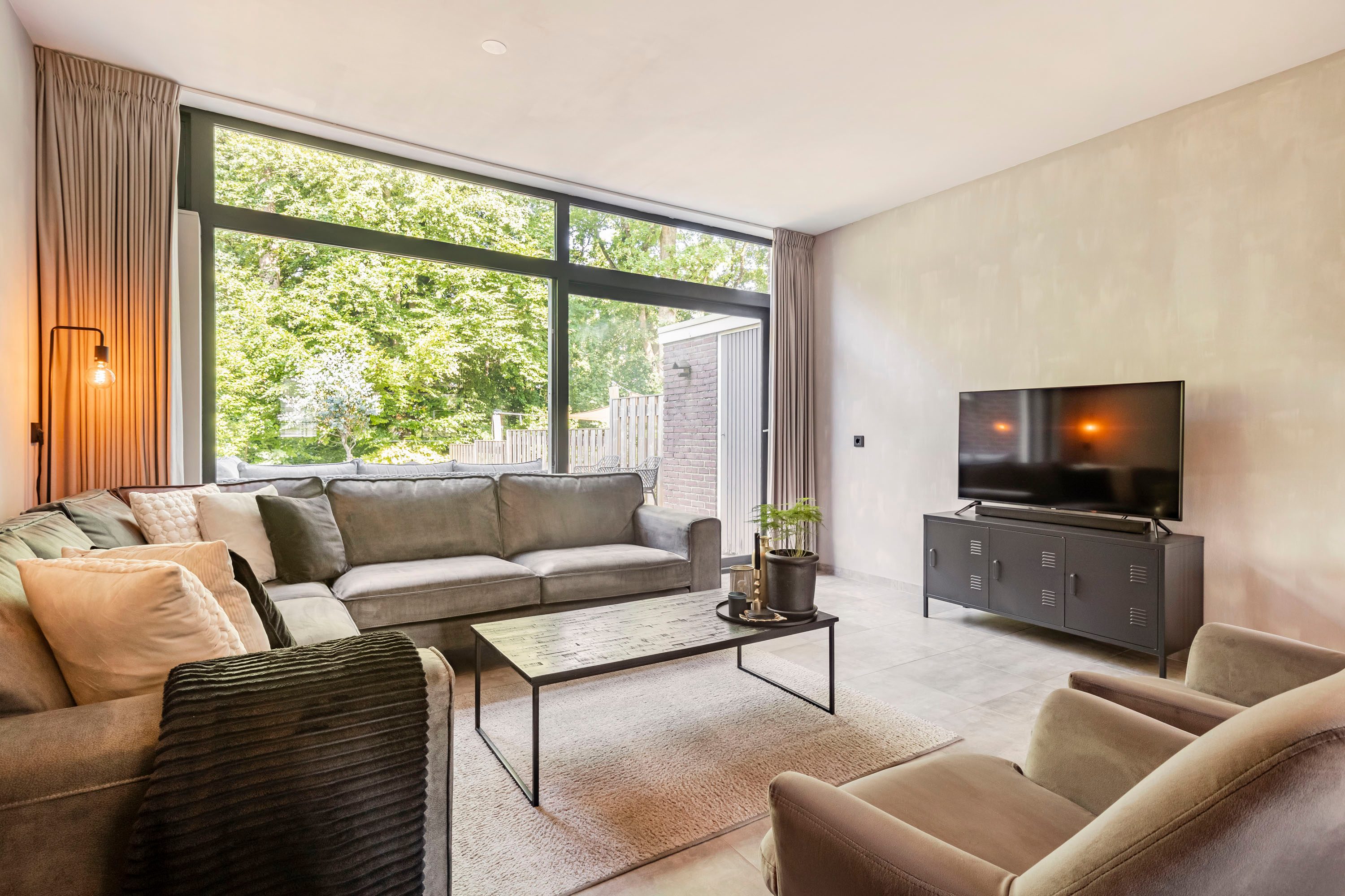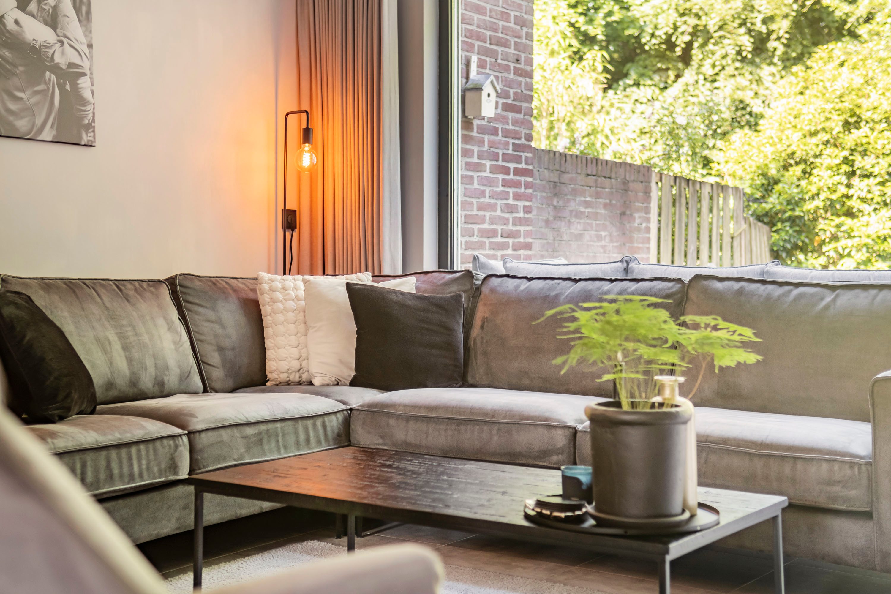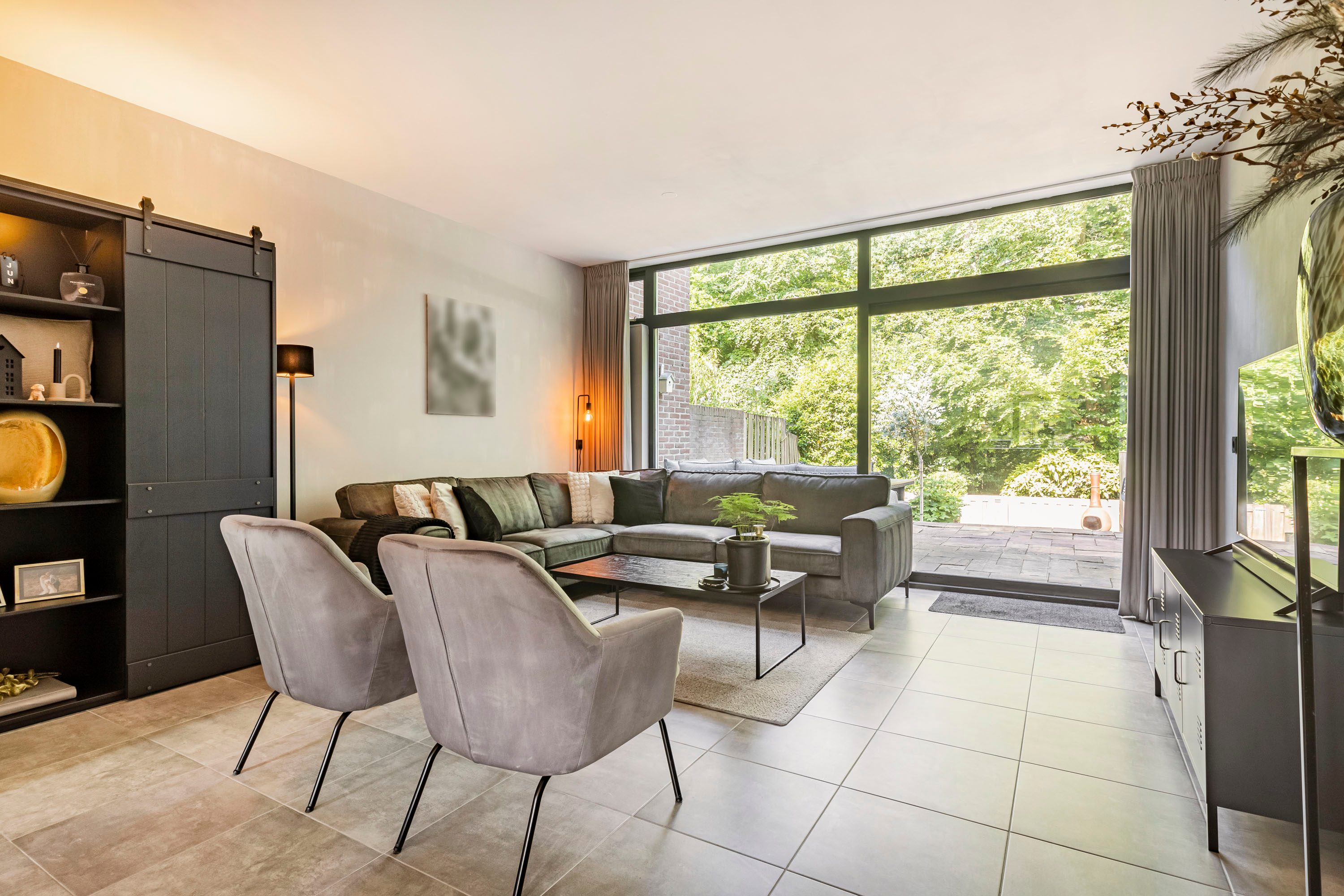 De zonnige, op het westen gelegen tuin biedt volop ruimte voor een stijlvolle zithoek, perfect om te ontspannen of gasten te ontvangen.
