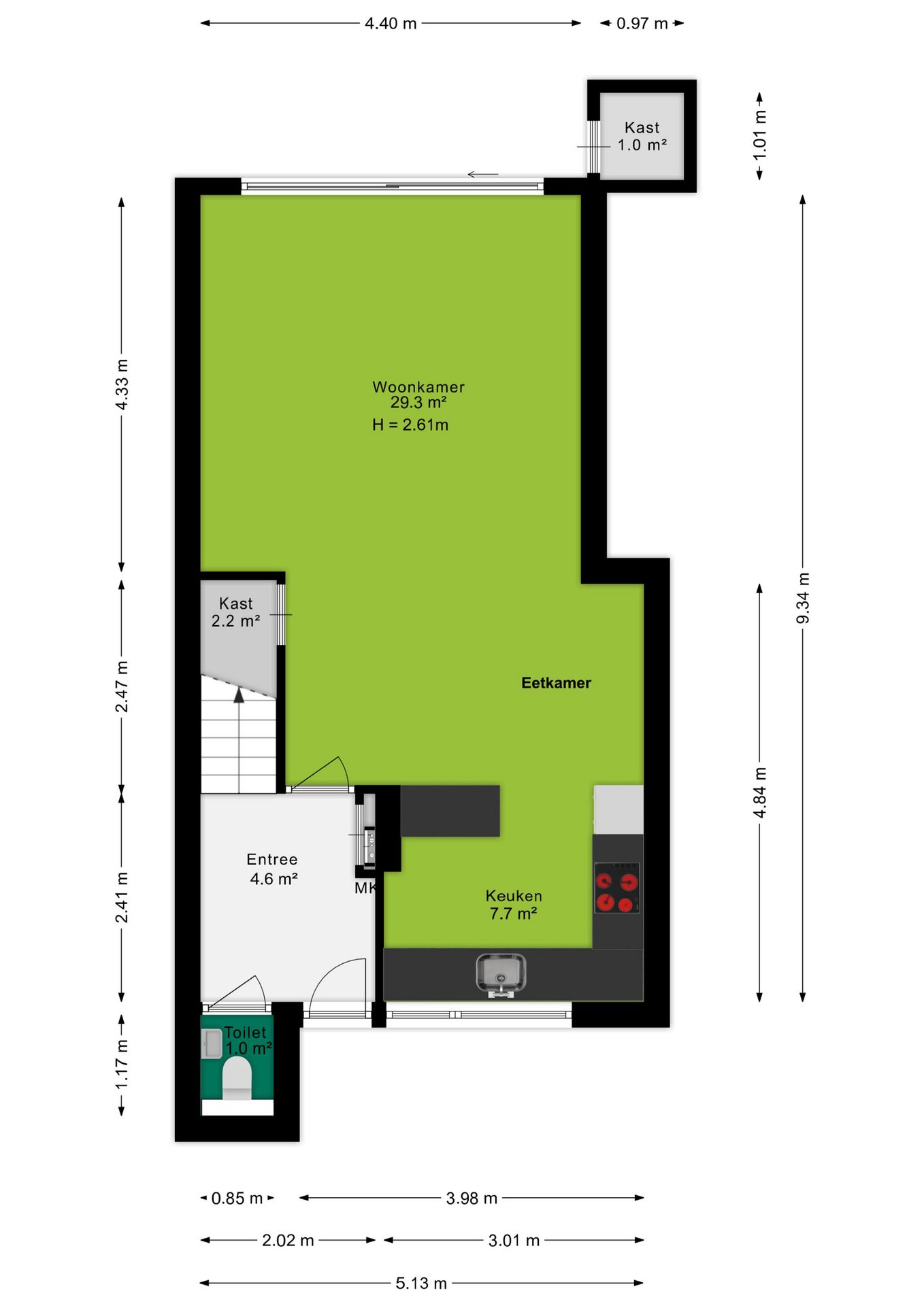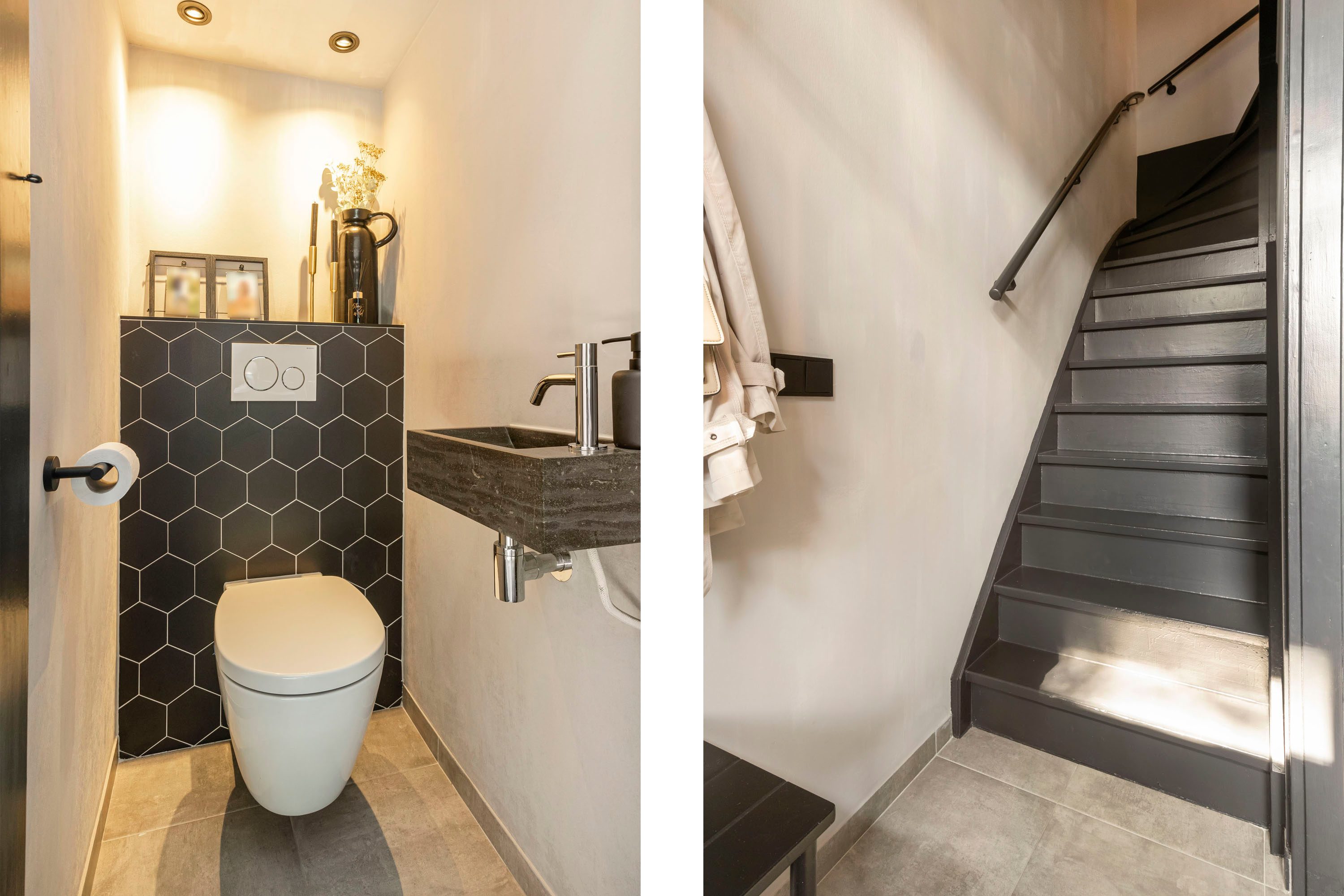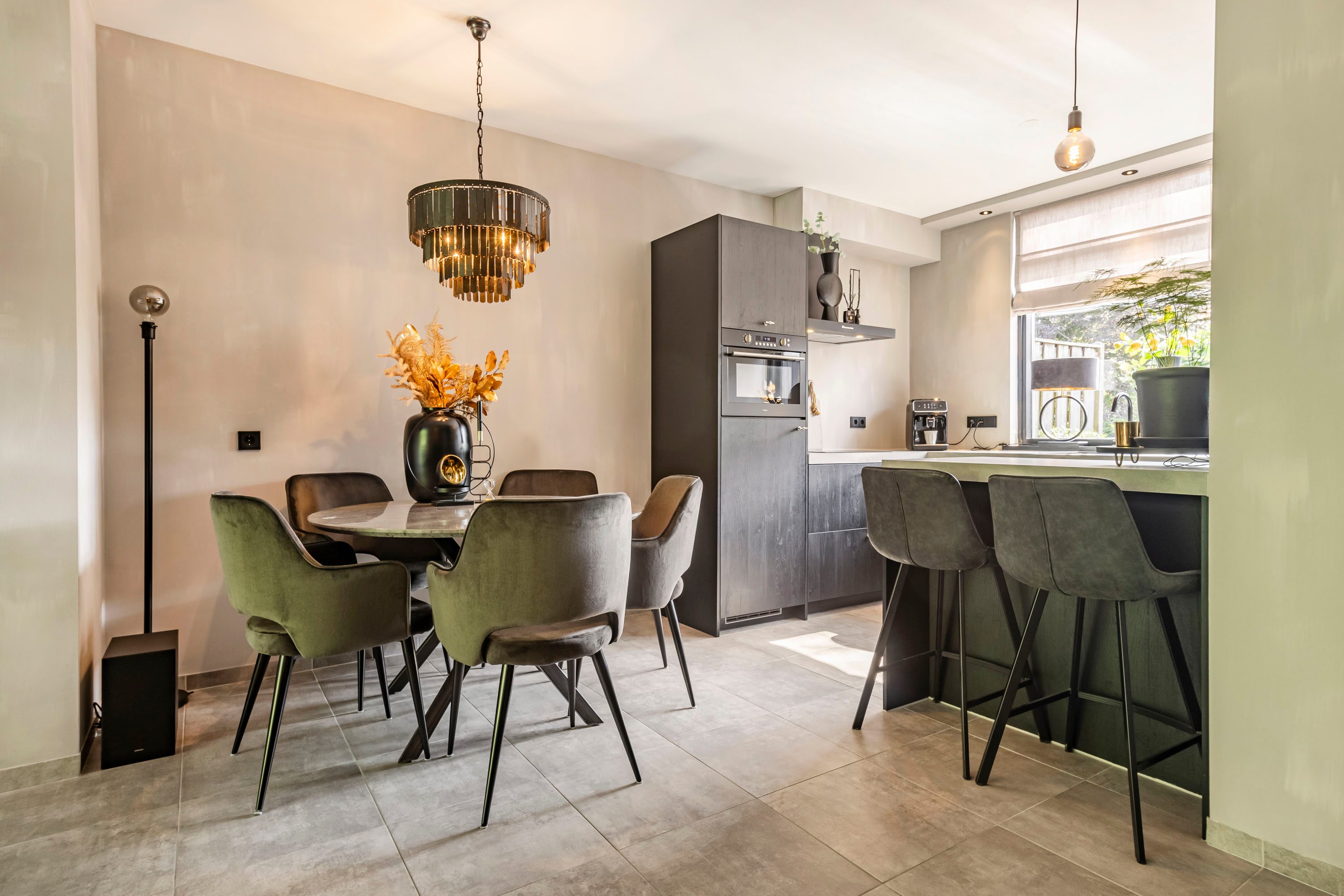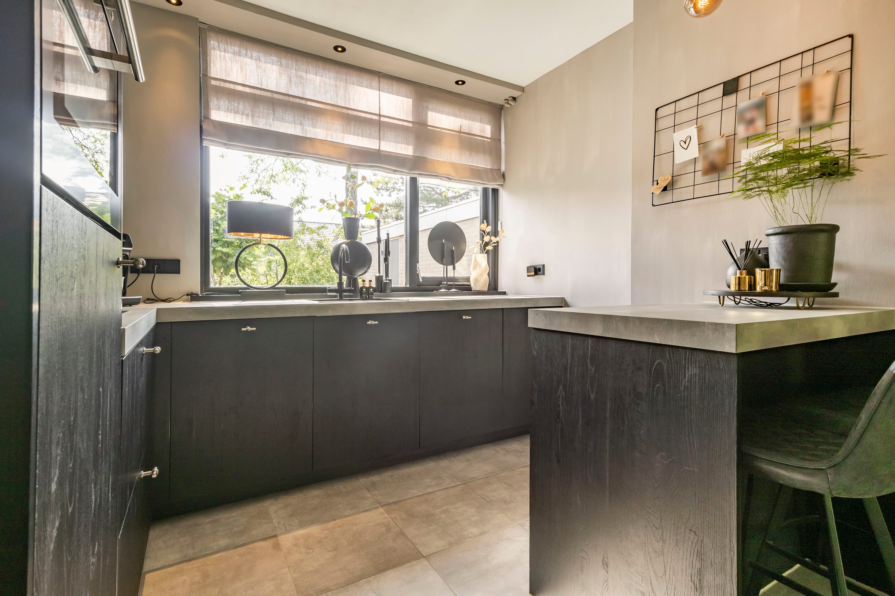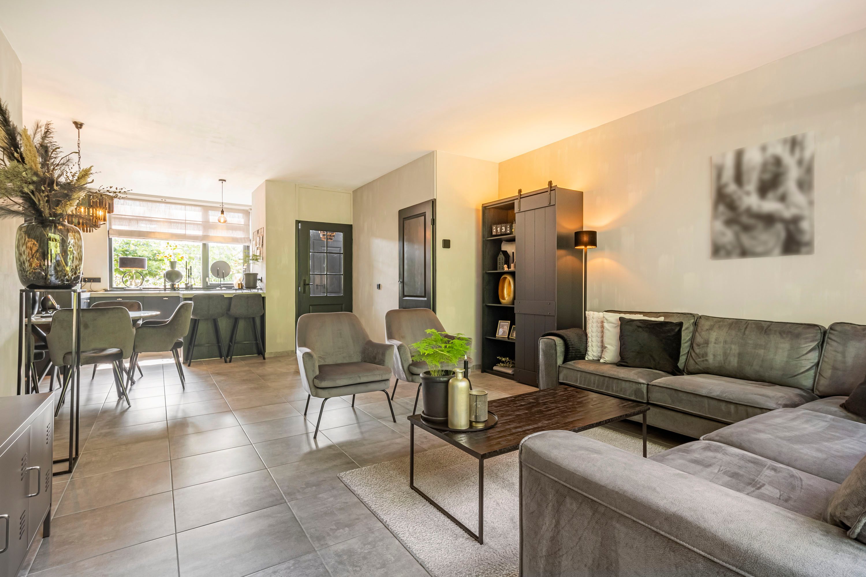 Bij binnenkomst via de ruime entree tref je een modern toilet, de meterkast en een trapopgang naar boven. Vanuit hier loop je de woonkamer binnen, waar de grote raampartijen direct in het oog springen en zorgen voor een overvloed aan natuurlijk licht. De woonkamer is ruim opgezet en heeft een strakke vloer van antracietkleurige tegels, die naadloos doorloopt over de gehele begane grond. Centraal tussen de woonkamer en keuken bevindt zich het eetgedeelte. Hier is meer dan voldoende ruimte voor een grote eettafel met stoelen. Een fijne plek om met familie en/of vrienden te genieten van een hapje, drankje en spelletje!
