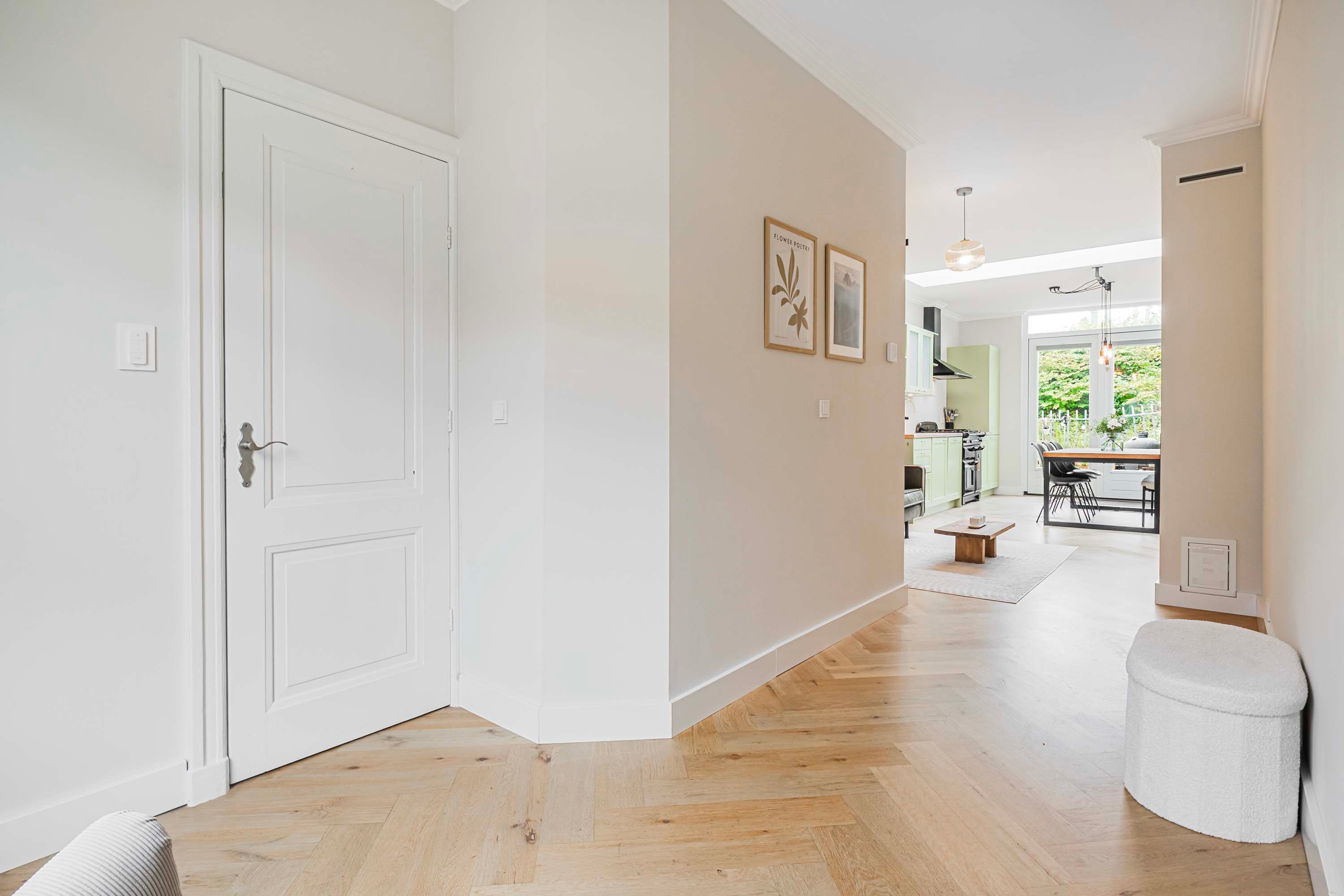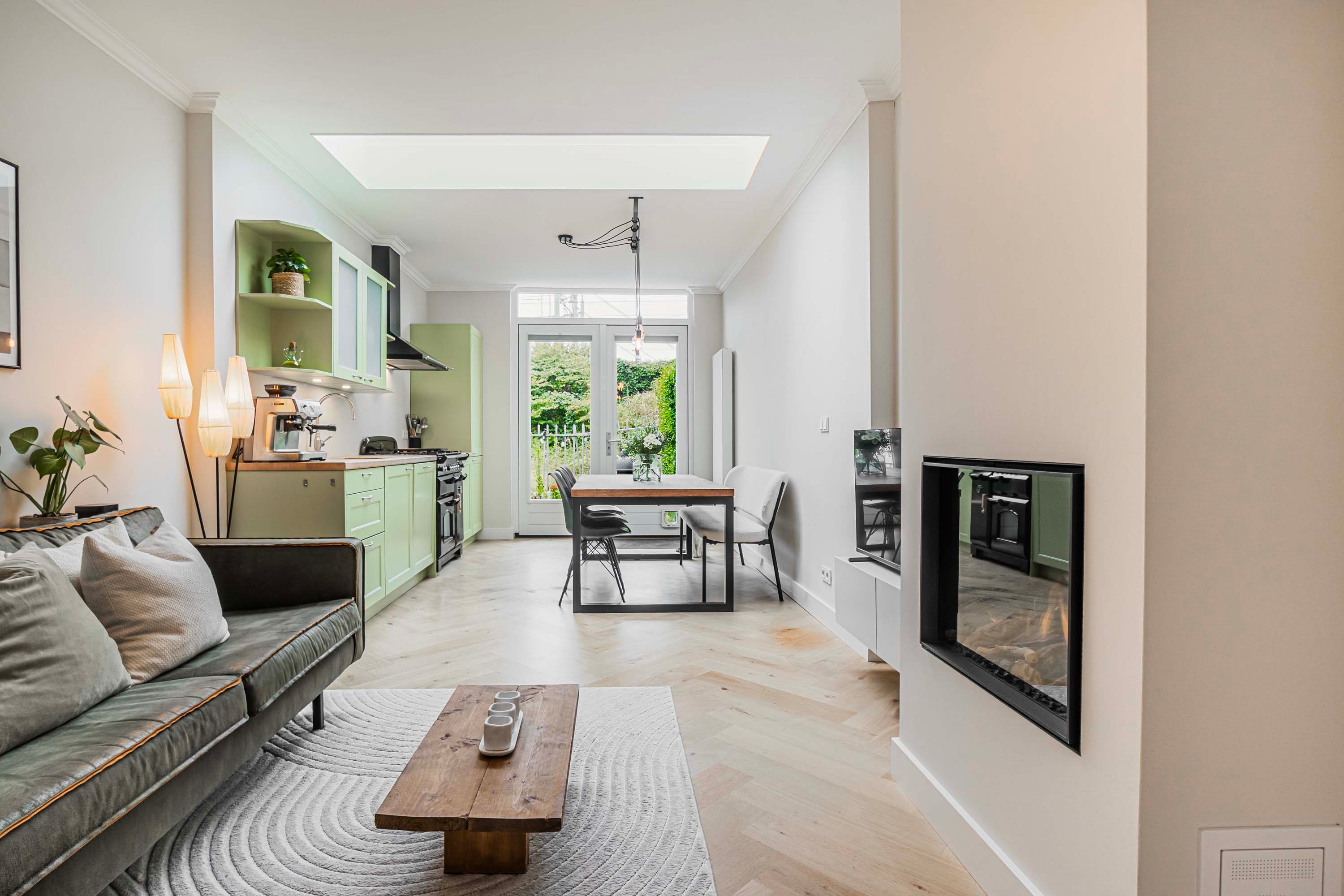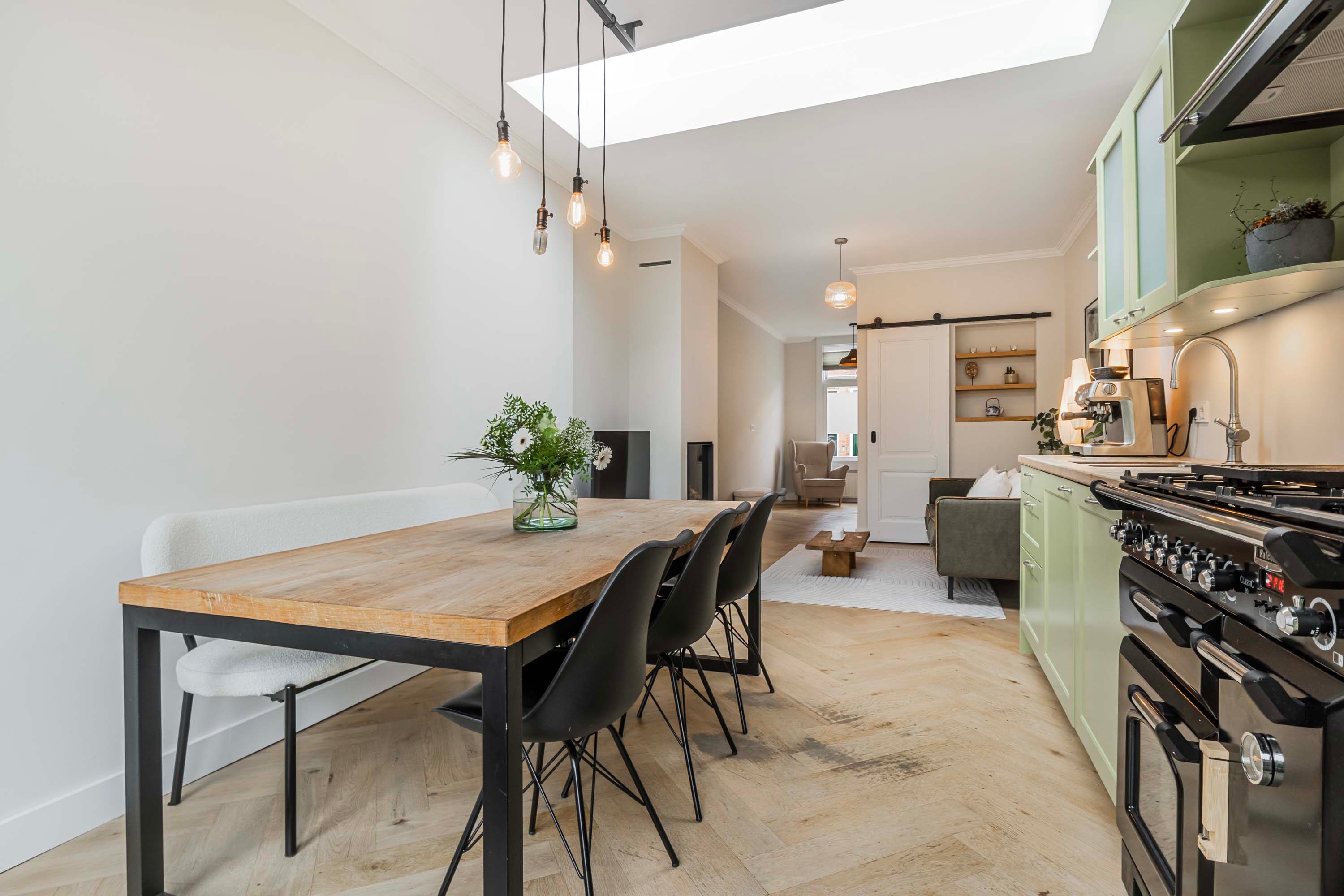 Bij binnenkomst valt meteen de warme uitstraling van de woning op. De begane grond is voorzien van een visgraat gelegde eiken parketvloer die in 2024 professioneel geïsoleerd is, wat niet alleen comfort biedt maar ook bijdraagt aan de energiezuinigheid van het huis. De lichte, uitgebouwde woonkamer is een heerlijke plek om te ontspannen, mede dankzij de sfeervolle gashaard en de ruime bergkast die slim is weggewerkt. De open keuken sluit naadloos aan en is uitgerust met alle benodigde inbouwapparatuur, waaronder een vrijstaande oven met 4-pits gasfornuis, een afzuigkap, vaatwasser en een koel-/vriescombinatie. Openslaande deuren geven toegang tot de zonnige achtertuin, gelegen op het zuidwesten — perfect voor lange zomeravonden met een goed glas wijn.
