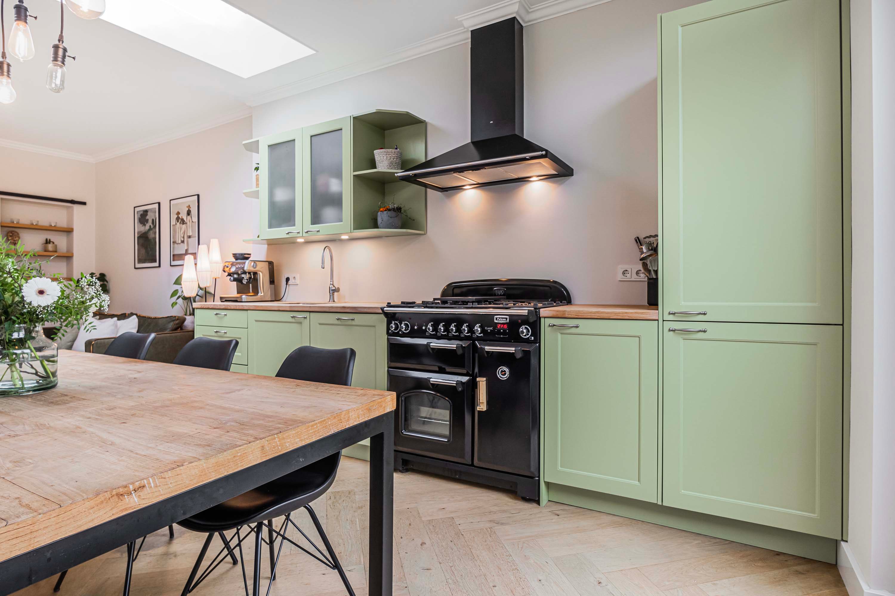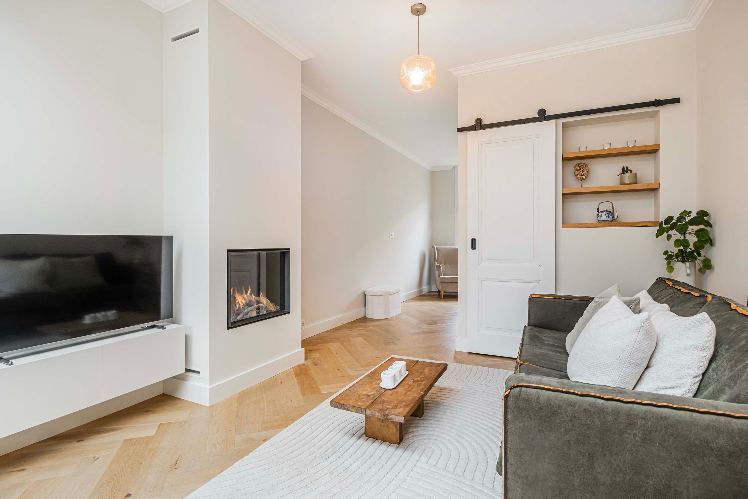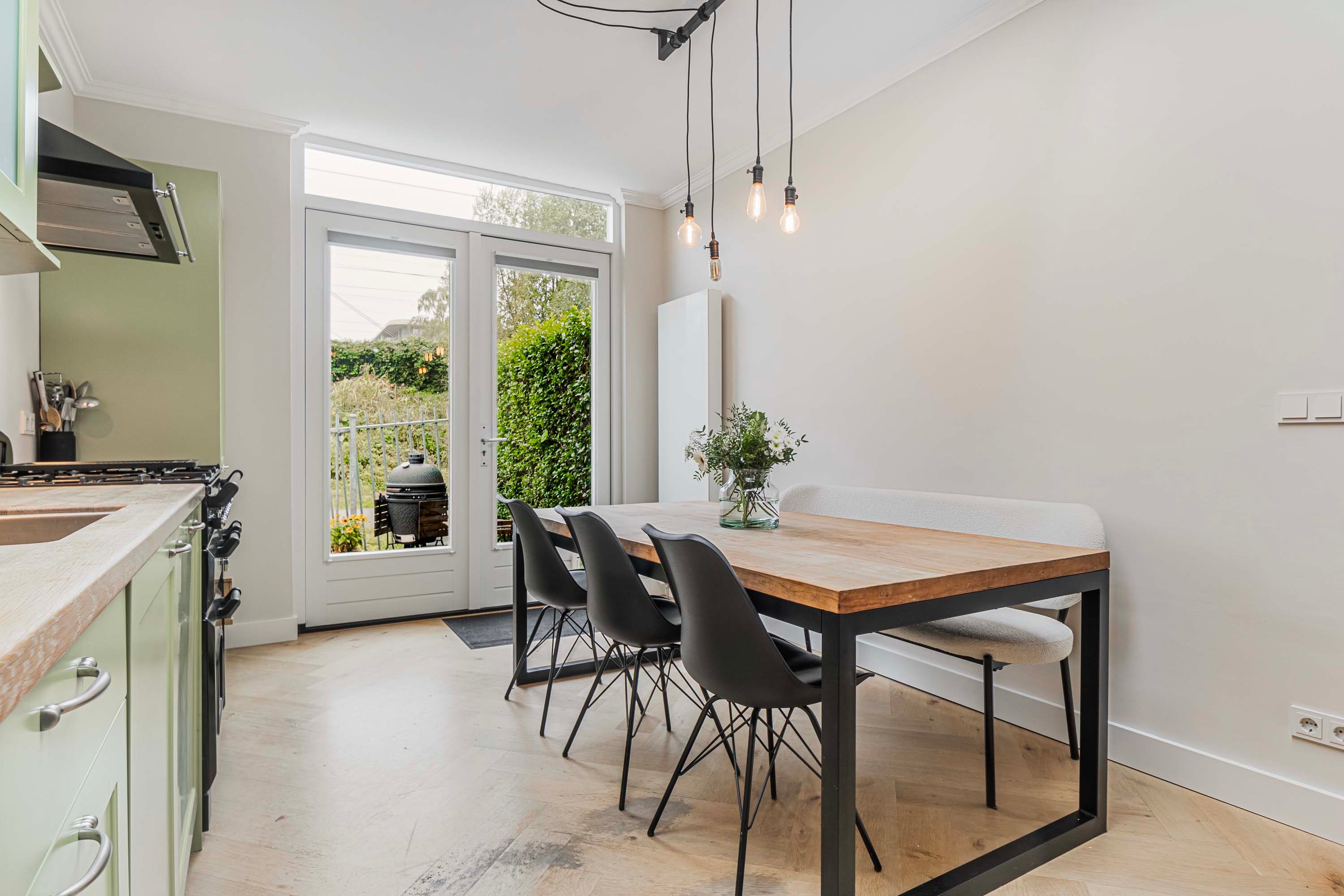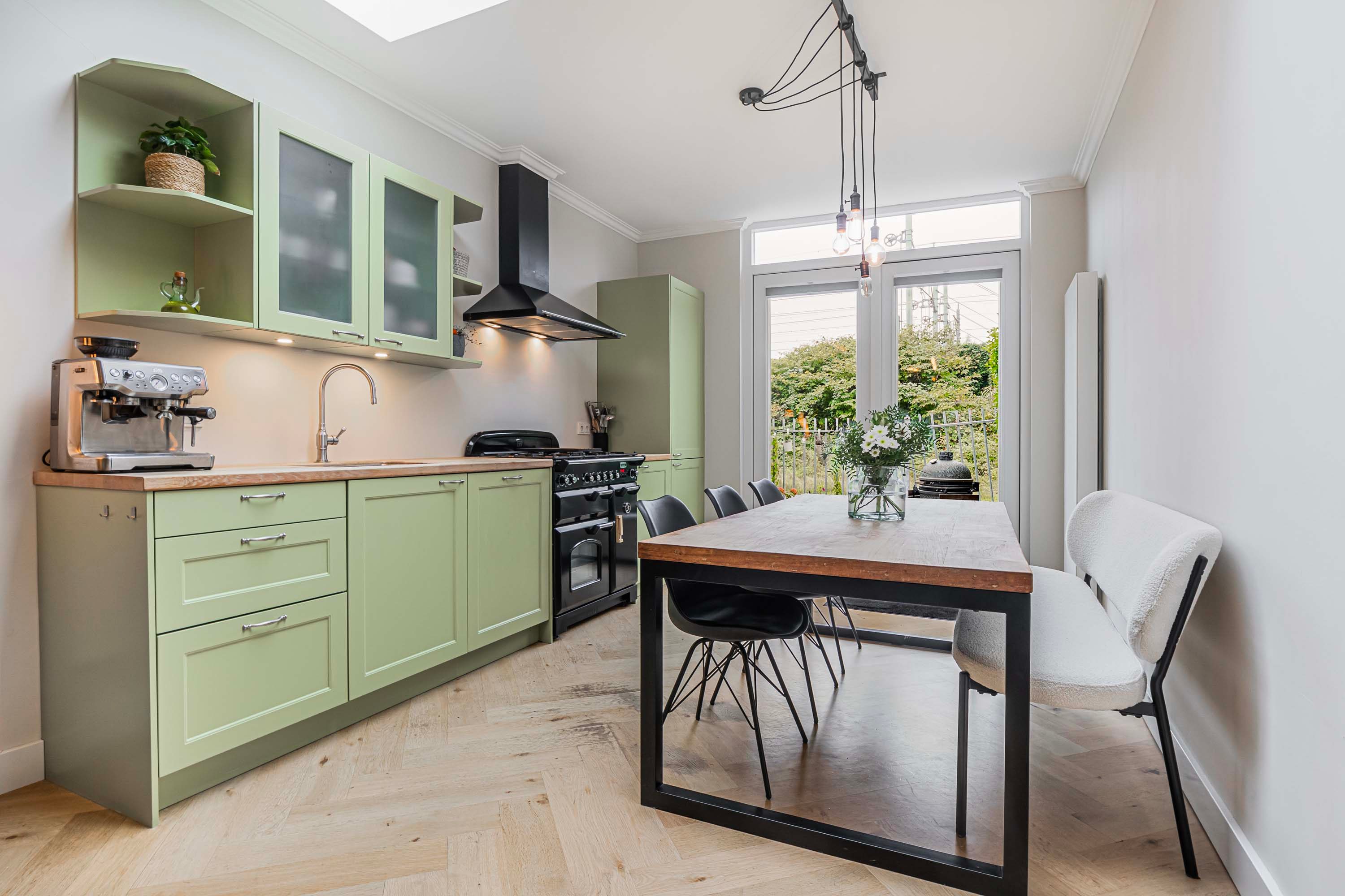 Bij binnenkomst valt meteen de warme uitstraling van de woning op. De begane grond is voorzien van een visgraat gelegde eiken parketvloer die in 2024 professioneel geïsoleerd is, wat niet alleen comfort biedt maar ook bijdraagt aan de energiezuinigheid van het huis. De lichte, uitgebouwde woonkamer is een heerlijke plek om te ontspannen, mede dankzij de sfeervolle gashaard en de ruime bergkast die slim is weggewerkt. De open keuken sluit naadloos aan en is uitgerust met alle benodigde inbouwapparatuur, waaronder een vrijstaande oven met 4-pits gasfornuis, een afzuigkap, vaatwasser en een koel-/vriescombinatie. Openslaande deuren geven toegang tot de zonnige achtertuin, gelegen op het zuidwesten — perfect voor lange zomeravonden met een goed glas wijn.