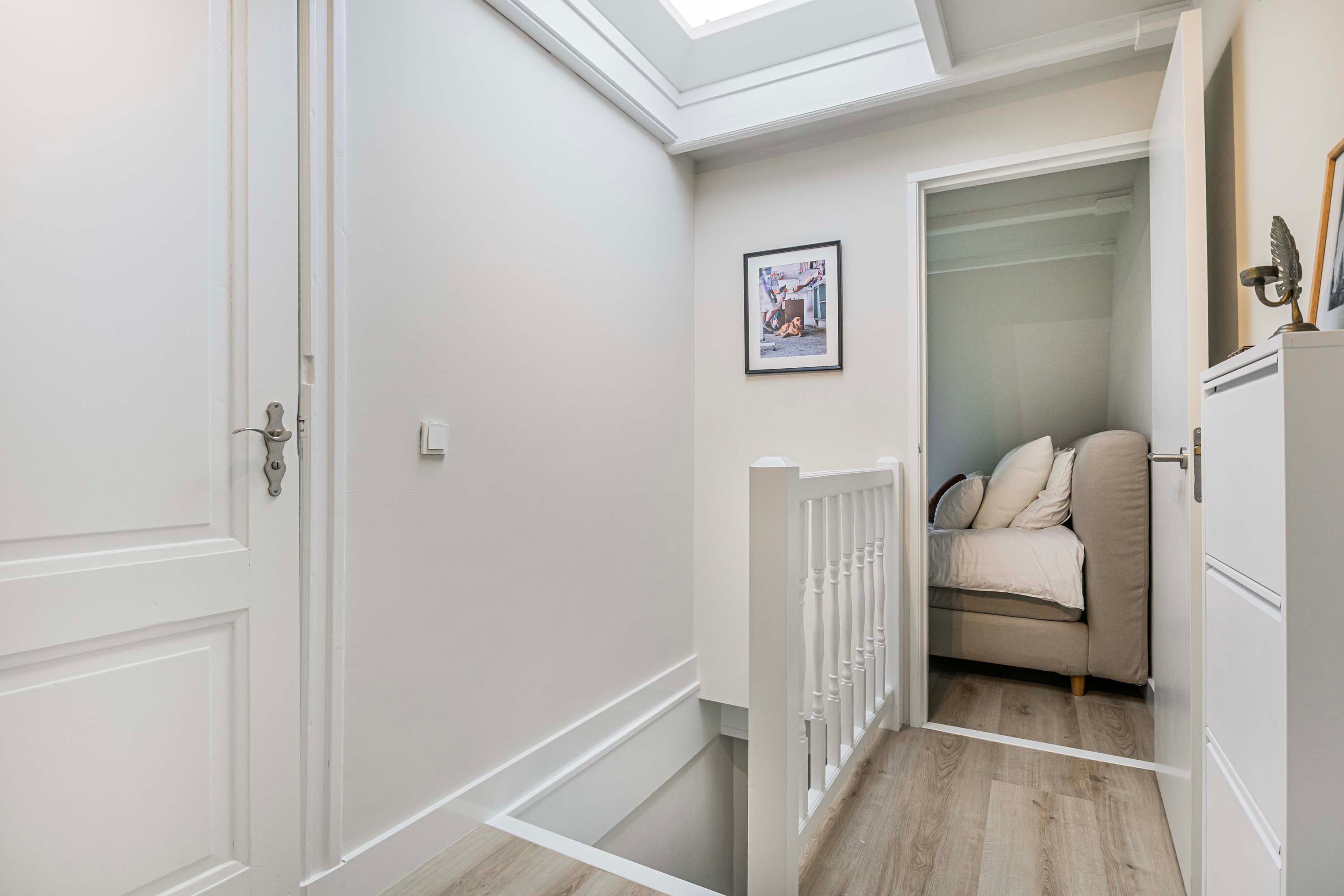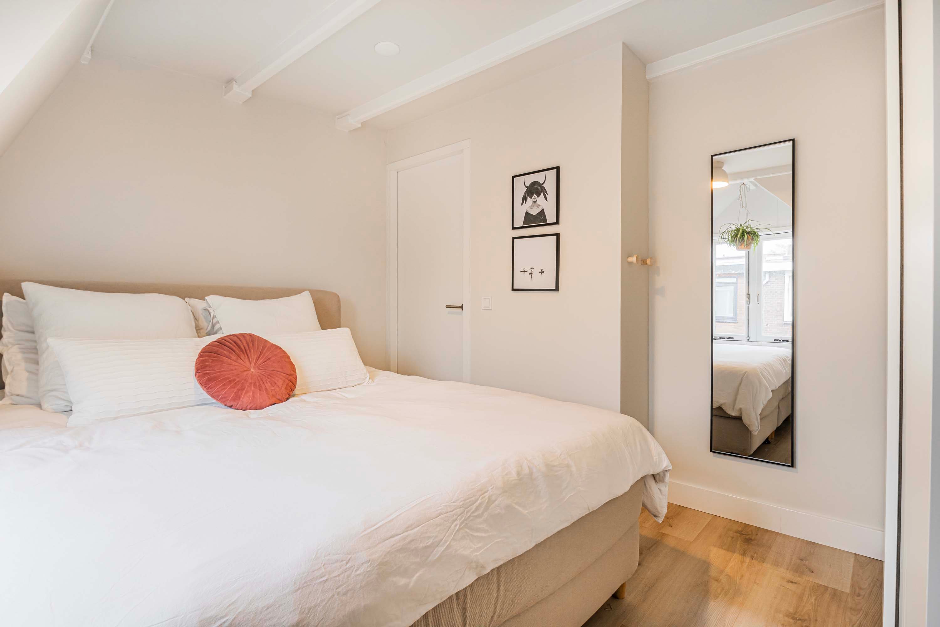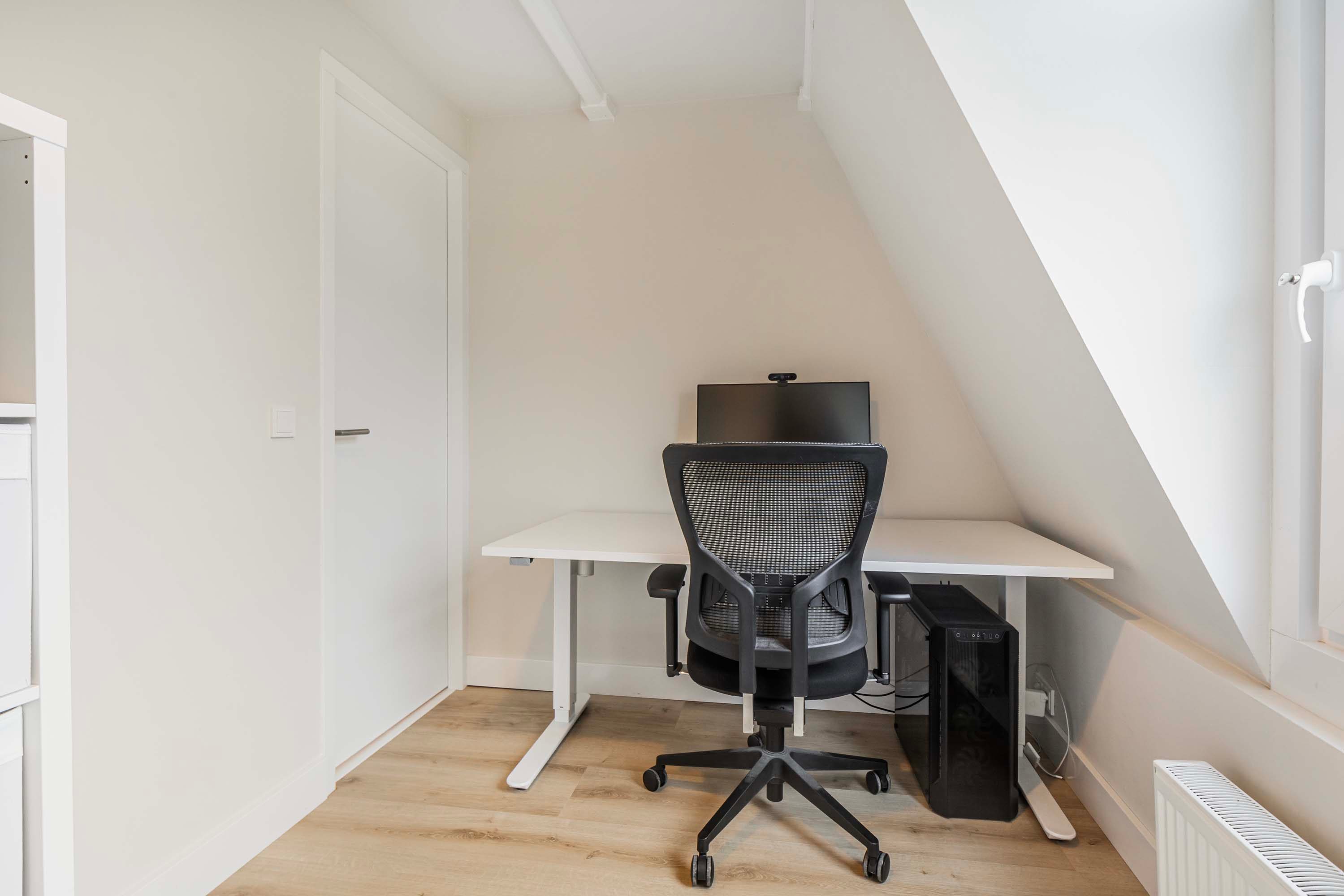 Op de eerste verdieping vind je twee slaapkamers, waarvan één is voorzien van een op maat gemaakte kastenwand waarin de wasmachineaansluiting en moderne CV-ketel (Nefit Proline HR 30 CW 50 uit 2019) fraai is weggewerkt. De volledig betegelde badkamer is een oase van licht en rust, met een toilet, douche, wastafelmeubel en een prachtige lichtstraat die zorgt voor een natuurlijke lichtinval.