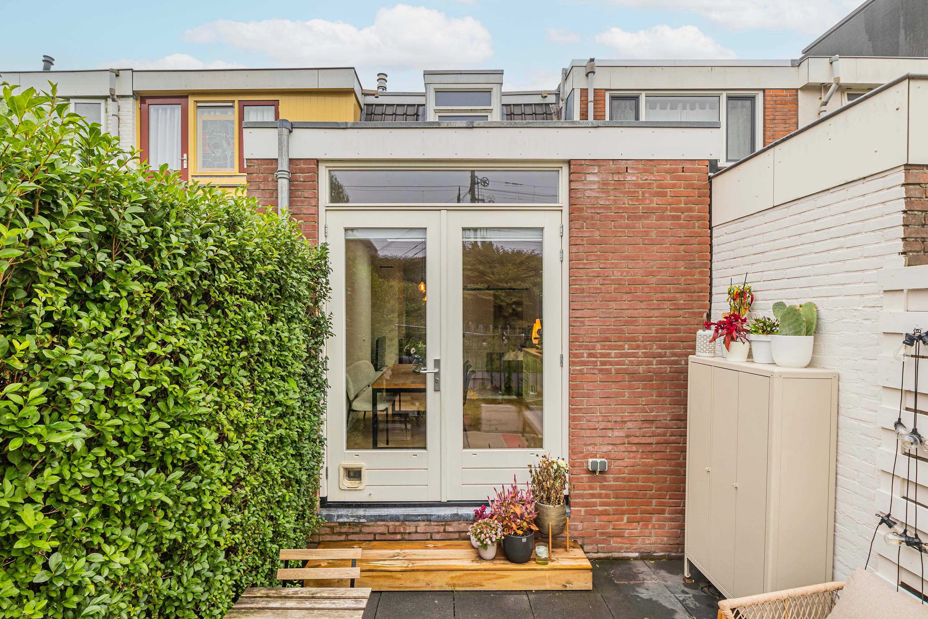 De achtertuin is volledig bestraat en ligt op het zuidwesten, de tuin biedt volop zon en ruimte voor een gezellig zitje.
