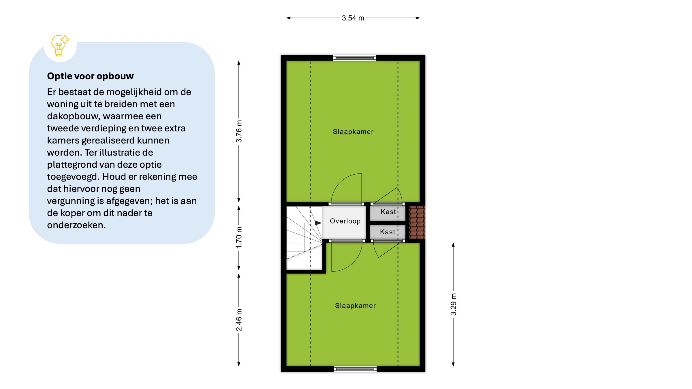 Er bestaat de mogelijkheid om de woning uit te breiden met een dakopbouw, waarmee een tweede verdieping en twee extra kamers gerealiseerd kunnen worden. Ter illustratie is een plattegrond van deze optie toegevoegd. Houd er rekening mee dat hiervoor nog geen vergunning is afgegeven; het is aan de koper om dit nader te onderzoeken.