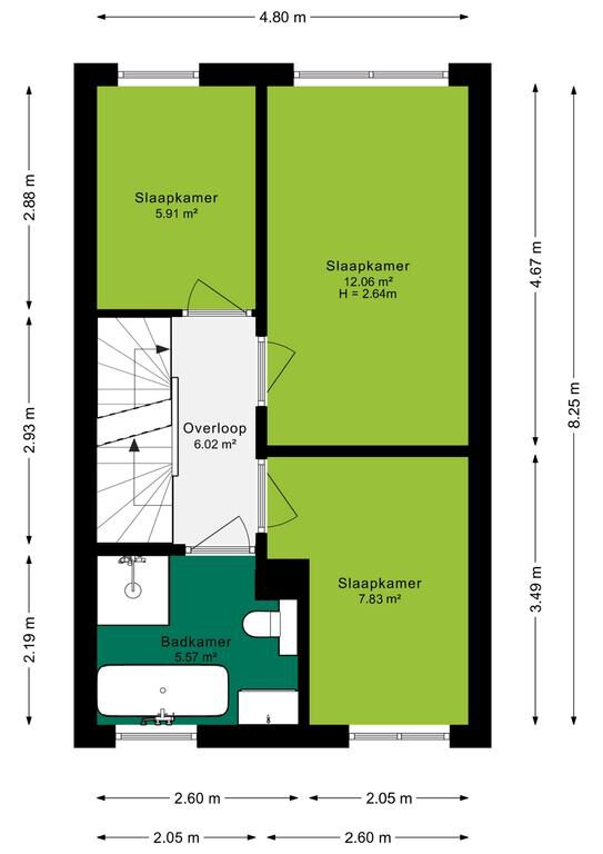 Via de vaste trap kom je bij de overloop met toegang tot drie slaapkamers en de badkamer. Twee slaapkamers zijn gelegen aan de achterzijde van de woning en zijn circa 6 en 12 m². De derde slaapkamer en de badkamer zijn aan de voorzijde gesitueerd. De badkamer is neutraal en in lichte tinten uitgevoerd. Aanwezig is een wastafel met bergmeubel, 2e toilet, een ligbad, een ruime inloopdouche en een te openen raam voor de gewenste natuurlijke ventilatie.