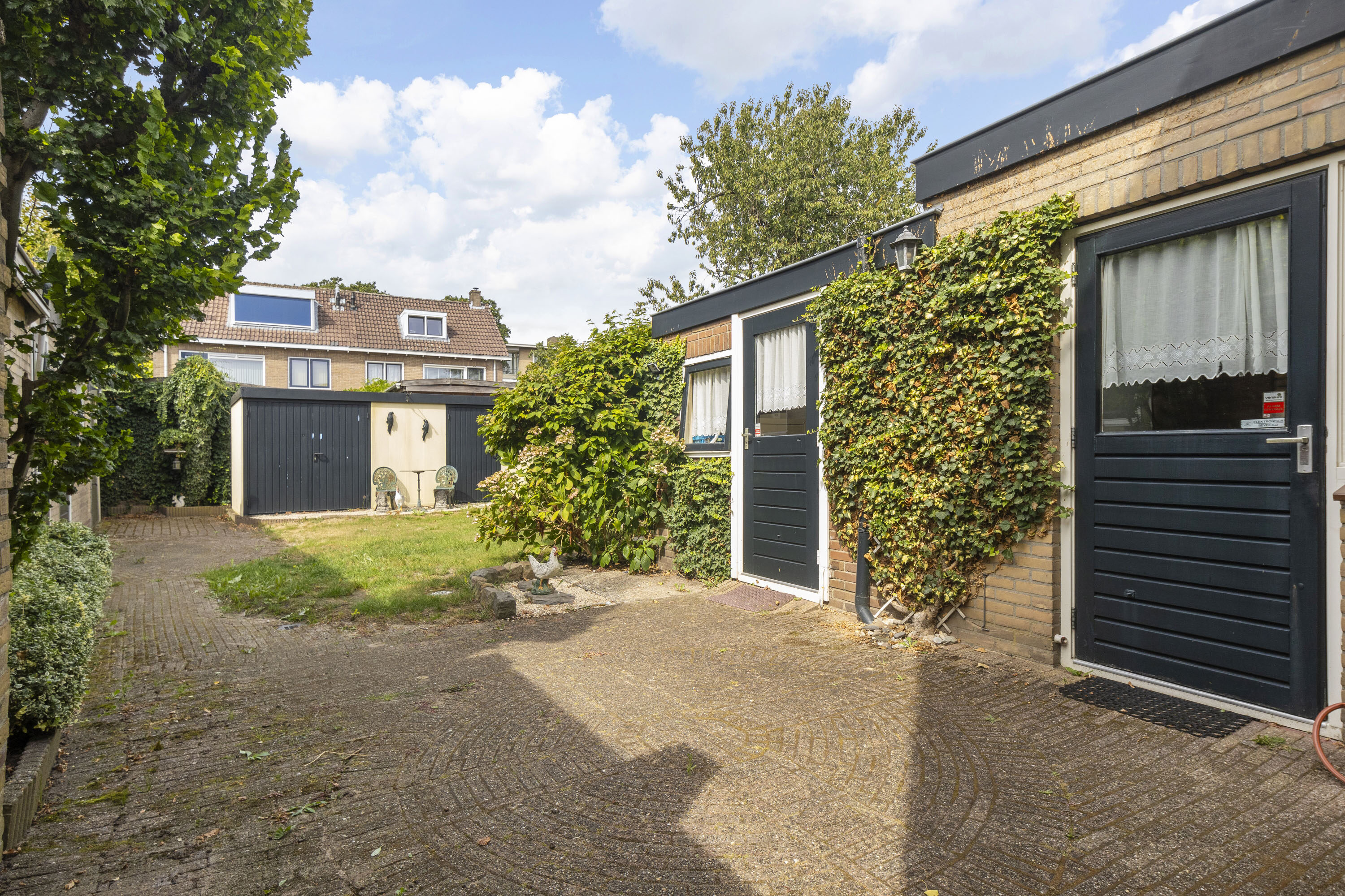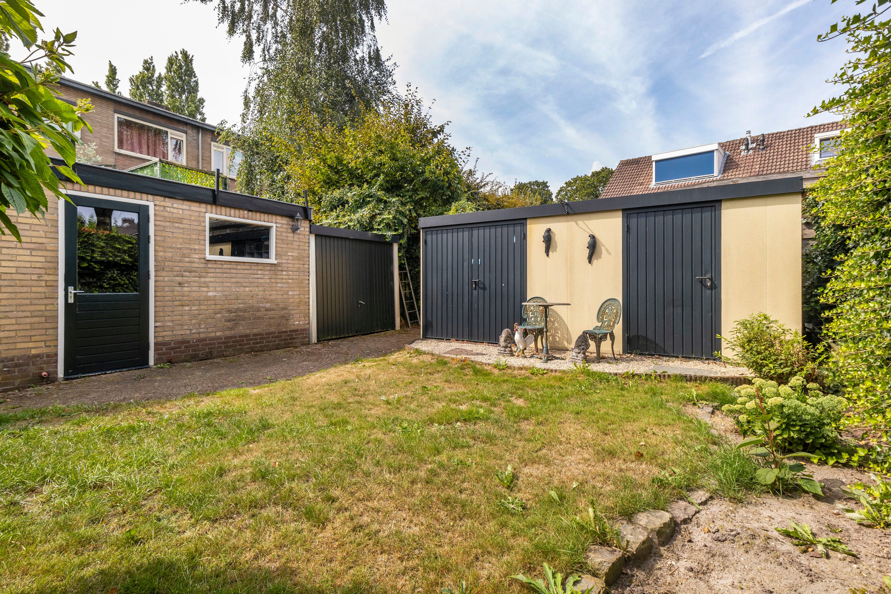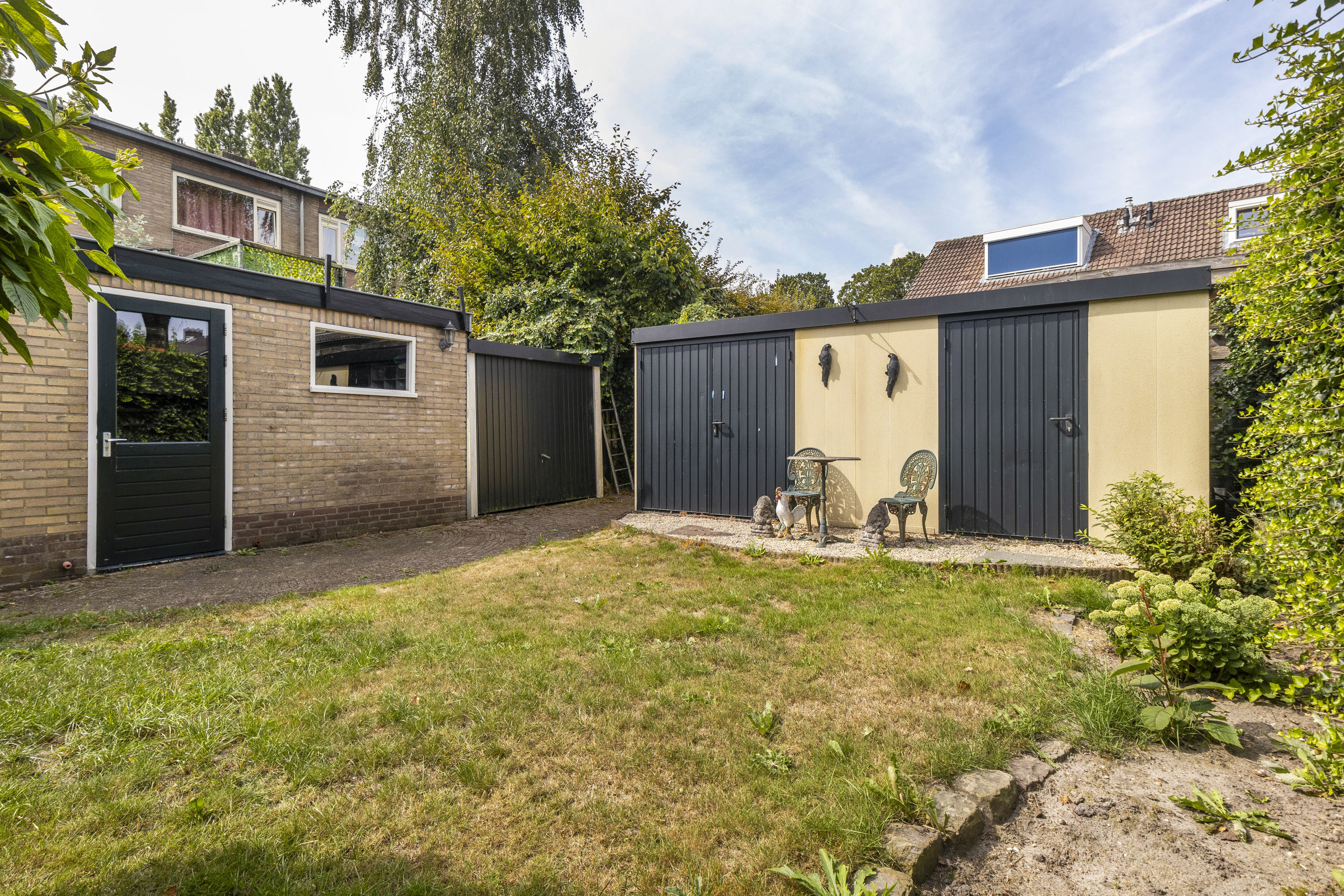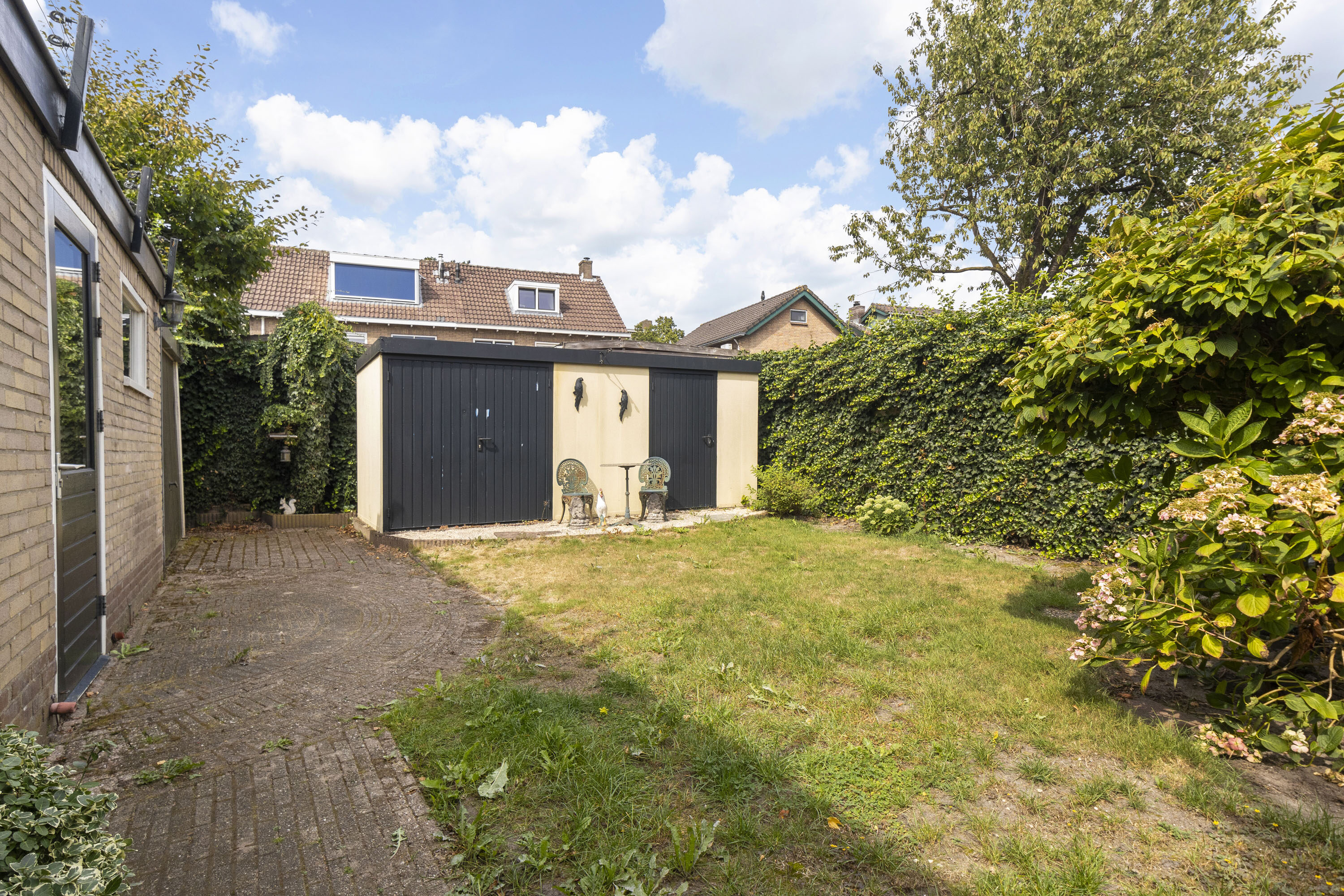 Een riante diepe en brede achtertuin en gelegen op het westen. Een ideale combinatie om van vele zonuren te genieten. Er is tevens meer dan voldoende ruimte voor kinderen om heerlijk te spelen. De tuin verleent toegang tot de garage en meerdere bijgebouwen/bergingen—ideaal voor extra opslag of het uitoefenen van een hobby.
