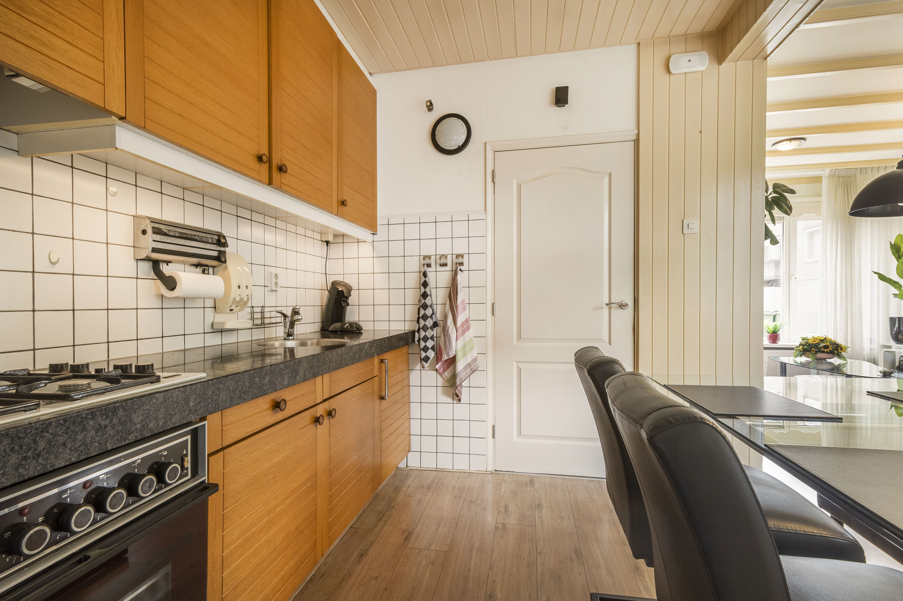 Via de entree, waar het toilet, de trapopgang naar de 1e verdieping en de meterkast zich bevinden, kom je in de lichte woonkamer met royale raampartijen (kunststof kozijnen met HR++ beglazing) aan zowel de voorkant, zijkant als achterkant. Er is plek voor een ruime hoekbank en een gezellig zithoek. Aansluitend vind je het eetgedeelte met de keuken, voorzien van inbouwapparatuur zoals o.a. een kookplaat met afzuigkap, een oven en een koelkast. Vanuit de keuken loop je door naar de bijkeuken met ruimte voor opbergkasten om vervolgens naar de achtergelegen 2e bijkeuken/berging met aansluitingen voor wasmachine en/of droger.