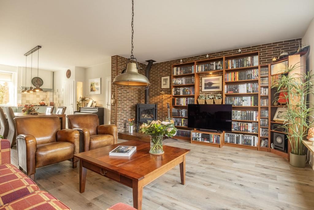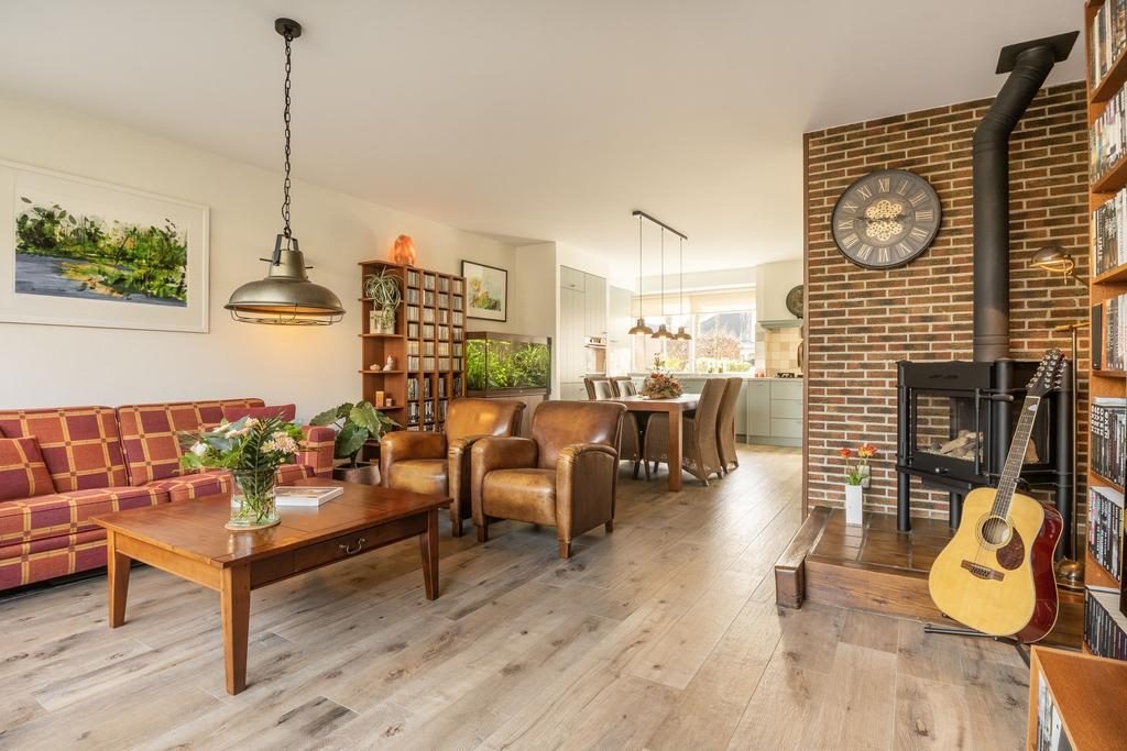 De woonkamer grond is voorzien van een houtlook tegelvloer met vloerverwarming.