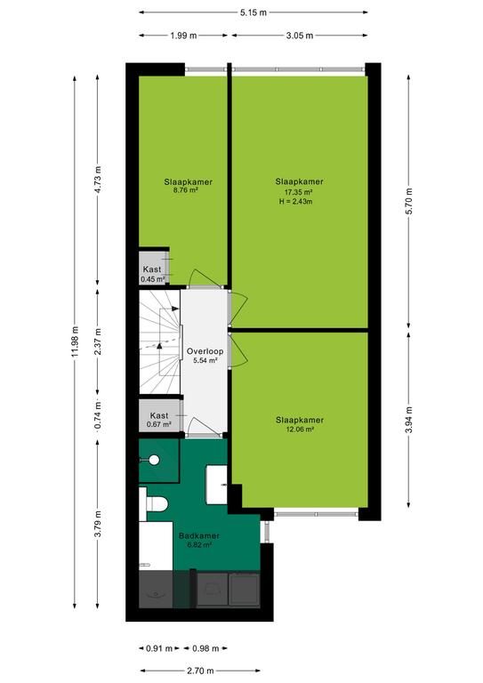 Via de vaste trap bereik je de 1e verdieping. Hier zie je wederom dat de woning zeer ruim is. Een ruime overloop bied je toegang tot 3 slaapkamers, de badkamer en de vaste trap naar de 2e verdieping. De 3 slaapkamers zijn met 17, 12 en 9m² van een zeer prettig formaat. Slaapkamers 1 en 2 zijn gelegen aan de achterzijde van de woning en de 3e slaapkamer is samen met de badkamer gelegen aan de voorzijde van de woning.
