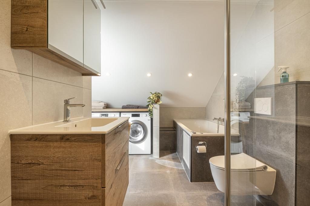 De badkamer is de absolute eyecatcher van het huis. In september 2024 volledig vernieuwd waarbij niet is bezuinigd op kwaliteit of luxe. Zo is de ruime badkamer o.a. voorzien van een 2e toilet, een inloopdouche met regendouchekop, een wastafelmeubel met enkele wastafel en een ligbad met whirlpool. Tevens bevinden zich in de badkamer aansluitingen voor de wasmachine en droger.