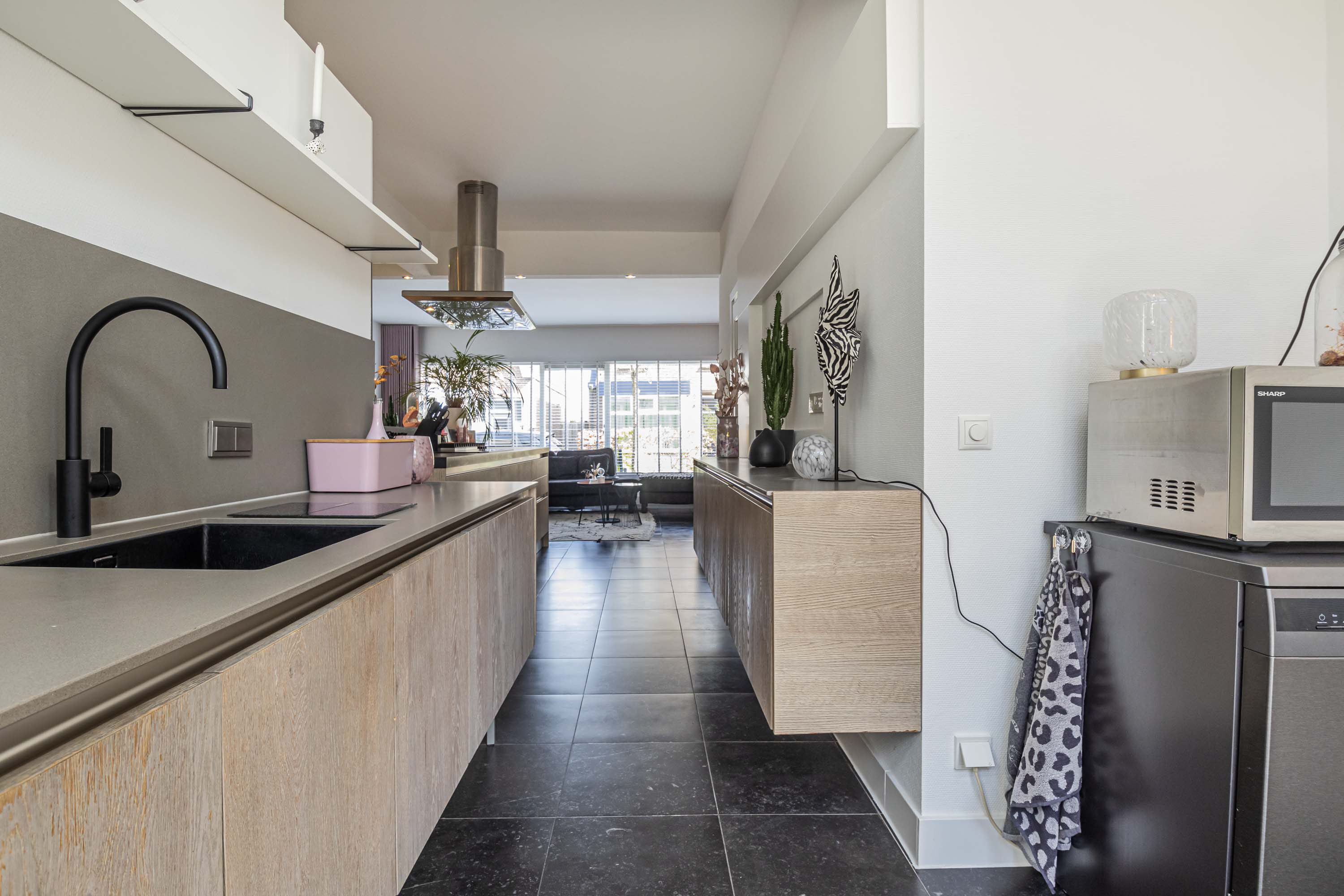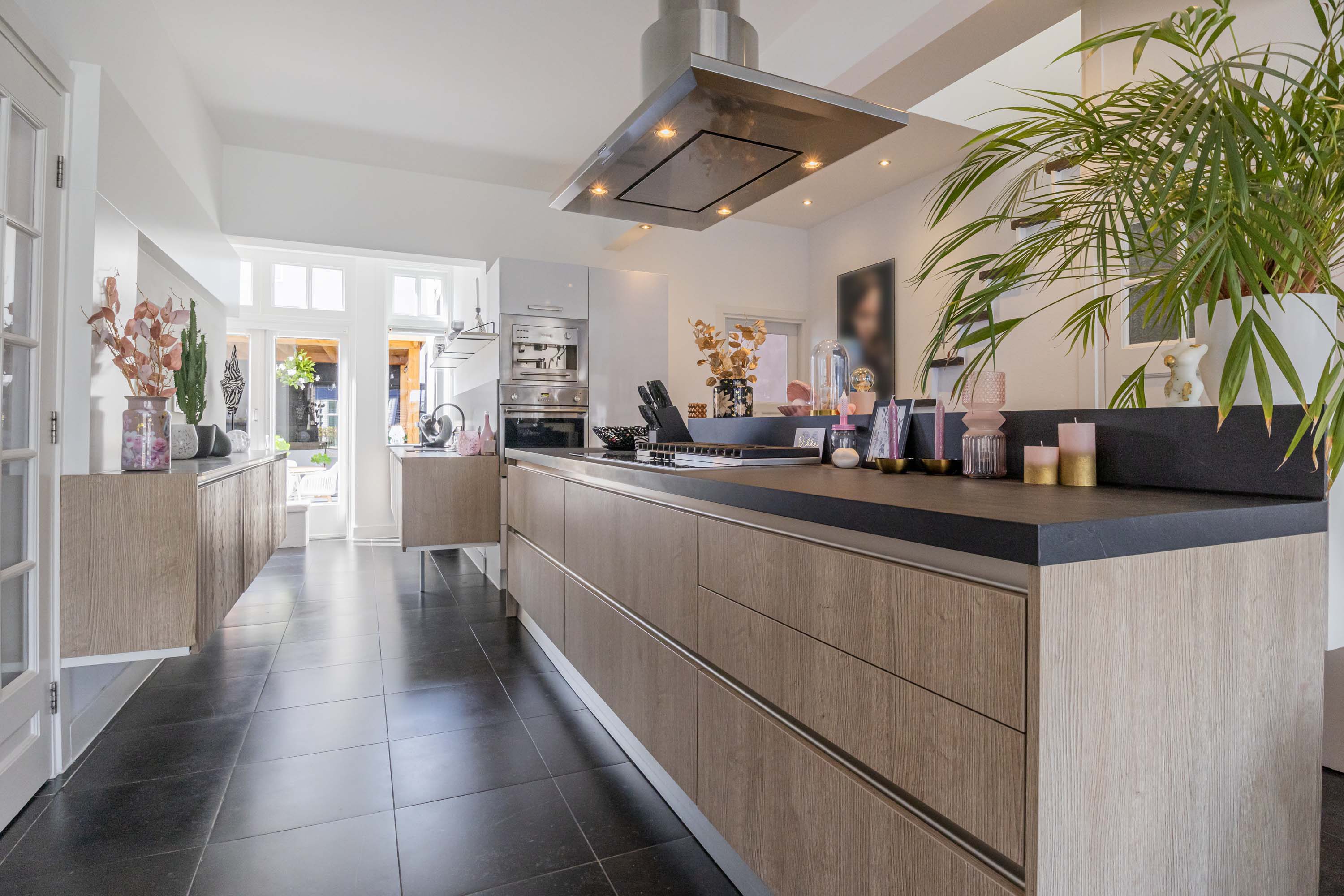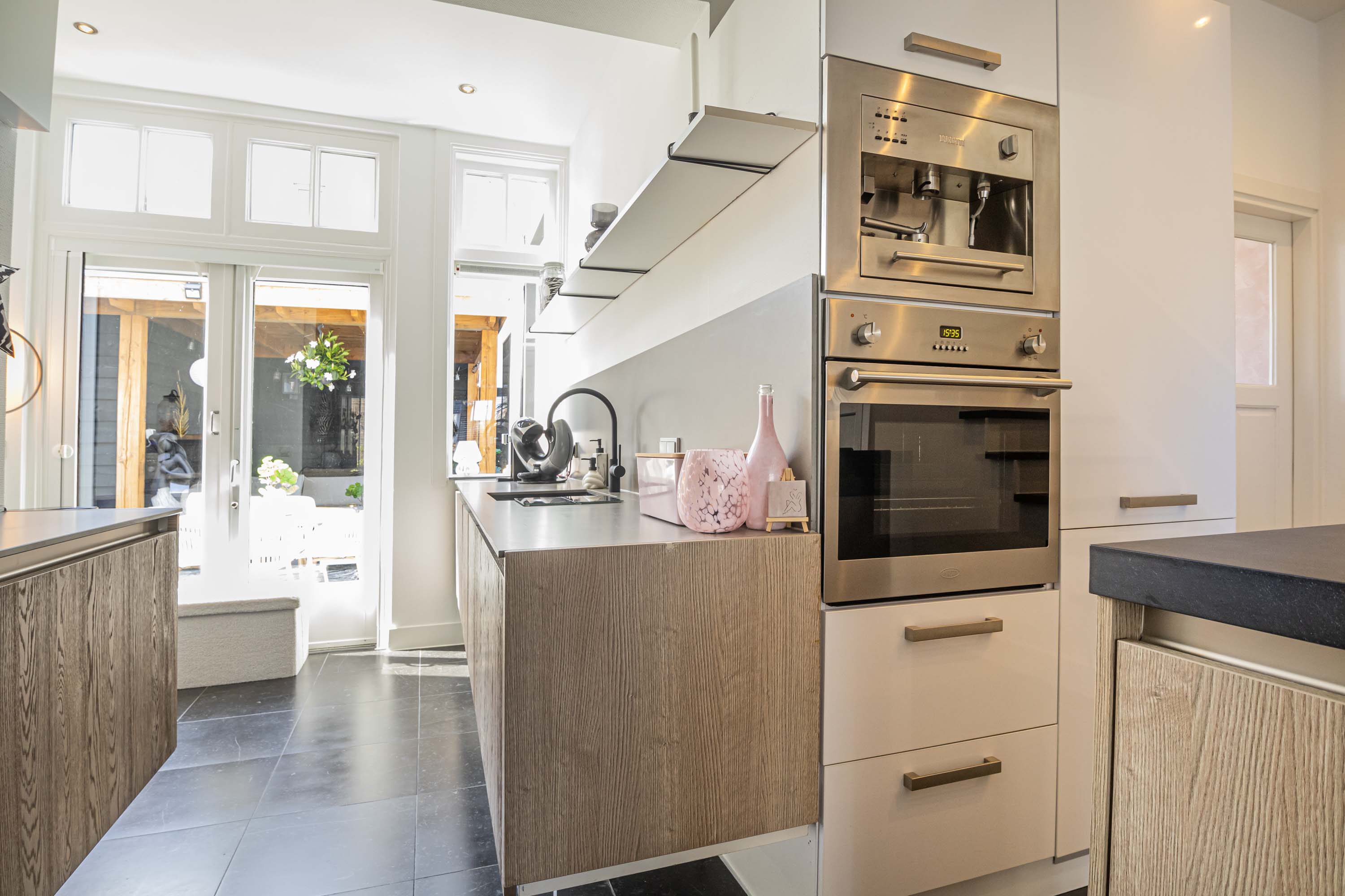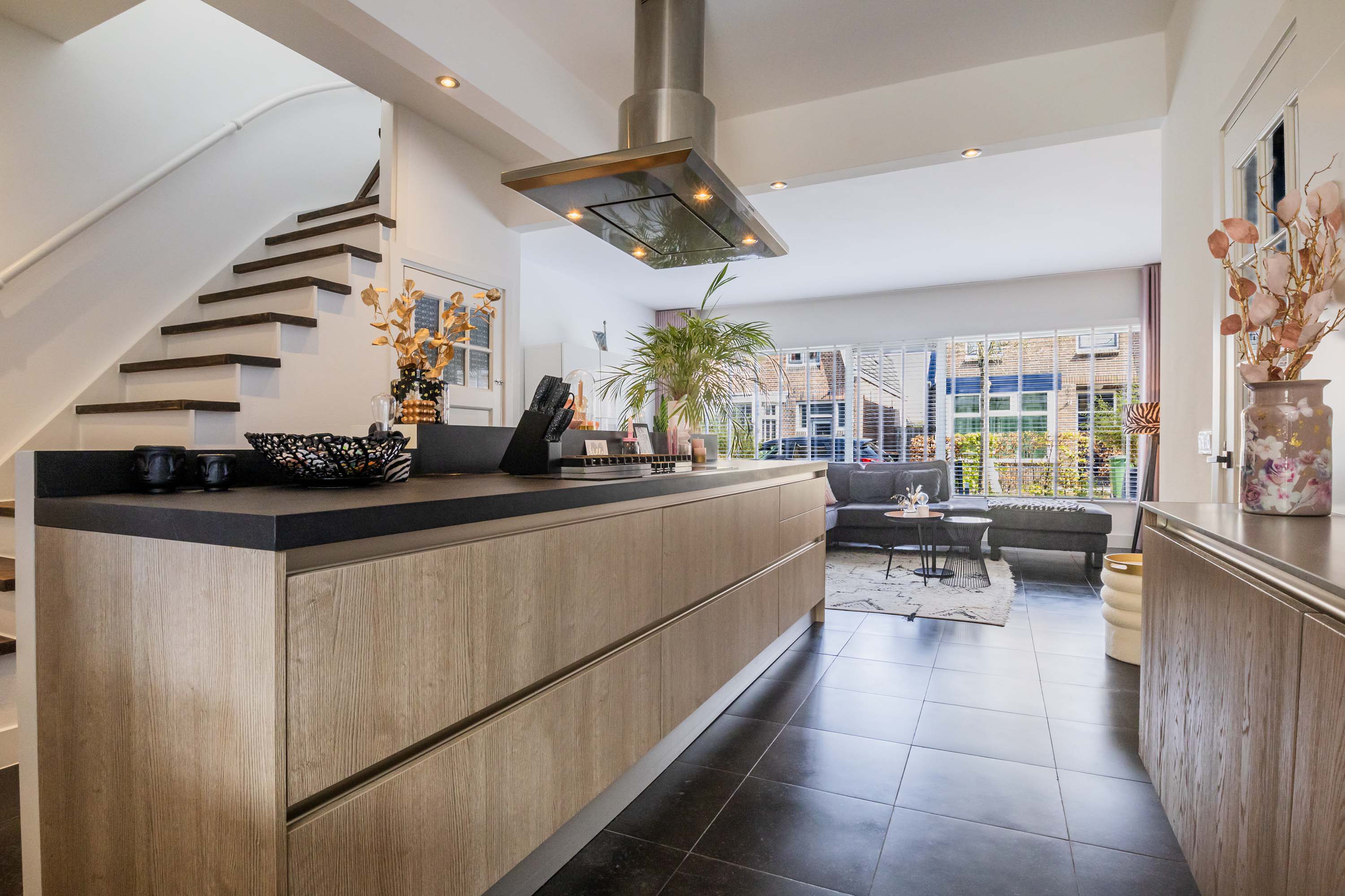 Aan de zijkant van de woning bevindt zich de entree, waar je binnenkomt in de hal met direct toegang tot het toilet. Loop je verder, dan kom je in de stijlvolle keuken waar een prachtig kookeiland centraal staat. Deze keuken loopt door tot aan de openslaande deuren naar de tuin, waardoor je tijdens het koken niet alleen geniet van het uitzicht op buiten, maar ook gezellig in contact blijft met iedereen in de woonkamer. Het kookeiland en de open indeling maken deze keuken echt het kloppende hart van het huis.