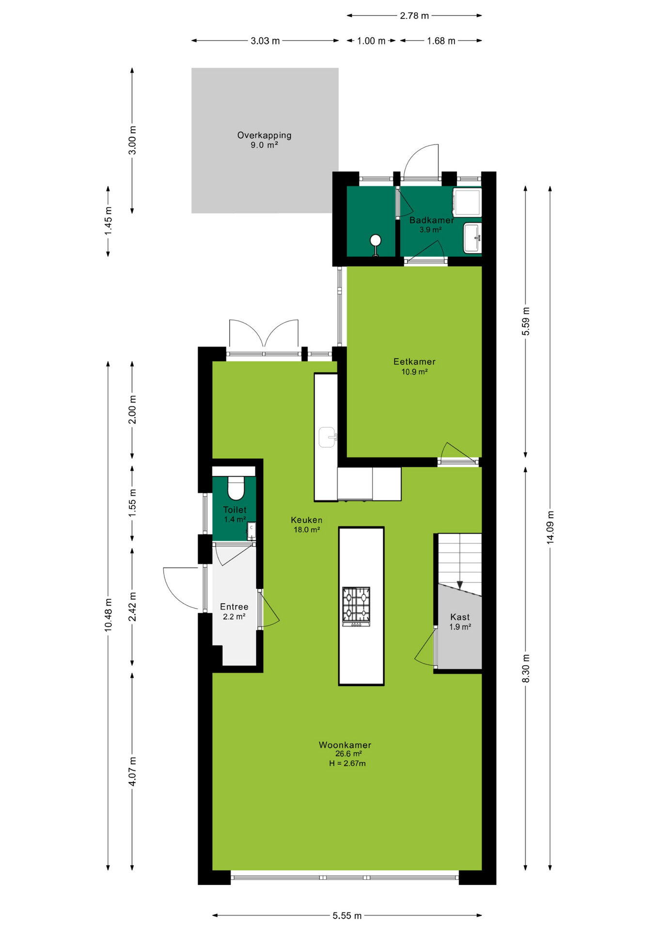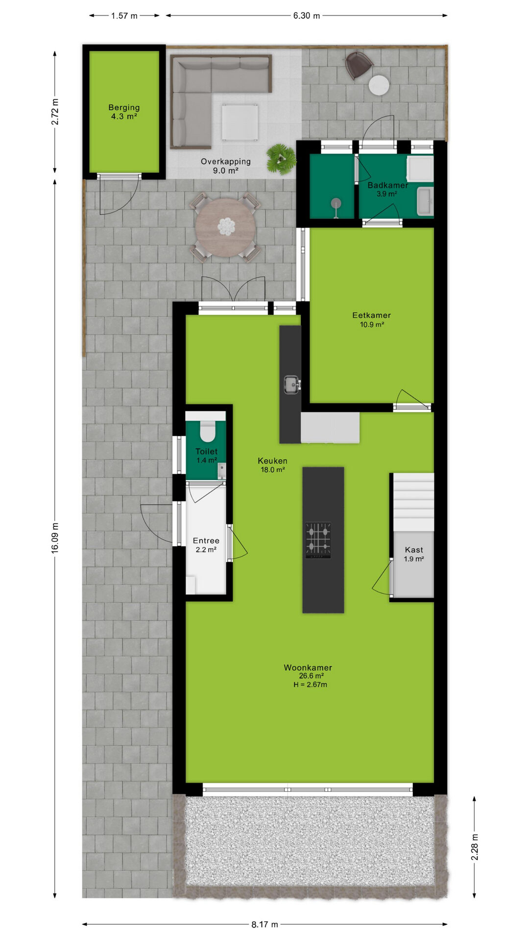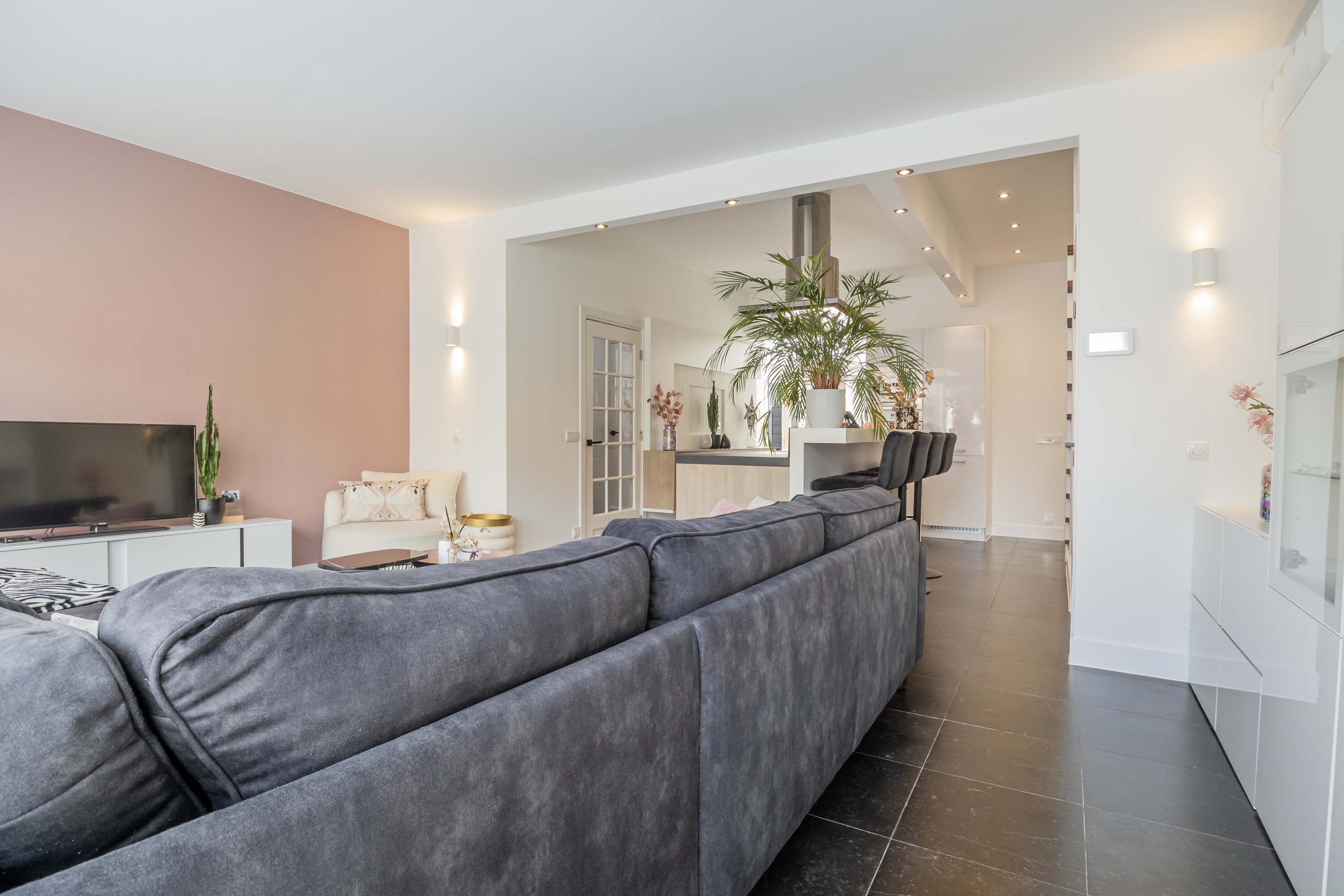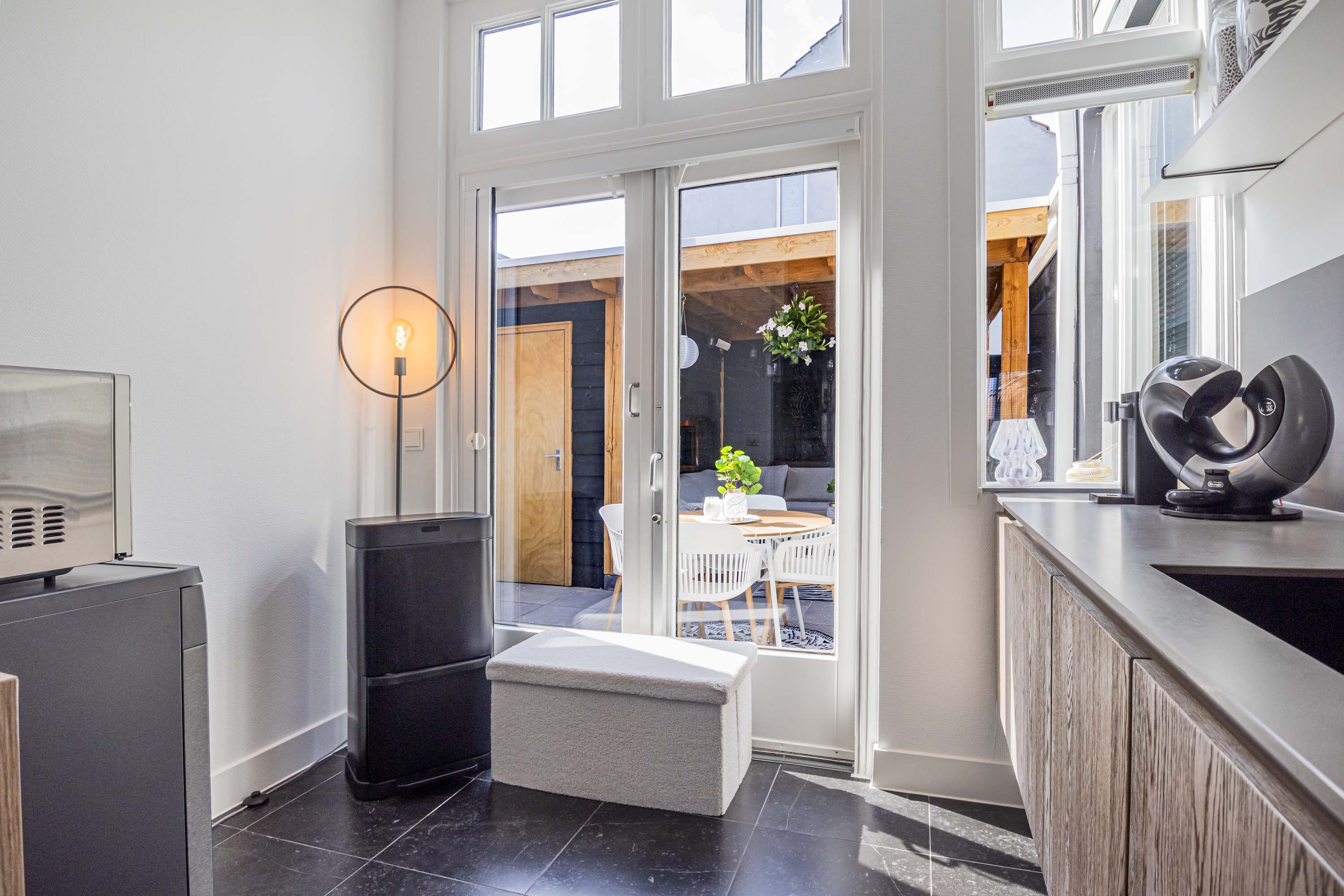 Aan de zijkant van de woning bevindt zich de entree, waar je binnenkomt in de hal met direct toegang tot het toilet. Loop je verder, dan kom je in de stijlvolle keuken waar een prachtig kookeiland centraal staat. Deze keuken loopt door tot aan de openslaande deuren naar de tuin, waardoor je tijdens het koken niet alleen geniet van het uitzicht op buiten, maar ook gezellig in contact blijft met iedereen in de woonkamer. Het kookeiland en de open indeling maken deze keuken echt het kloppende hart van het huis.