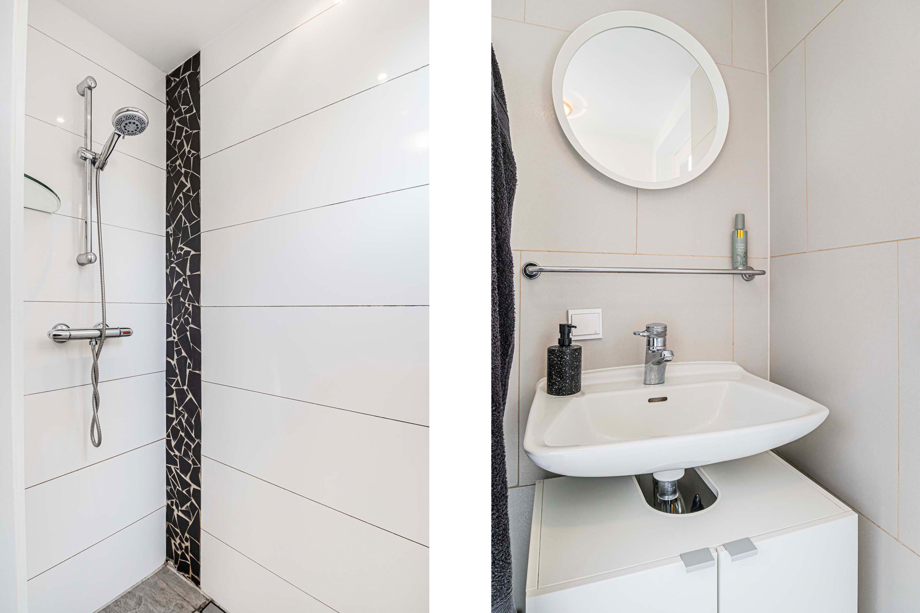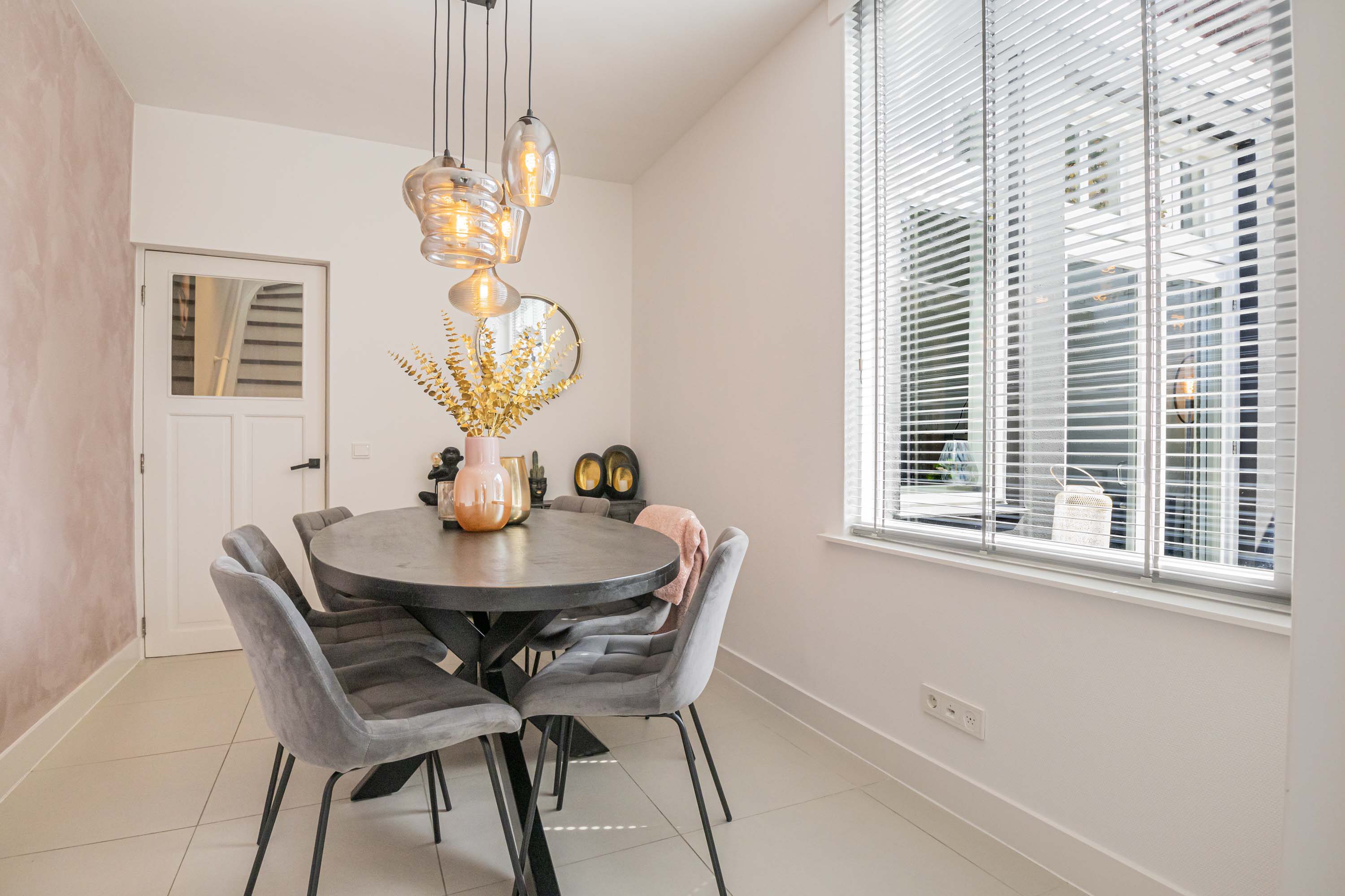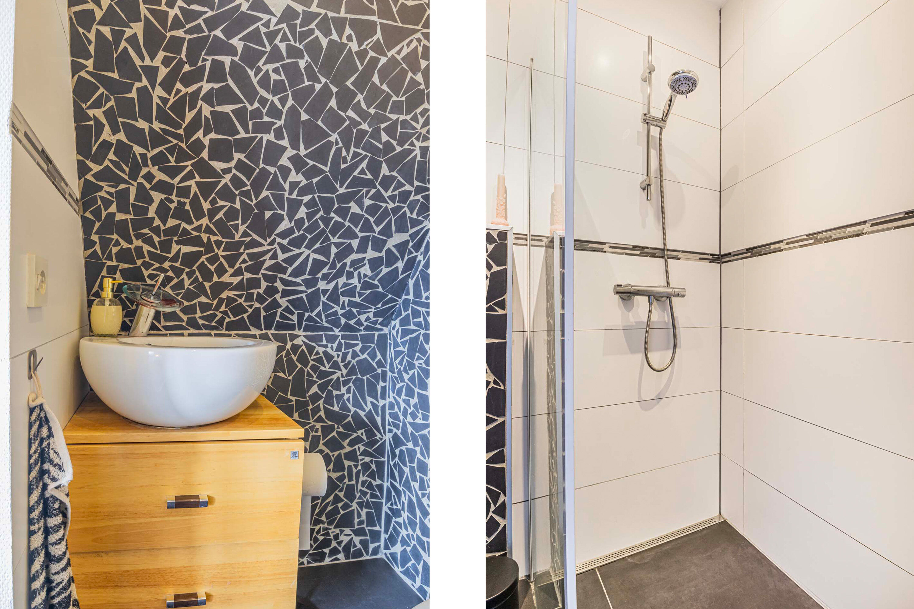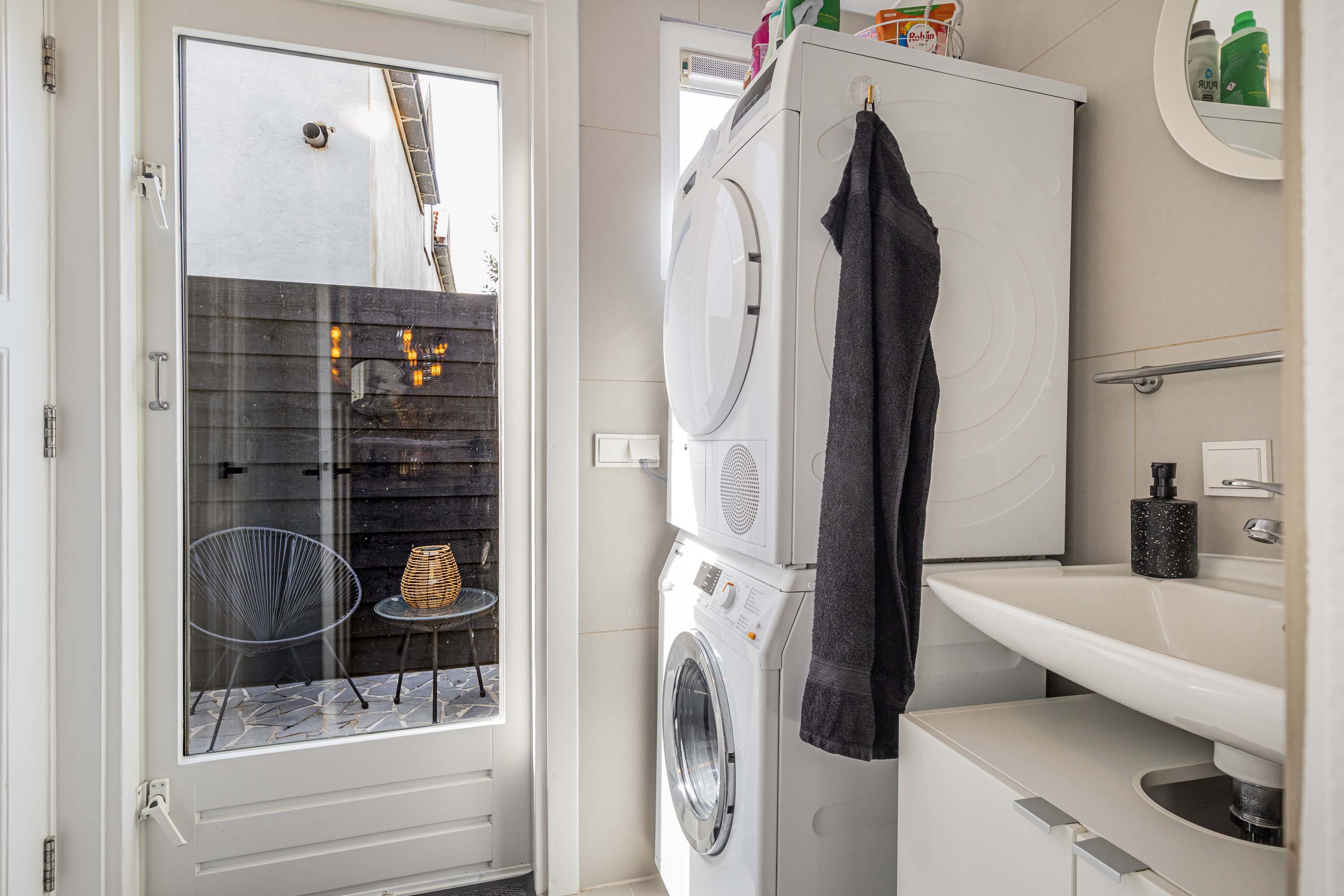 De eetkamer bereik je eenvoudig via een deur vanuit de keuken. Een perfecte plek om uitgebreid te tafelen terwijl je geniet van het uitzicht op de tuin. Loop je nog een deur verder, dan kom je in de badkamer, waar zich ook de aansluiting voor de wasmachine bevindt.