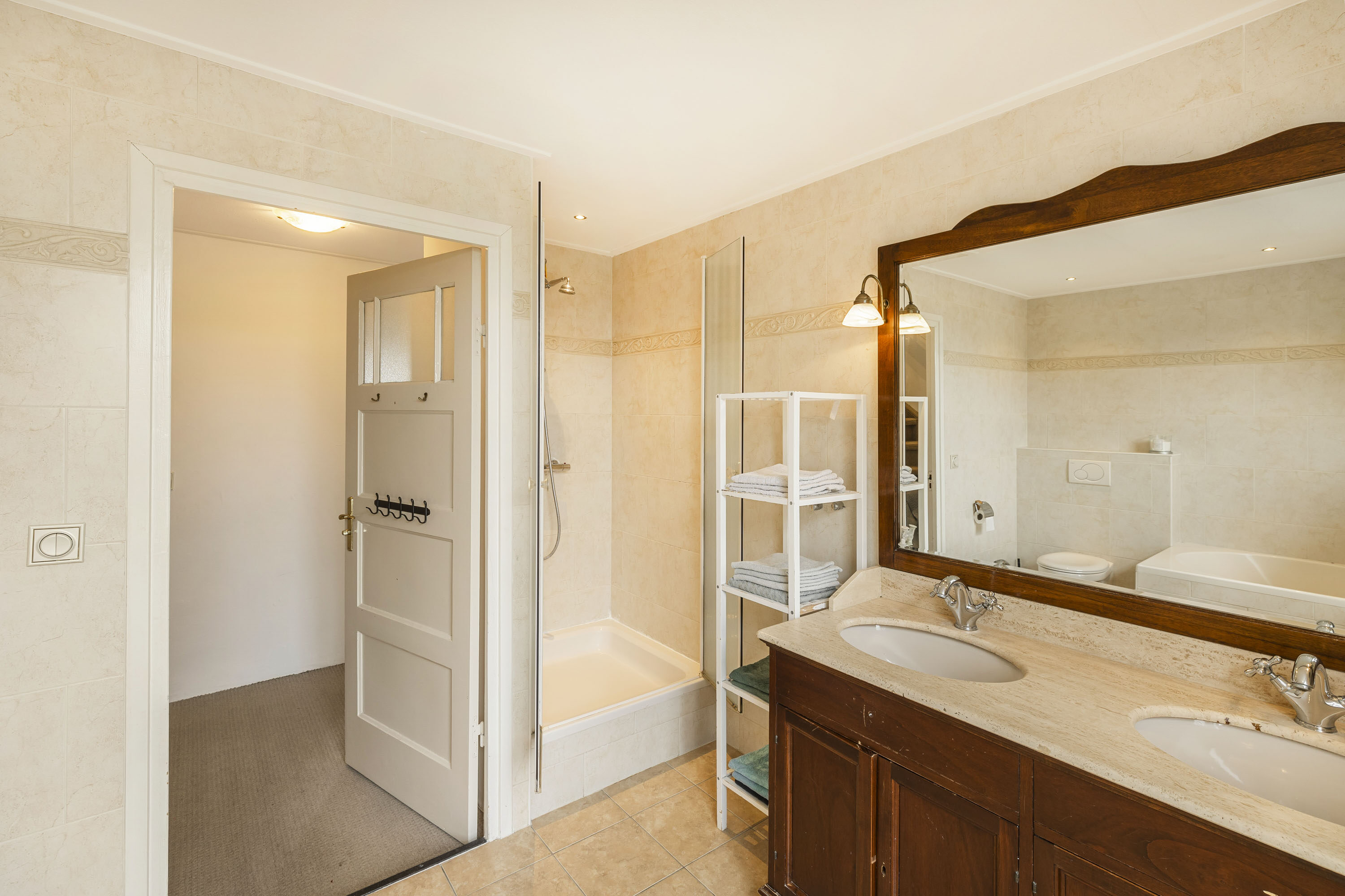 Via de vaste trap kom je op een overloop die toegang verleent tot twee ruime slaapkamers met afmetingen van 20,3 m² en 10,8 m². De grote slaapkamer aan de voorzijde is door een gedeeltelijk doorbroken scheidingswand in twee kamers (11,4 en 9,8 m²) verdeeld. Indien gewenst is het mogelijk om op de eerste verdieping 3 onafhankelijke slaapkamers te creëren. Alle kamers beschikken over voldoende natuurlijke lichtinval. De bijbehorende badkamer is uitgerust met een dubbel wastafelmeubel, een ligbad, een douche en een toilet; een te openen raam voorziet bovendien in de benodigde natuurlijke ventilatie.