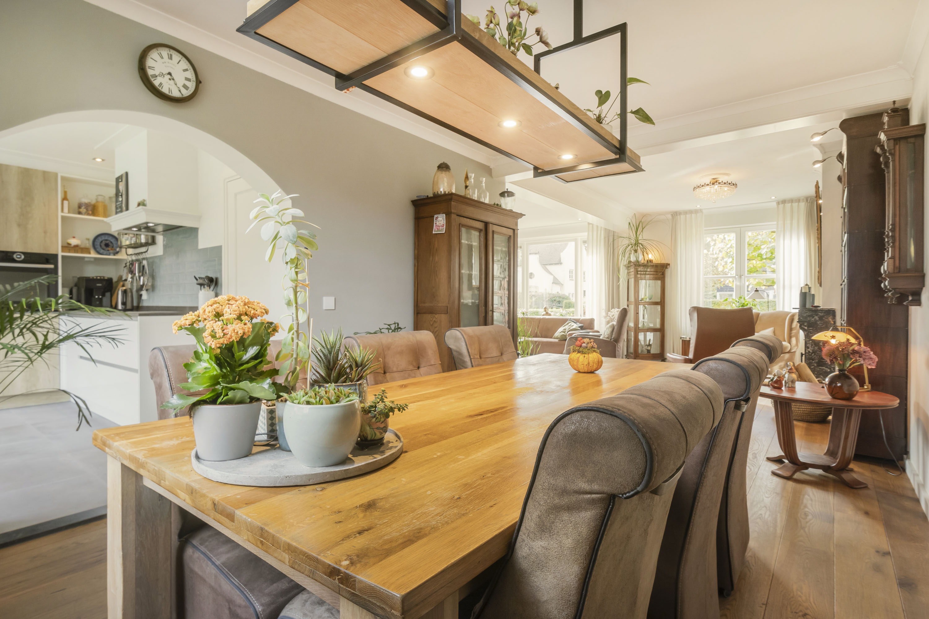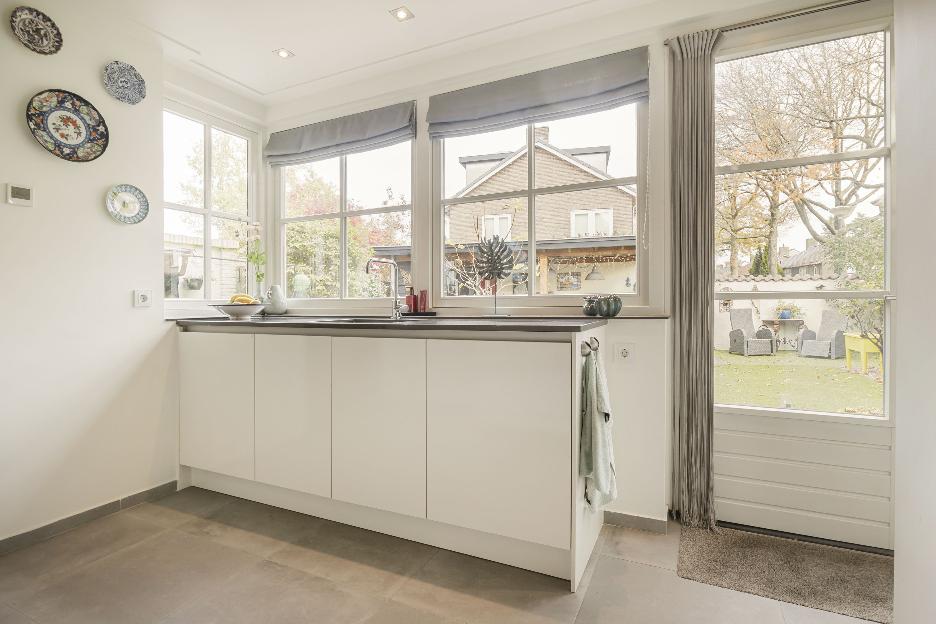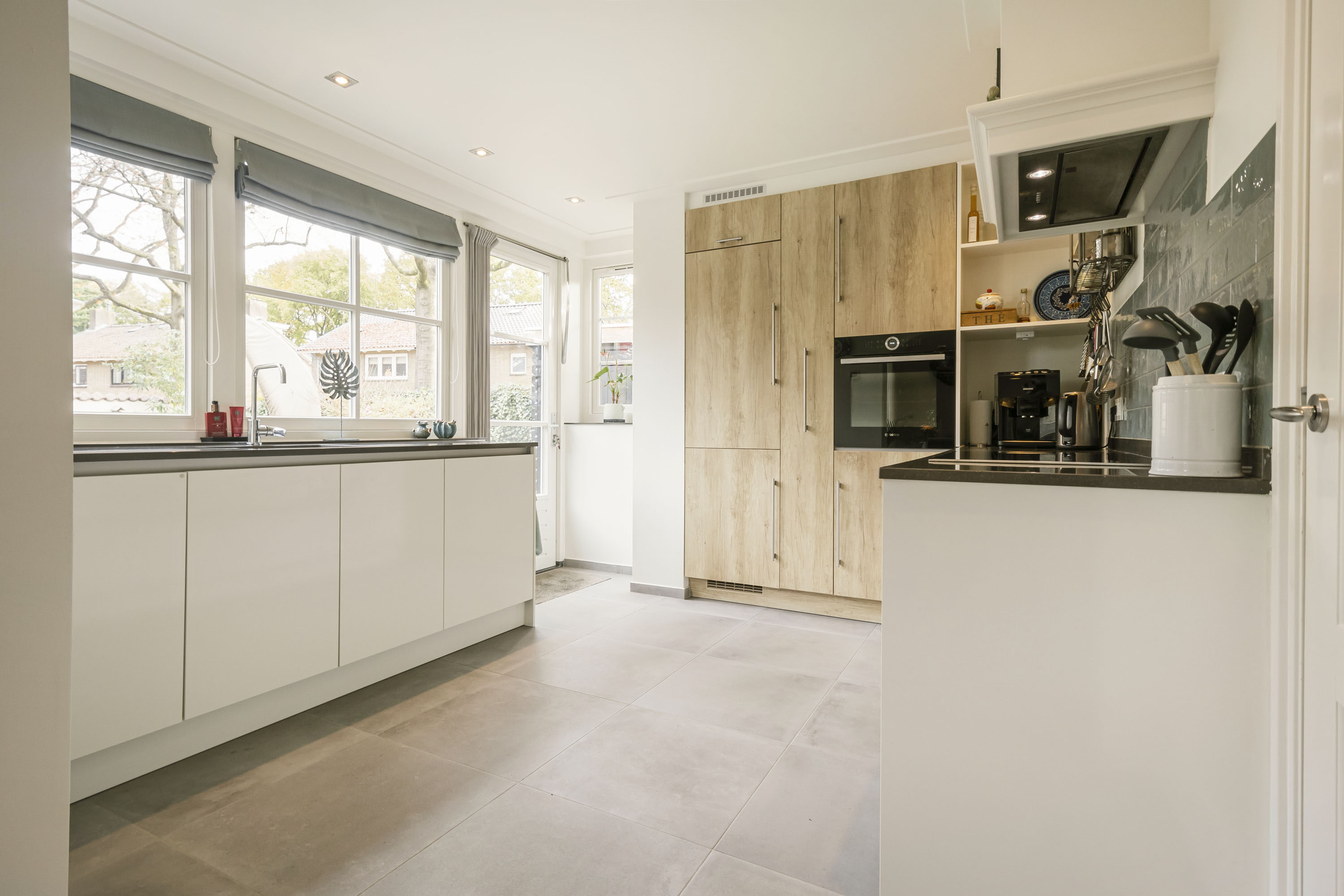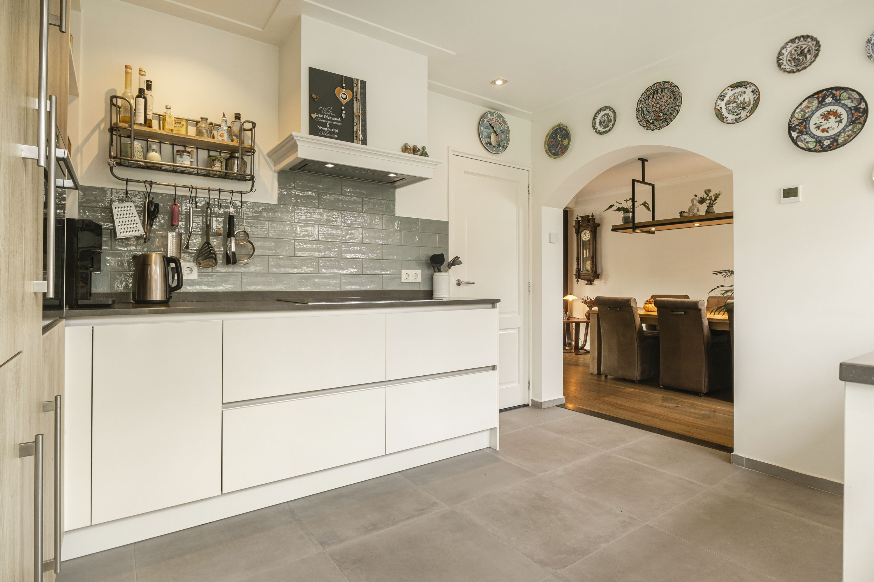 Via de entree, waar ook een toilet en trapopgang te vinden zijn, kom je in de lichte en uitnodigende woonkamer van 48,2 m². Dankzij het vele daglicht heb je hier ruimte voor een grote zitbank en gezellige zithoekjes. De open haard zorgt op koude winterdagen voor een warme en sfeervolle ambiance. Aan de achterzijde van de woning vind je het eetgedeelte, waarna je de in 2017 aangebouwde keuken bereikt. Deze moderne keuken is uitgevoerd met witte kastjes, een antracietgrijs werkblad en diverse inbouwapparatuur – zoals een kookplaat, afzuigkap, oven, koel-vriescombinatie en vaatwasser – en is tevens voorzien van vloerverwarming. Vanuit de keuken krijg je toegang tot een kelder van 12,6 m², ideaal om je spullen op te bergen.