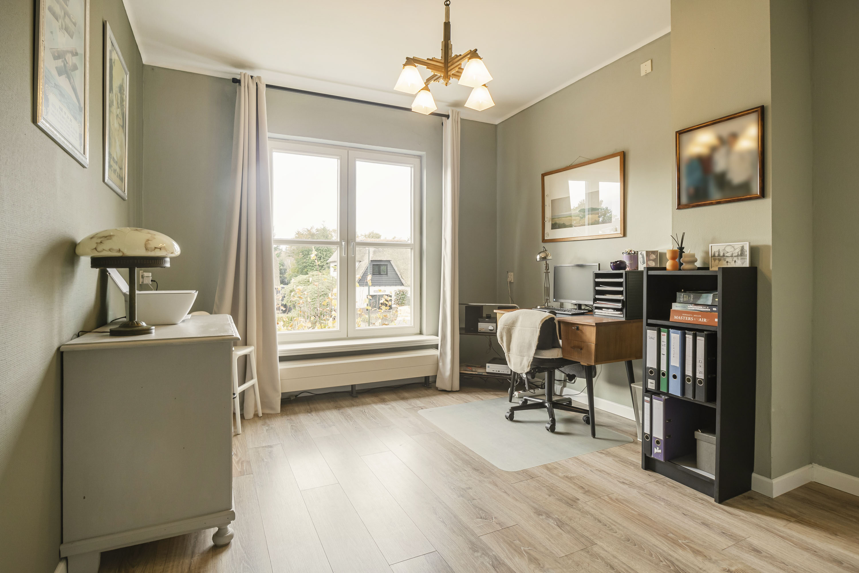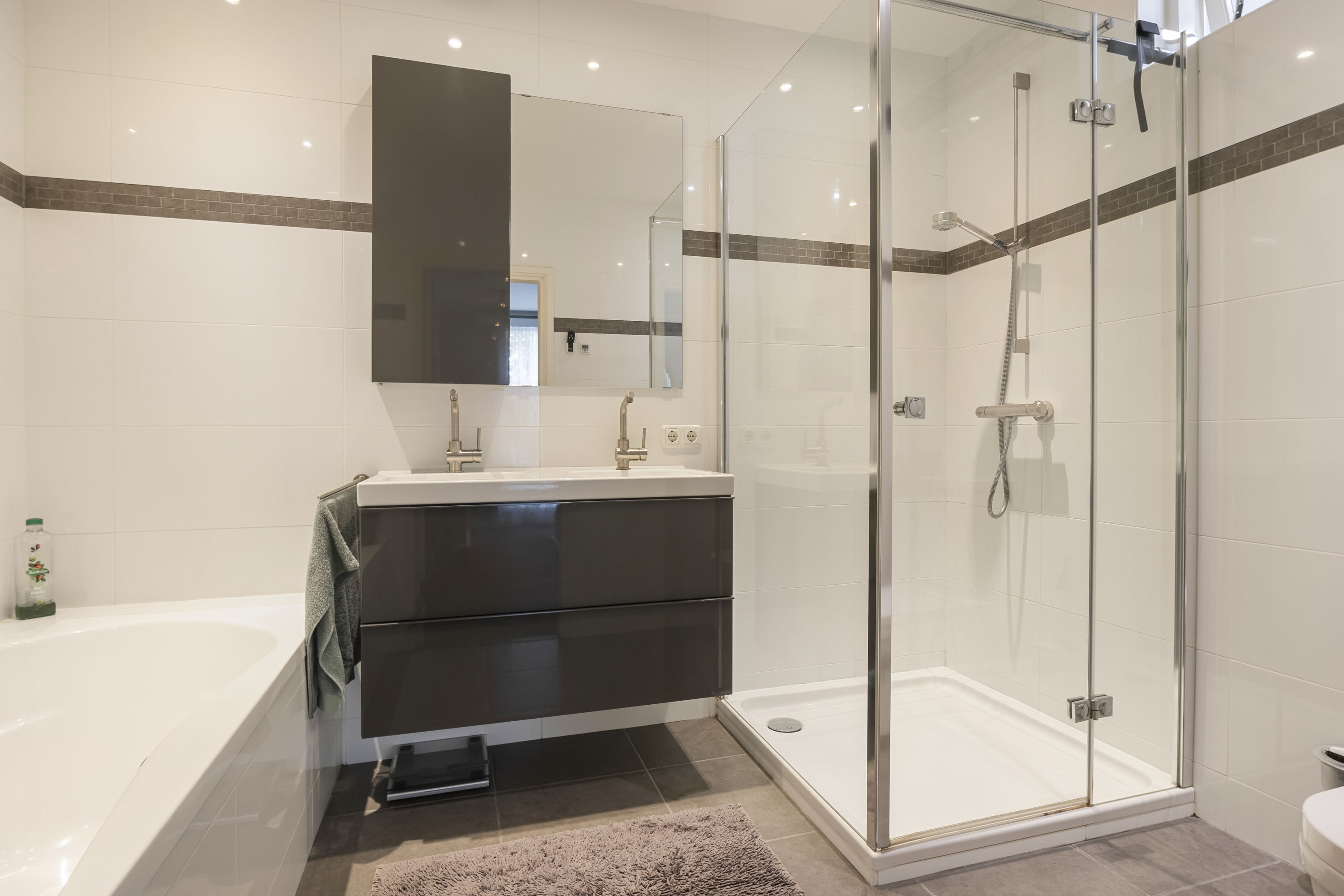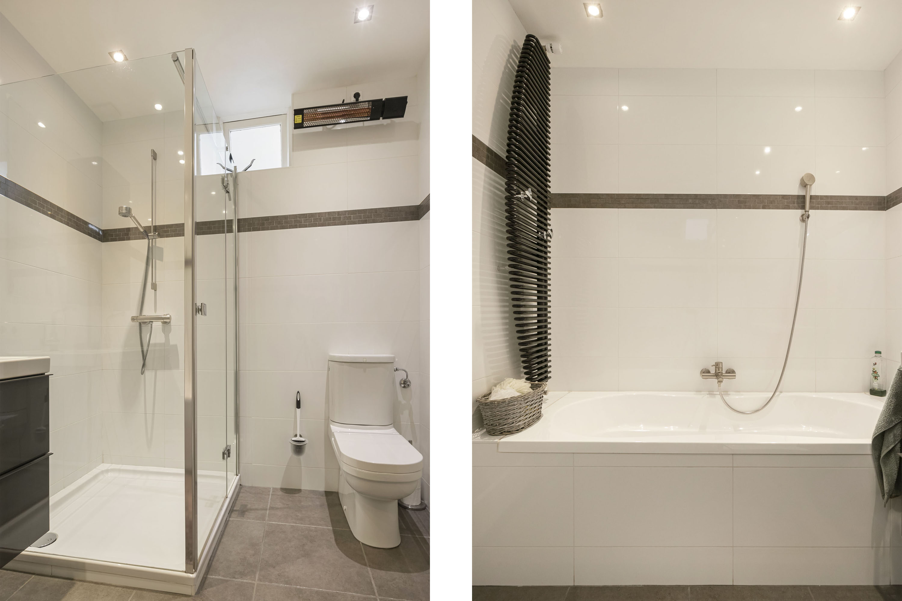 Via de vaste trap bereik je de overloop, die toegang geeft tot alle ruimtes op deze verdieping. Je hebt hier drie slaapkamers, met afmetingen van 16,5 m², 12,1 m² en 8,5 m². In de grootste slaapkamer zit een inbouwkast, en in alle kamers zorgen grote raampartijen voor een fijne lichtinval. De badkamer van 6,4 m² is afgewerkt met witte en antracietgrijze tegels en is voorzien van een ligbad, een douche, een wastafelmeubel en een toilet – en ook hier geniet je van vloerverwarming. In de aangrenzende ruimte van 7,2 m² vind je de aansluitingen voor wasmachine en droger, met daarnaast voldoende opbergruimte.