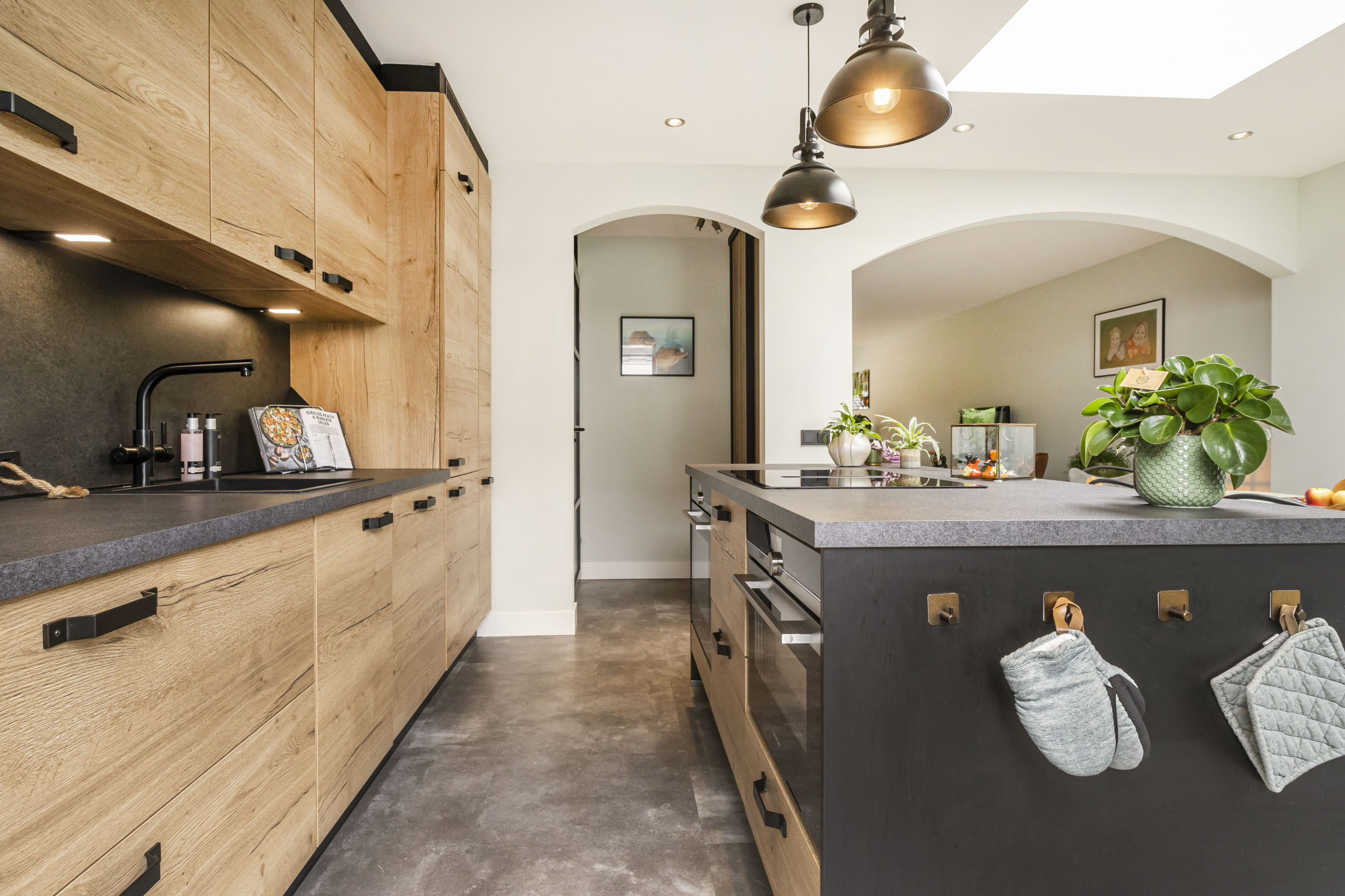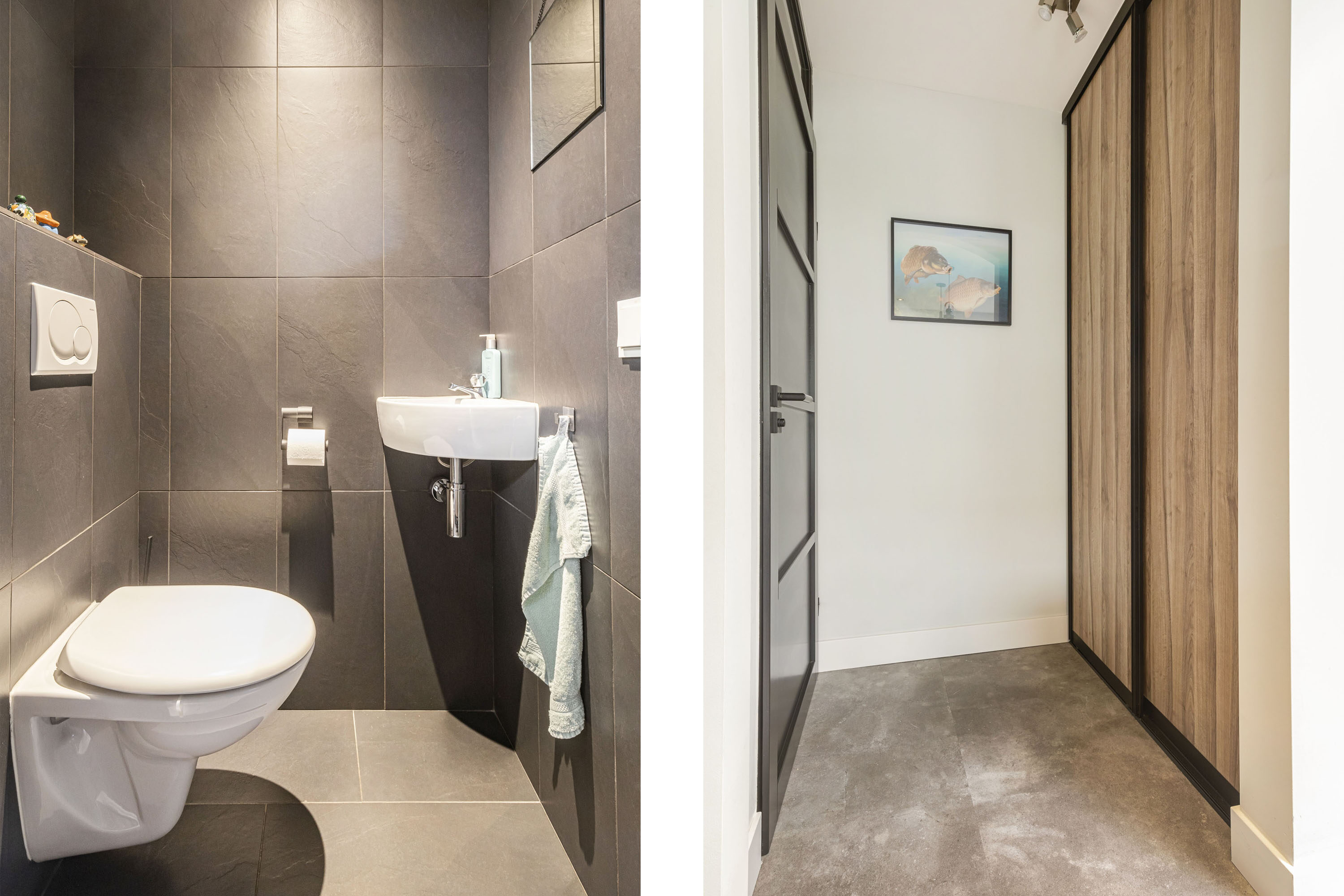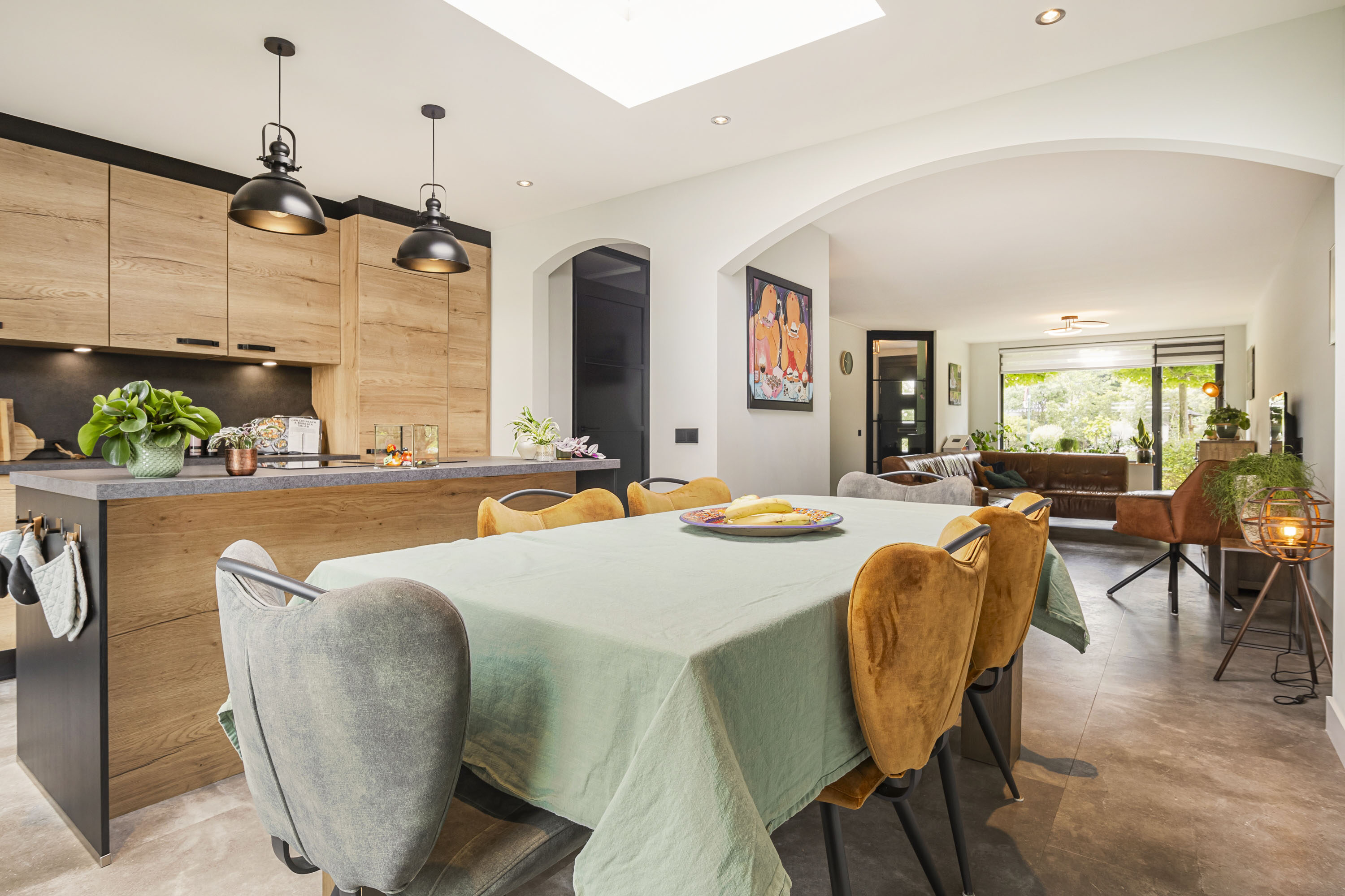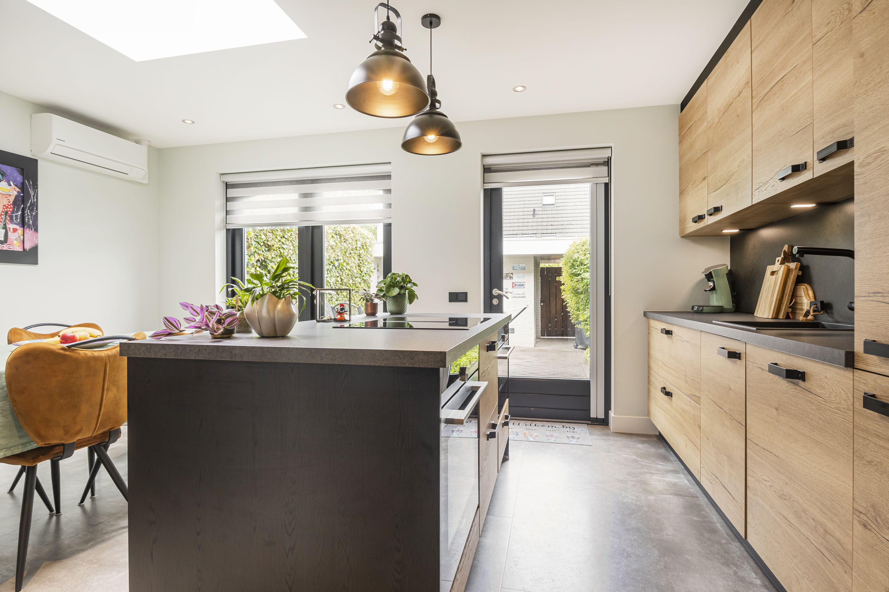 Op de begane grond kom je via de entree binnen in de hal, waar je de trap naar de eerste verdieping en de meterkast vindt. Vanuit de hal stap je de woonkamer in, die dankzij de grote raampartij licht en ruim aanvoelt. Het eetgedeelte bevindt zich centraal in de ruimte en biedt voldoende plek voor een flinke eettafel. De keuken is uitgerust met moderne apparatuur, waaronder een inductiekookplaat, combi-oven, vaatwasser, Quooker en koelkast. Vanuit de keuken heb je direct toegang tot de achtertuin.