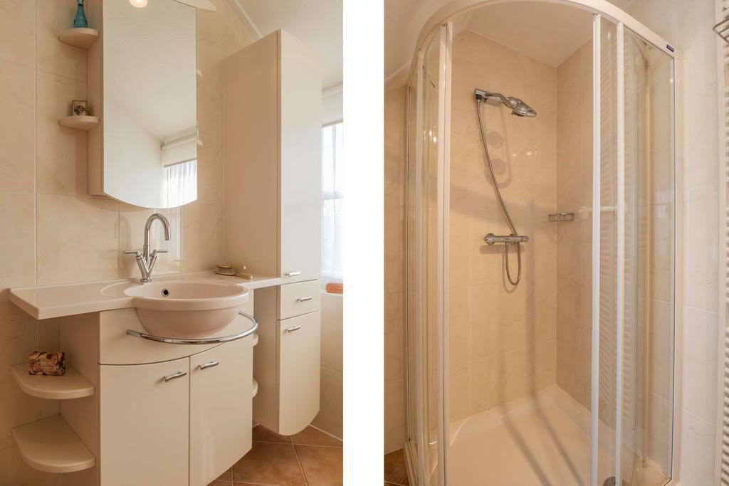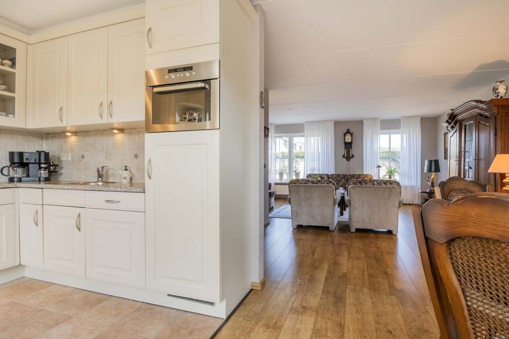 De eethoek biedt een ideale plek voor gezellige maaltijden en samenzijn. De lichte keuken, uitgevoerd in een praktische hoekopstelling, combineert ruimte en efficiëntie, waardoor koken een plezierige ervaring wordt.
