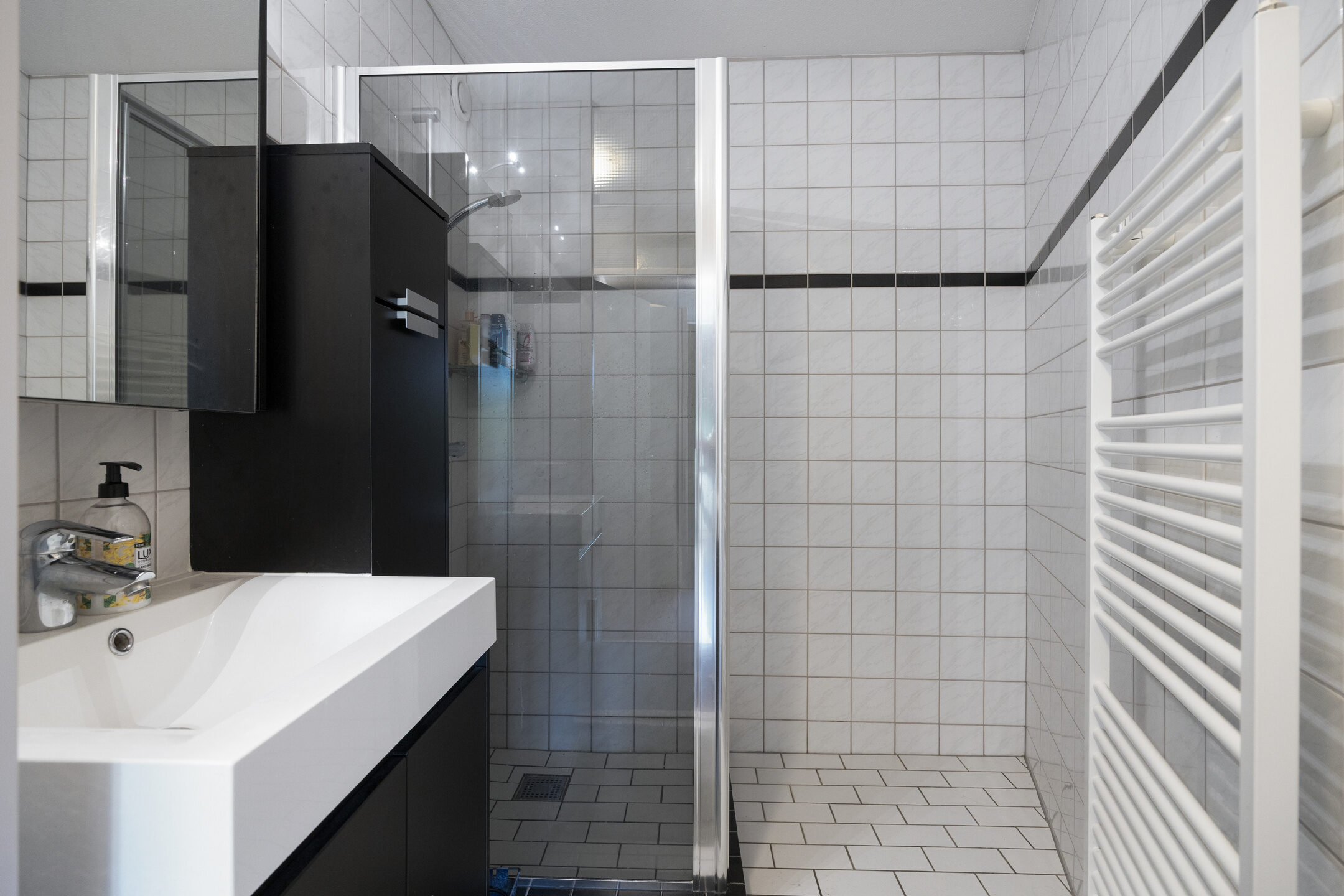 De badkamer van 3m² is modern afgewerkt met wit tegelwerk en beschikt over een wastafelmeubel en een ruime inloopdouche.