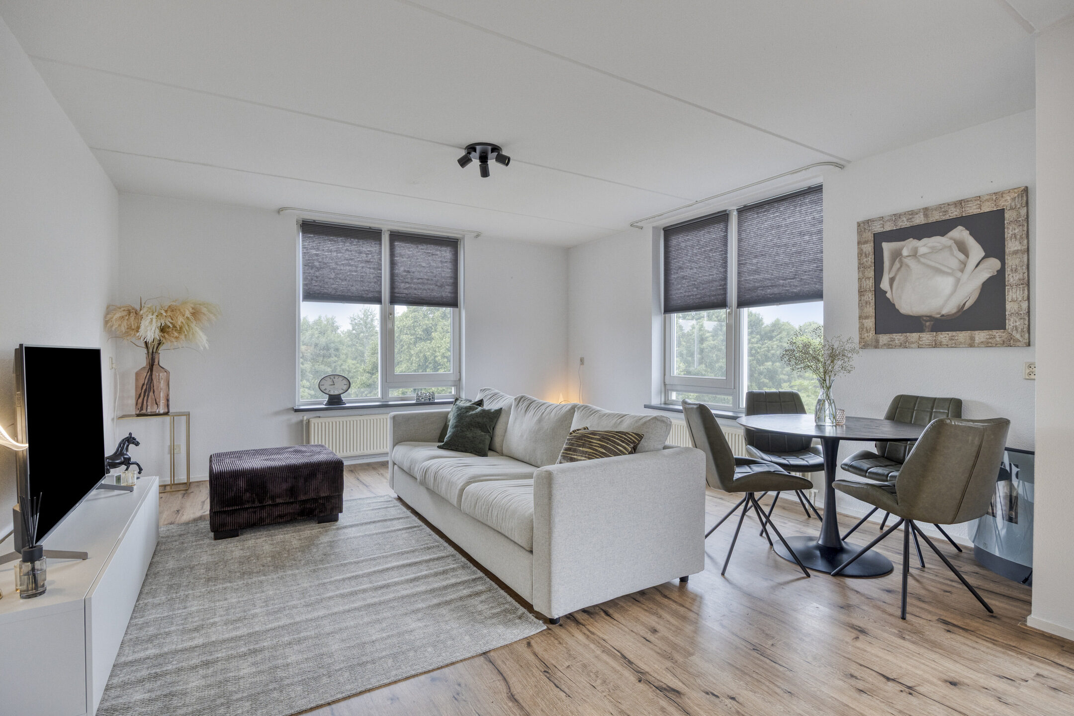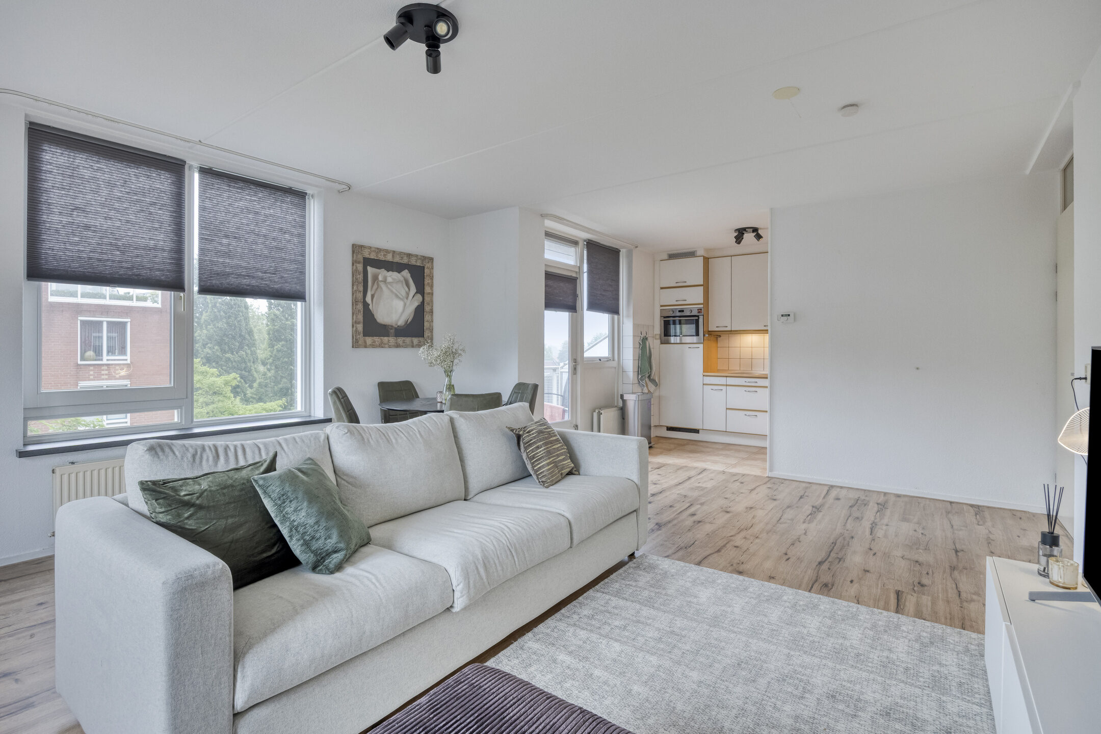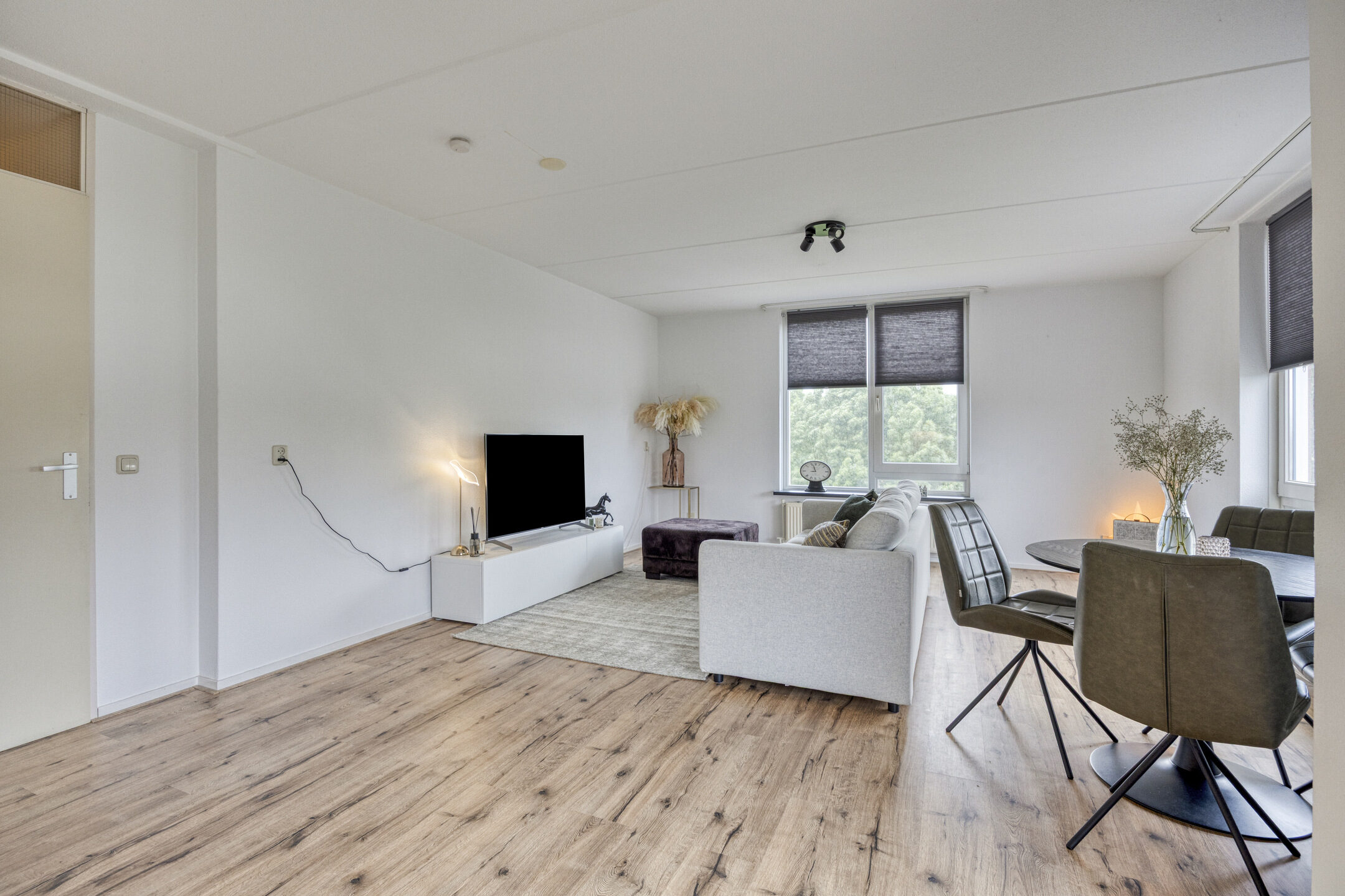 De woonkamer, met diverse raampartijen, laat veel natuurlijk licht binnen en zorgt voor een heerlijk ruimtelijk gevoel. Er is voldoende ruimte om hier een gezellige zithoek of een praktische werkplek in te richten.