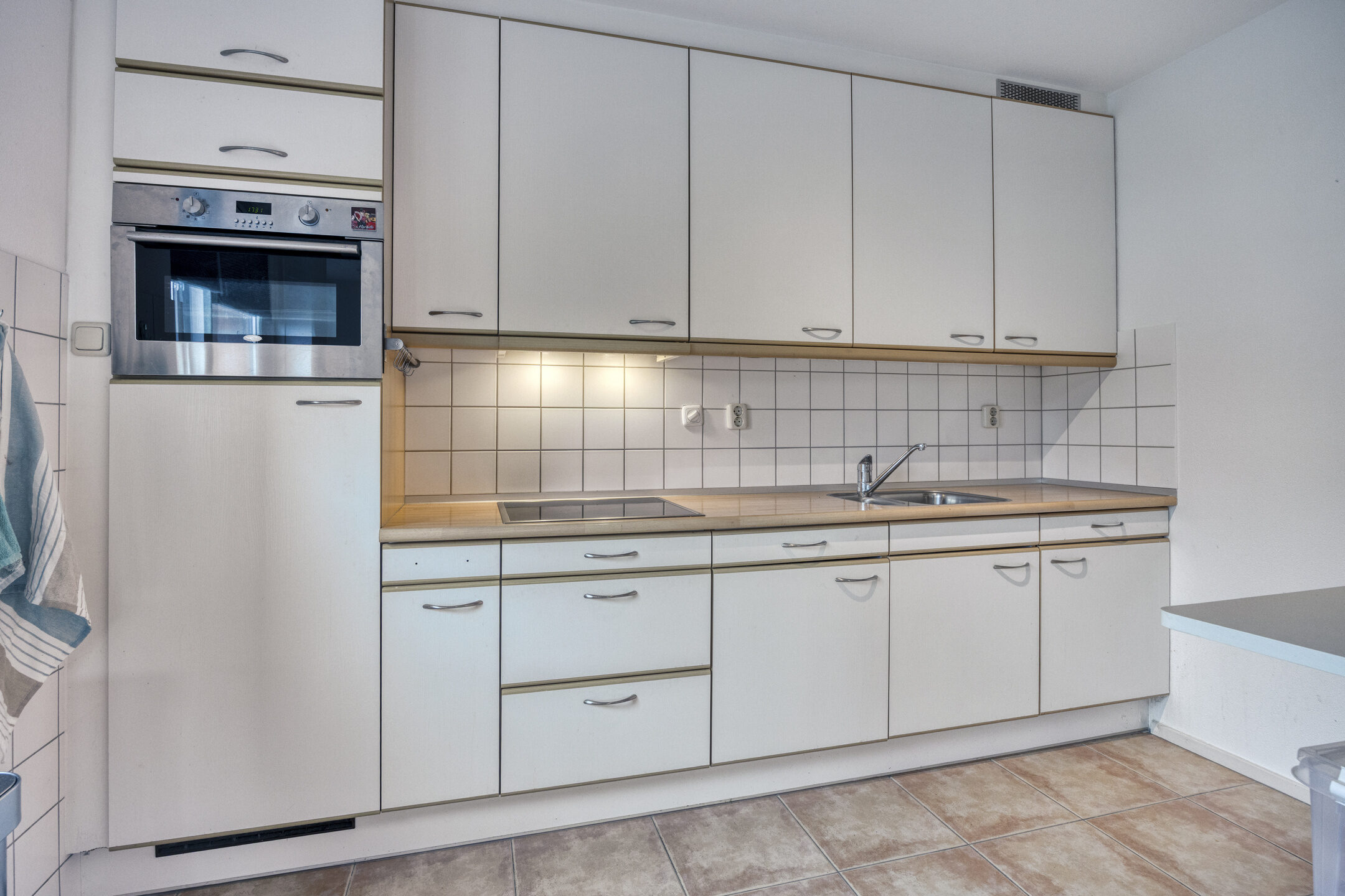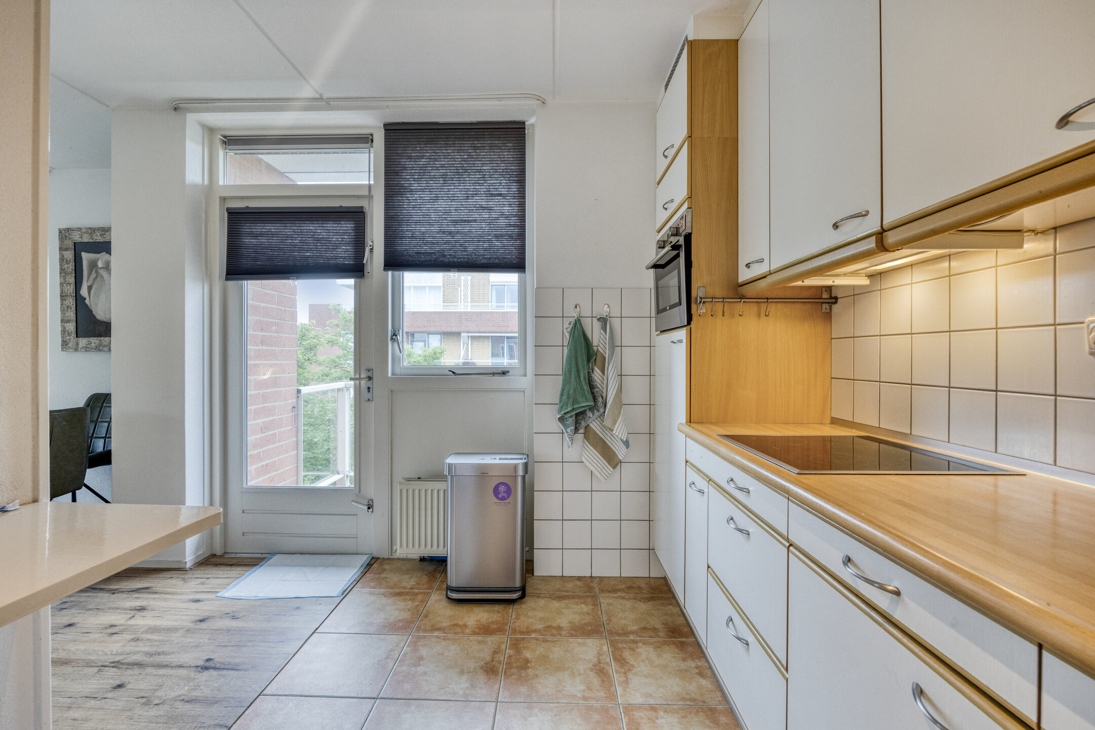Aangrenzend aan de woonkamer bevindt zich de eetruimte en de half open keuken. De keuken is uitgerust met diverse inbouwapparaten, waaronder een inductiekookplaat, combi-oven, vaatwasser en nog een vaatwasser.