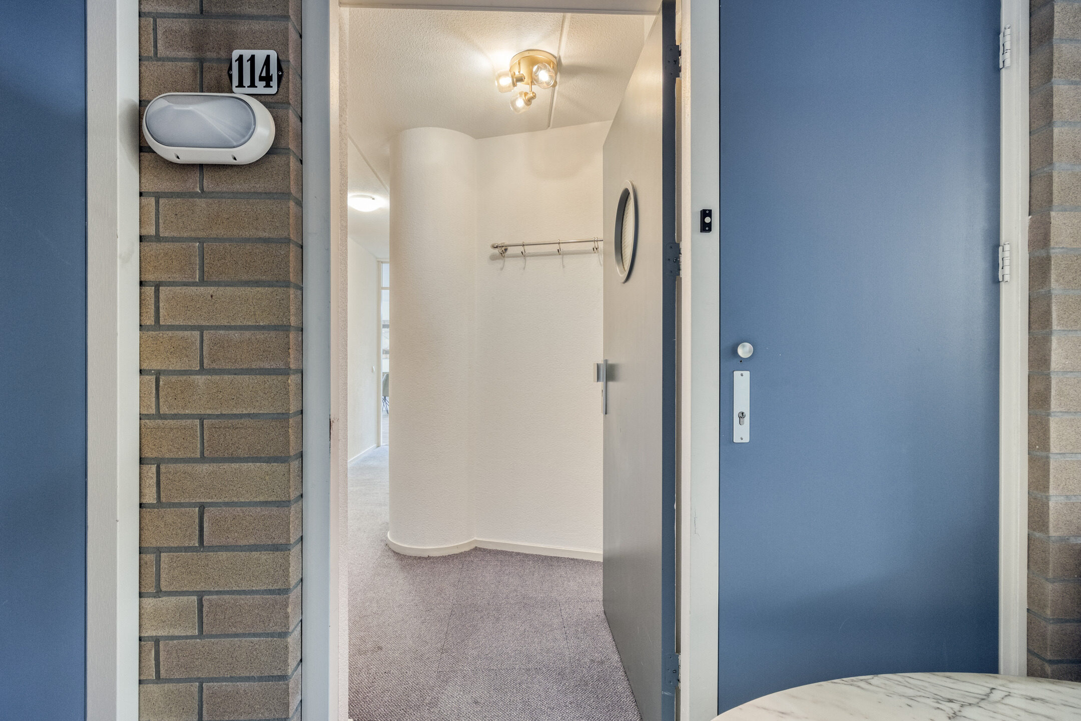 Bij binnenkomst in het appartement stap je in een ruime hal die toegang biedt tot de slaapkamers, het separate toilet, de badkamer en de interne berging. Vanuit de hal loop je door naar de ruime woonkamer.