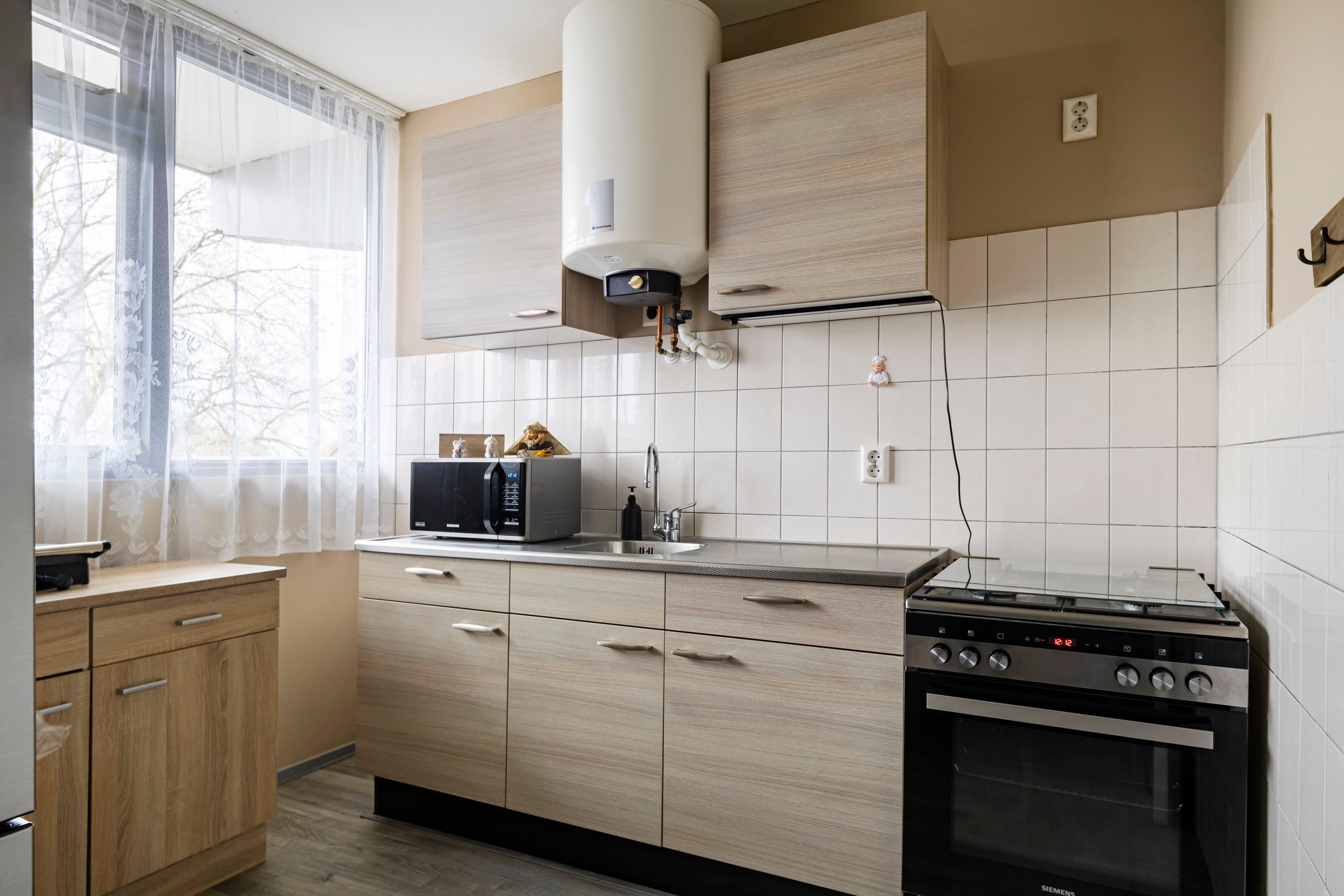 De gesloten keuken van 7,5 m² is voorzien van inbouwapparatuur zoals een gasfornuis en afzuigkap en beschikt ook over een raam, wat zorgt voor natuurlijke ventilatie.