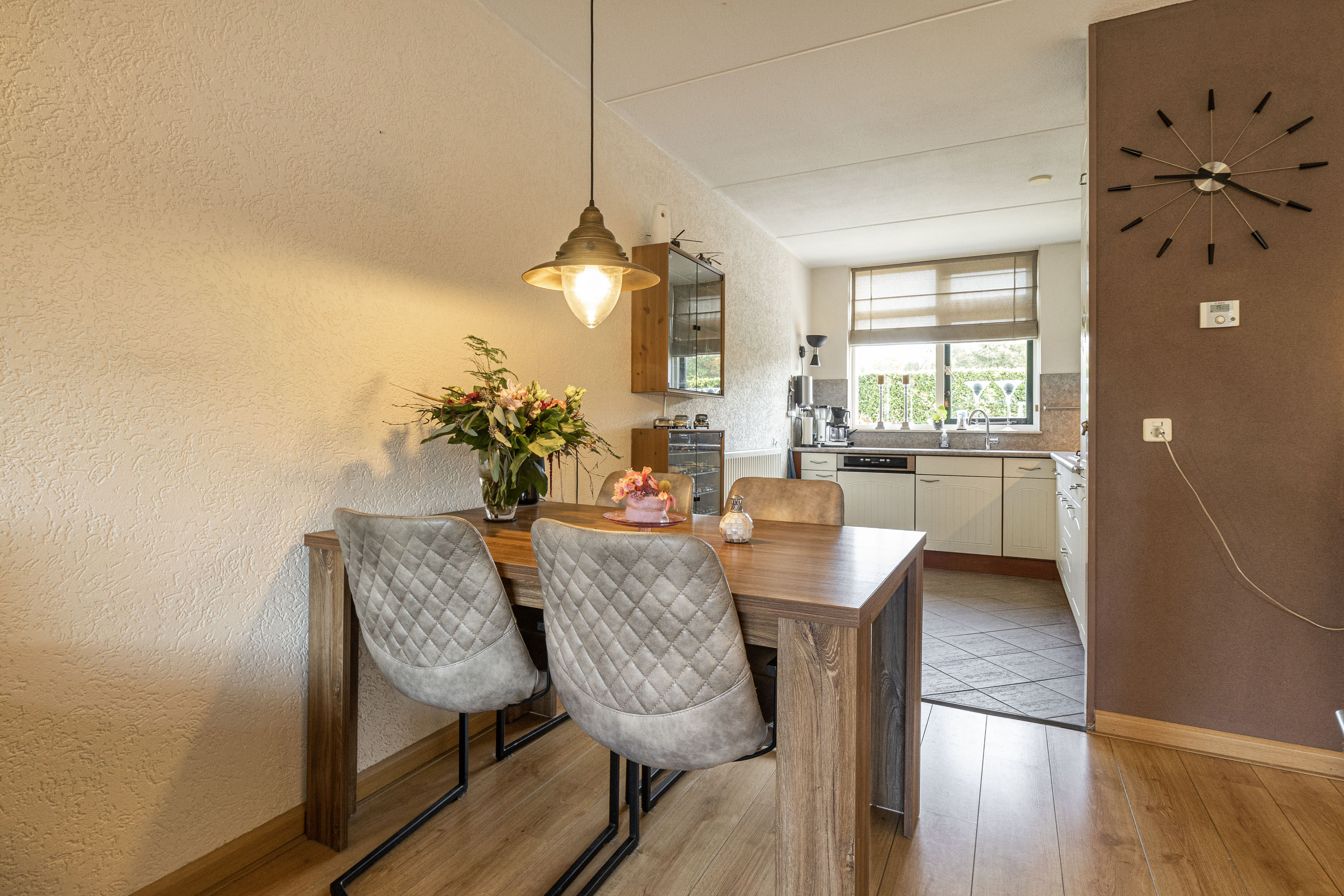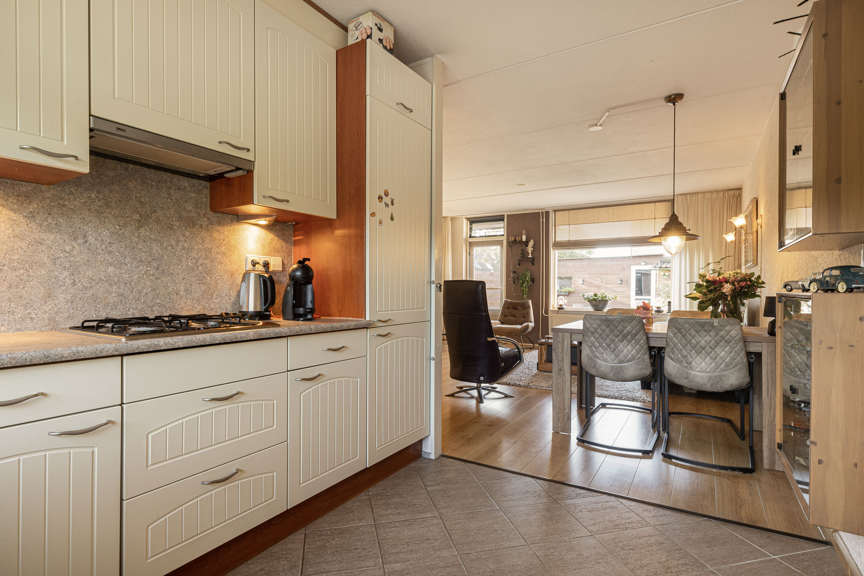Via de royale entree, waar tevens het toilet, de meterkast en de trapopgang aanwezig zijn, kom je in een ruime woonkamer terecht. Deze kamer beschikt over genoeg daglicht dankzij de grote raampartijen en de aanwezige tuindeur. biedt voldoende ruimte voor een grote hoekbank en een gezellige zithoek. Centraal gelegen vind je het eetgedeelte, dat overgaat in de ruime, halfopen keuken. De keuken is voorzien van diverse inbouwapparatuur en beschikt over een raampartij die geopend kan worden voor optimale ventilatie.