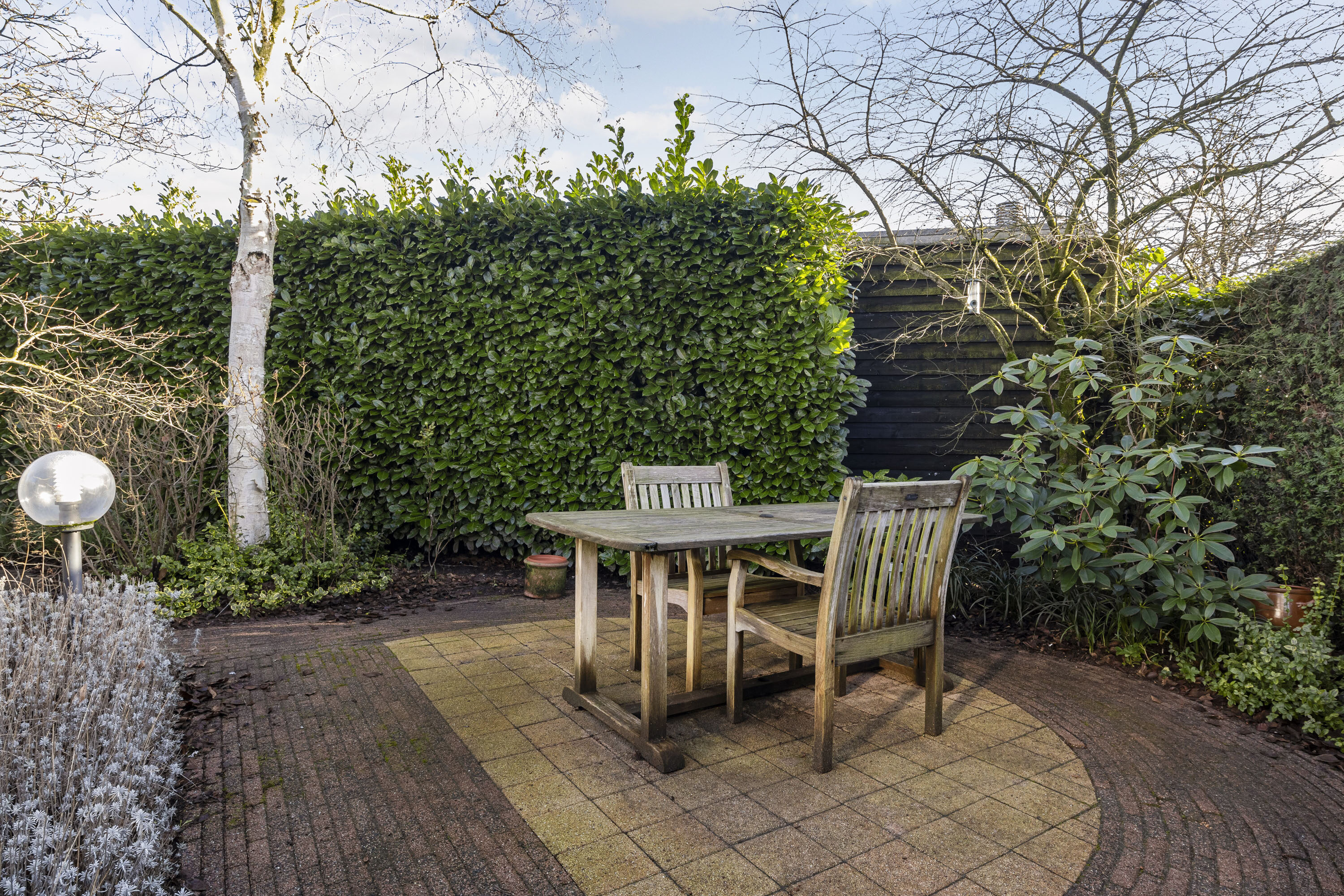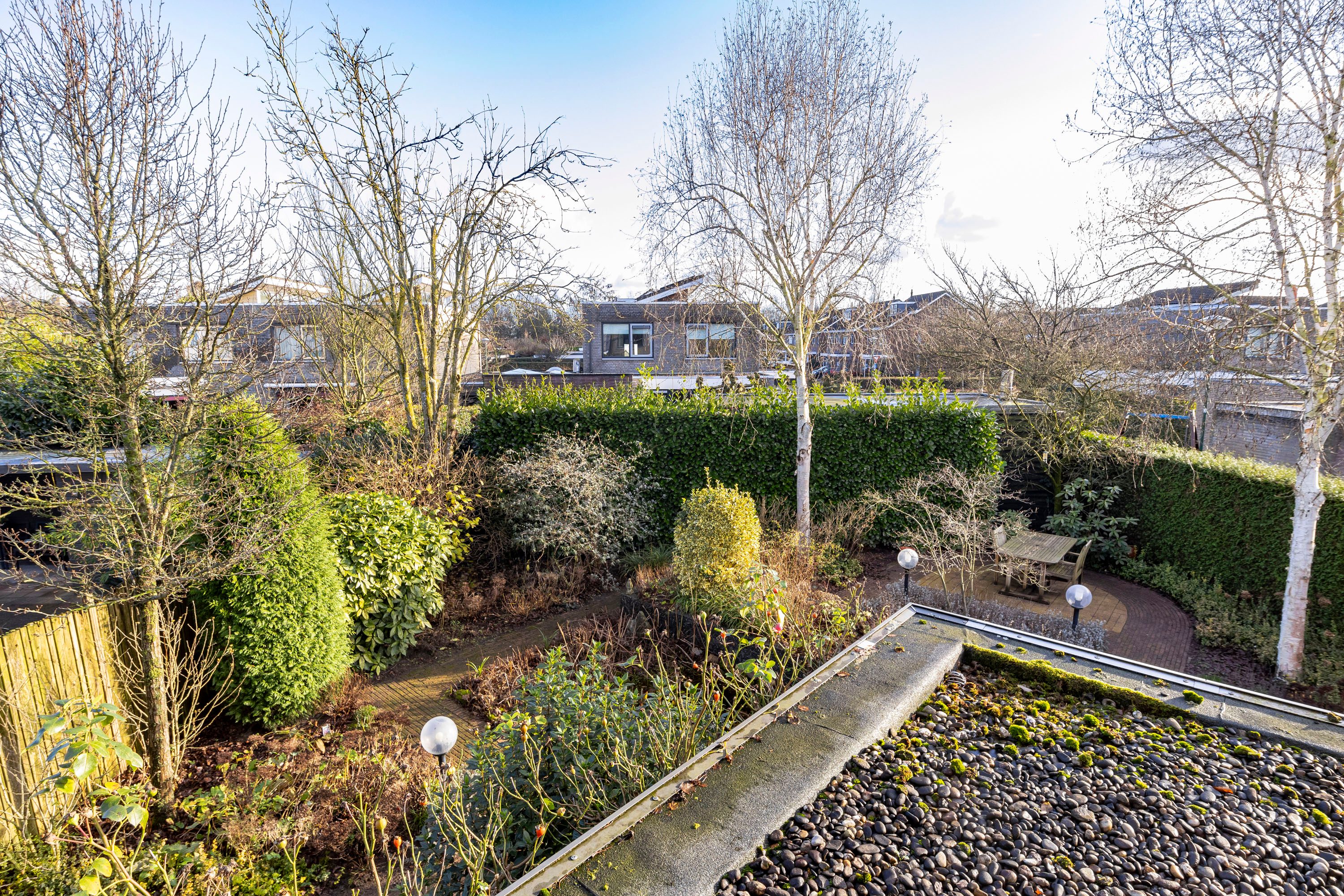De tuin rondom de woning is een prachtig aangelegde zonnige oase van rust en schoonheid. Weelderige bloemen en planten bloeien in de zomer in een palet van kleuren, terwijl zorgvuldig gesnoeide hagen en bomen structuur en elegantie bieden. Er zijn gezellige zitjes en ook een vijver aangelegd. Deze tuin is een harmonieus samenspel van natuur en design. Om de tuin is een hekwerk geplaatst met een poort. De inpandige garage is voorzien van een gecoate vloer, uitstort gootsteen met kraan en twee openslaande geïsoleerde garagedeuren aan de voorzijde en achterin een deur naar de tuin. Tevens is er een elektrapunt voor het opladen van de elektrische auto. Op de oprit is plaats voor twee auto’s.