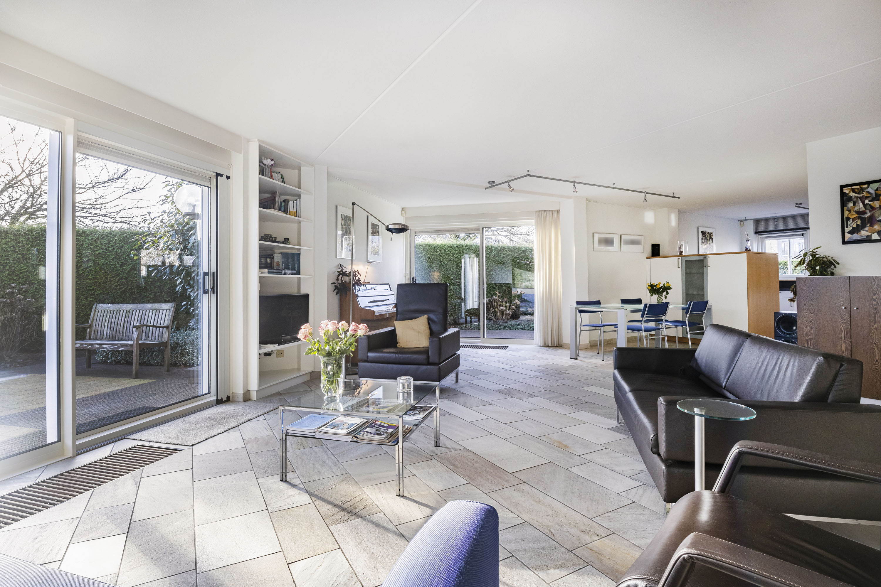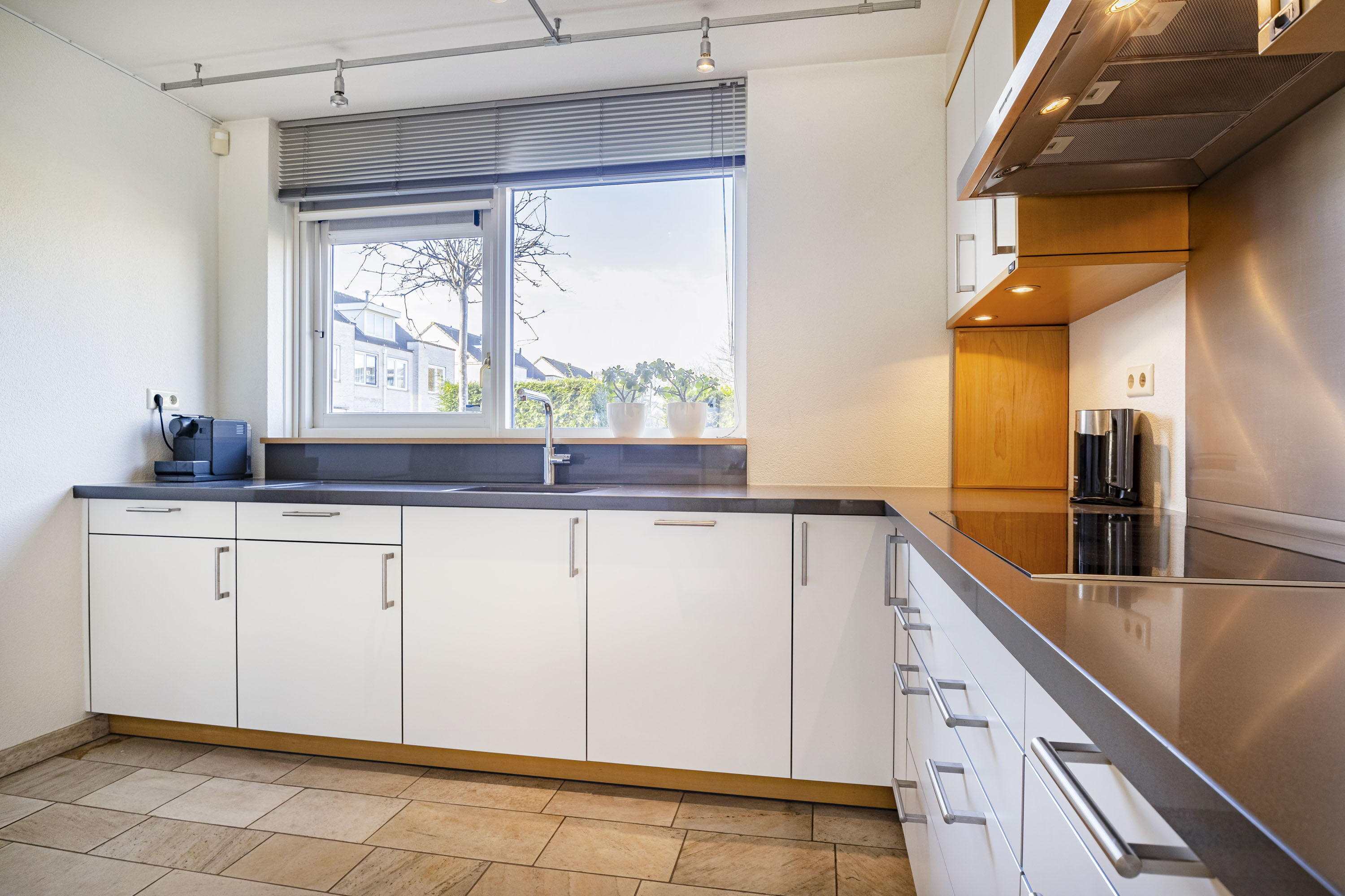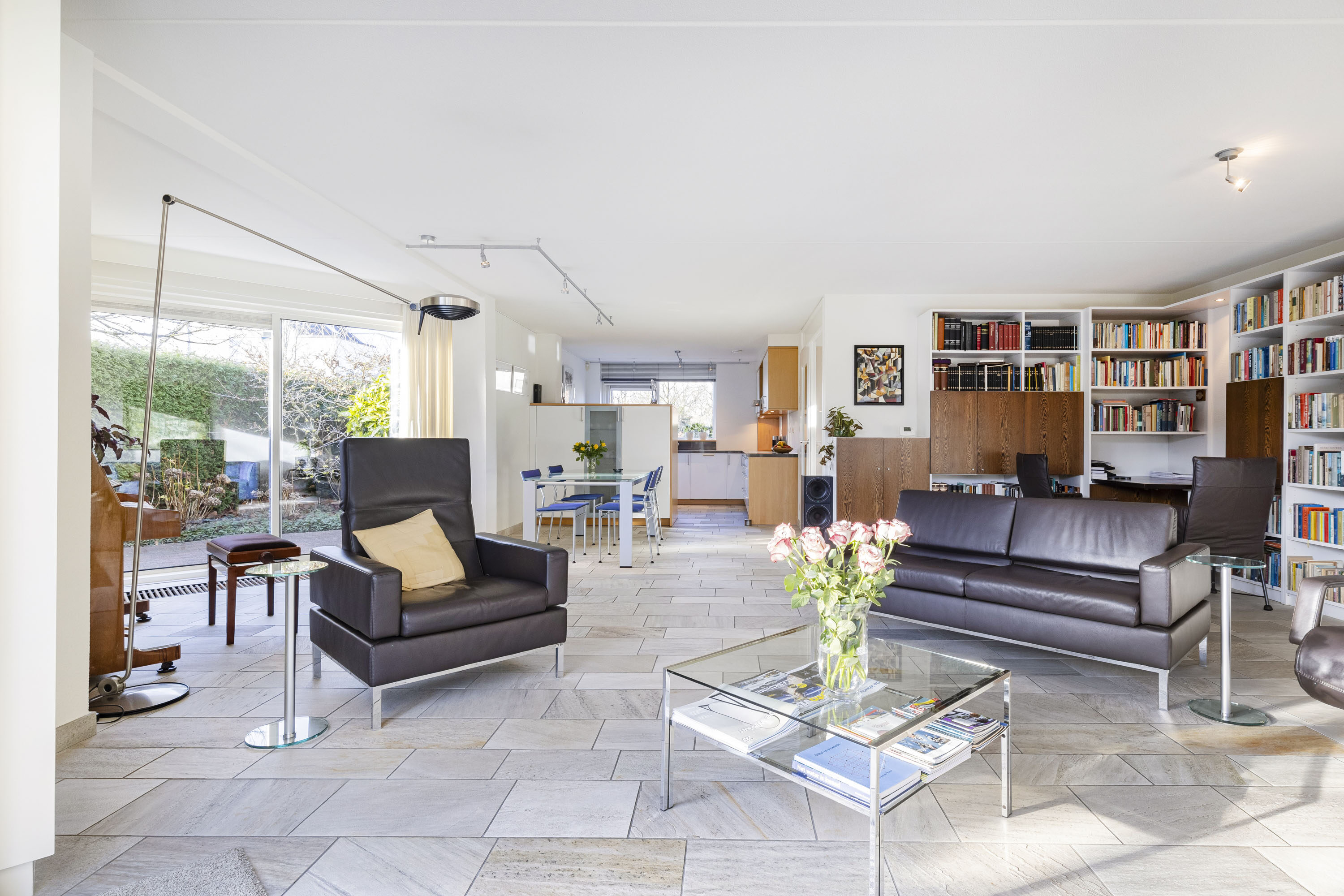 De overdekte entree geeft toegang tot een zeer ruime hal met een fraaie onder de trap ingebouwde garderobe-bergkast. De lichte toiletruimte is volledig betegeld. Voorts bevindt zich in de hal de meterkast (vernieuwd), de trapopgang naar de eerste verdieping en de rechtstreekse inpandige toegang tot de garage en uiteraard de toegang tot het woongedeelte van het huis. De tuingerichte woonkamer is royaal en beschikt over veel daglichtinval. Dit mede dankzij de schuifpui welke toegang tot de achtertuin geeft. De gehele begane grond vloer is voorzien van een fraaie natuurstenen vloer met comfortabele vloerverwarming en convectoren. Vanuit de woonkamer geven twee schuifpuien toegang tot de tuin. Aan de gevels zijn twee elektrisch bedienbare rolluiken geplaatst. Aan de voorzijde van de woning is de half open keuken gesitueerd. De keuken is voorzien van een grote inbouwkeuken (merk Bulthaup) inclusief een donkergrijs composiet werkblad en de volgende inbouwapparatuur: inductie kookplaat, afzuigkap, vaatwasser (recent vernieuwd), koelkast en oven. Veel kastruimte in de vele lades en o.a. een apothekerskast. Vanuit de keuken is er een leuk uitzicht op de straat.