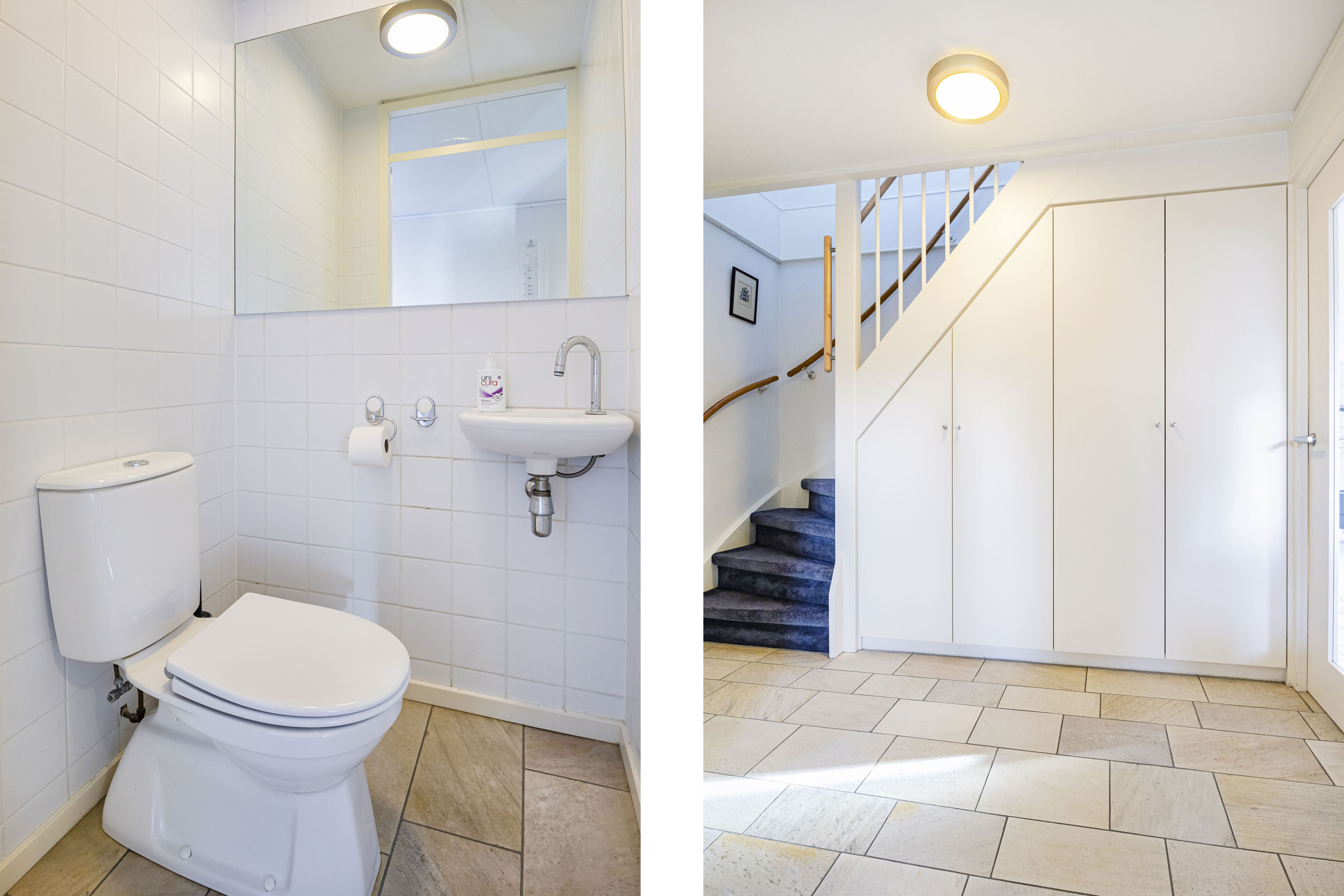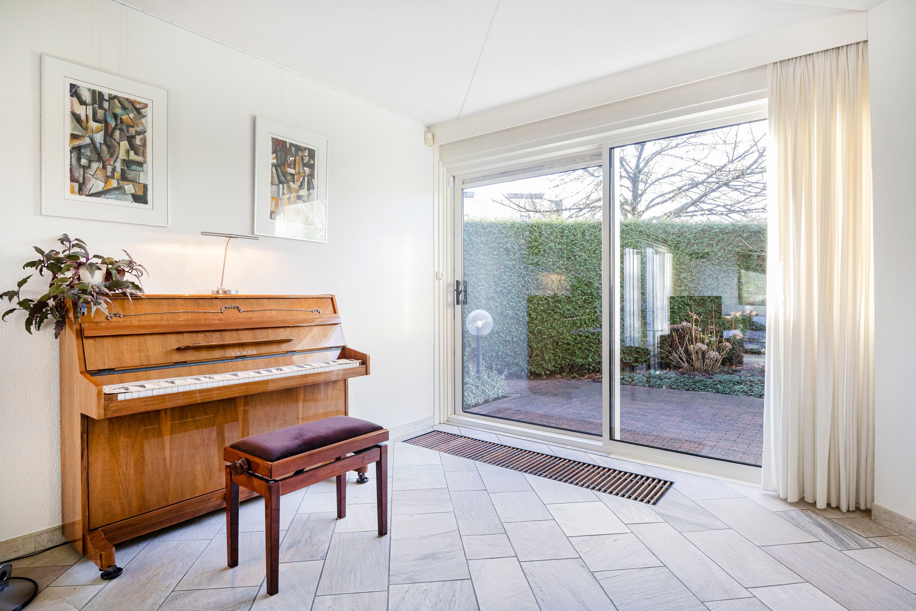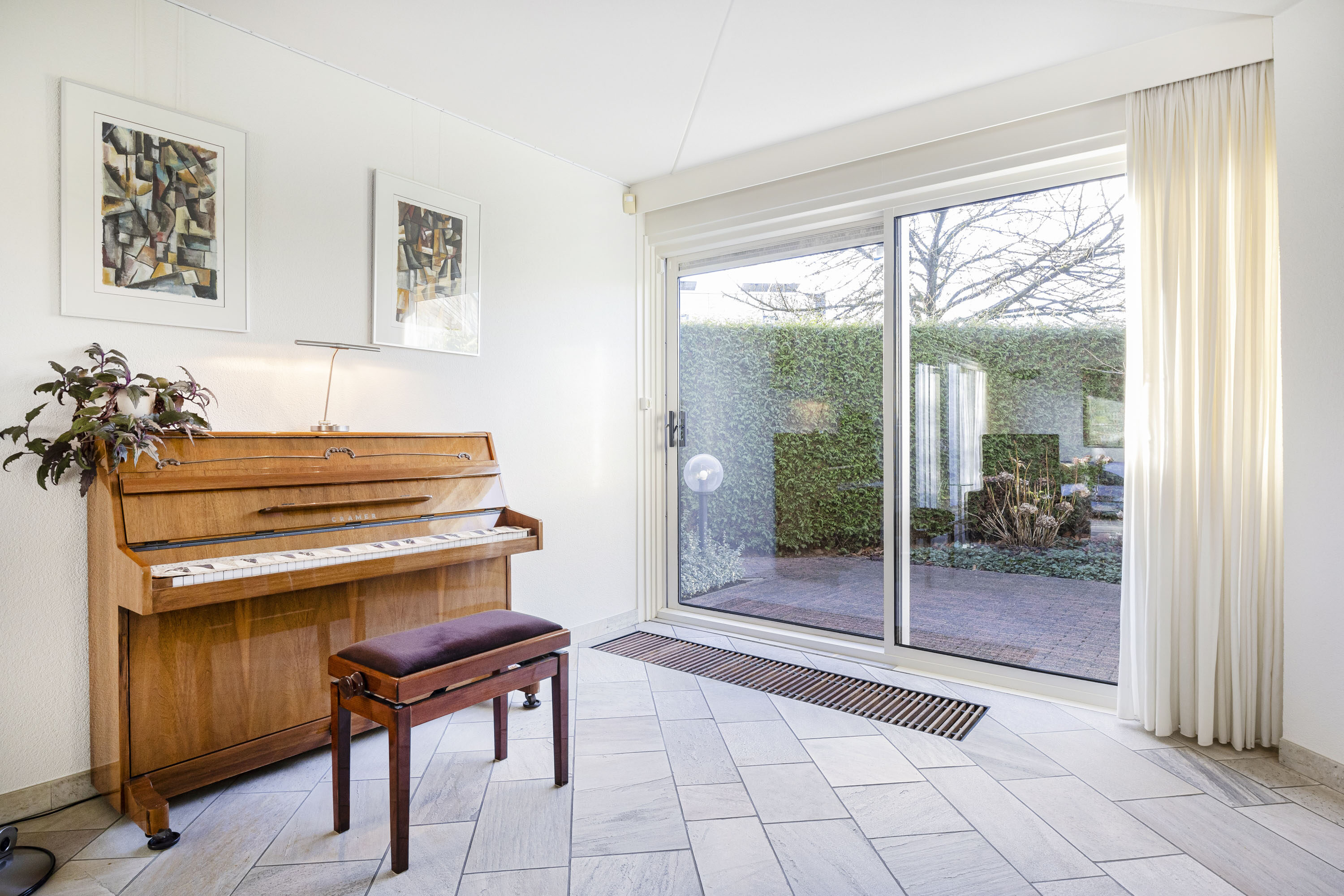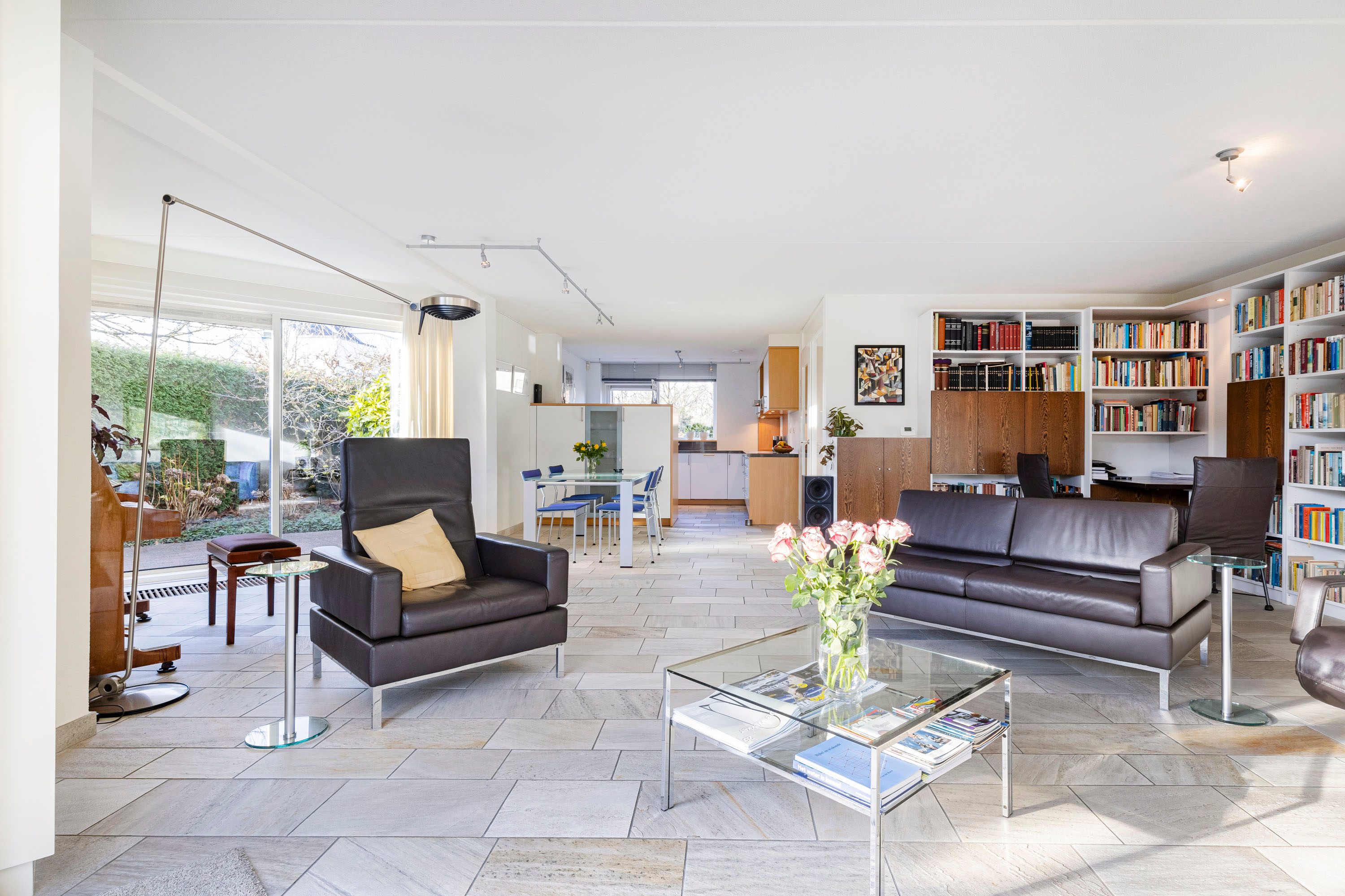 De overdekte entree geeft toegang tot een zeer ruime hal met een fraaie onder de trap ingebouwde garderobe-bergkast. De lichte toiletruimte is volledig betegeld. Voorts bevindt zich in de hal de meterkast (vernieuwd), de trapopgang naar de eerste verdieping en de rechtstreekse inpandige toegang tot de garage en uiteraard de toegang tot het woongedeelte van het huis. De tuingerichte woonkamer is royaal en beschikt over veel daglichtinval. Dit mede dankzij de schuifpui welke toegang tot de achtertuin geeft. De gehele begane grond vloer is voorzien van een fraaie natuurstenen vloer met comfortabele vloerverwarming en convectoren. Vanuit de woonkamer geven twee schuifpuien toegang tot de tuin. Aan de gevels zijn twee elektrisch bedienbare rolluiken geplaatst. Aan de voorzijde van de woning is de half open keuken gesitueerd. De keuken is voorzien van een grote inbouwkeuken (merk Bulthaup) inclusief een donkergrijs composiet werkblad en de volgende inbouwapparatuur: inductie kookplaat, afzuigkap, vaatwasser (recent vernieuwd), koelkast en oven. Veel kastruimte in de vele lades en o.a. een apothekerskast. Vanuit de keuken is er een leuk uitzicht op de straat.