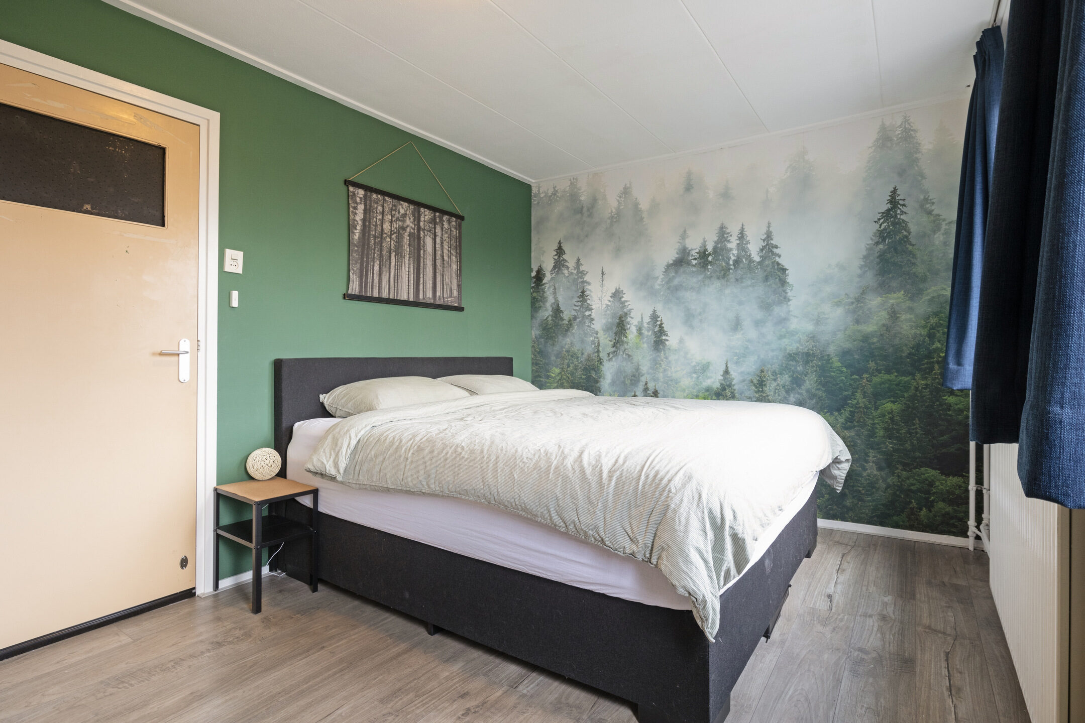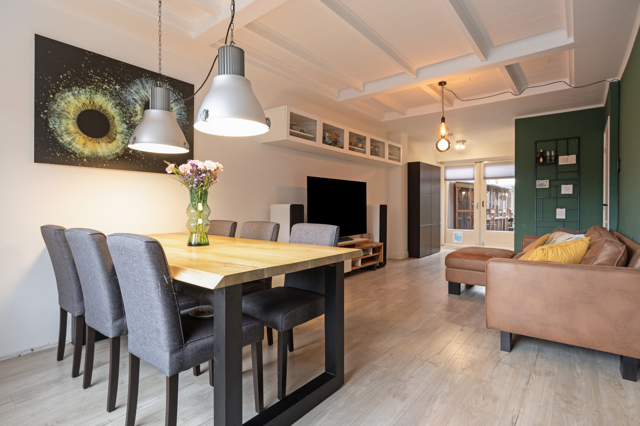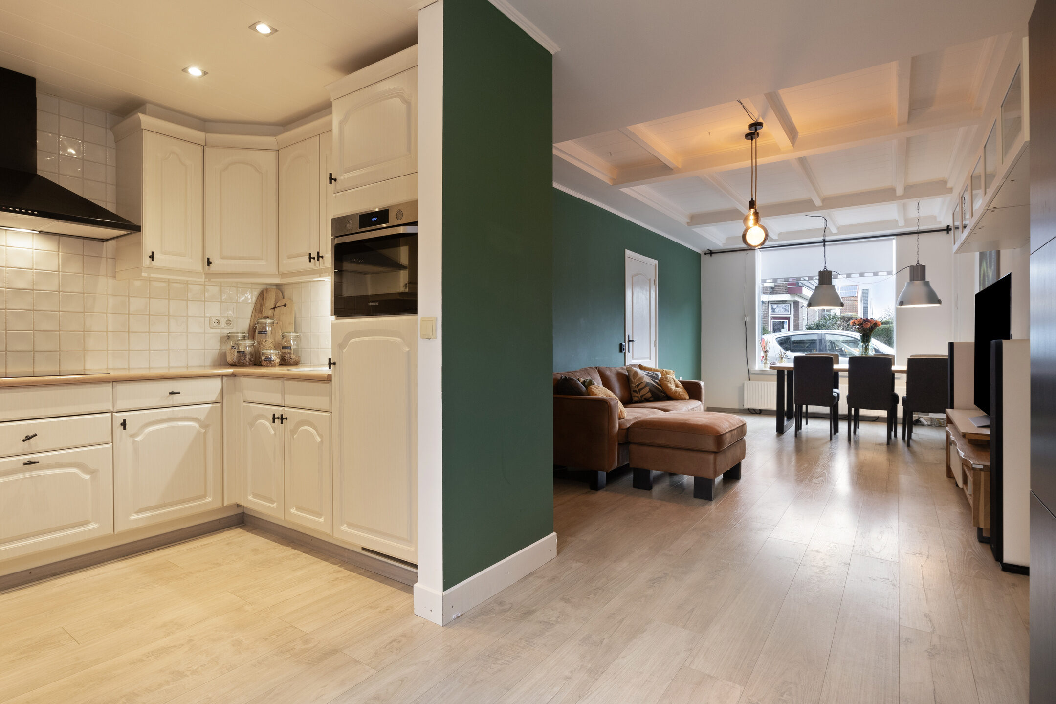 Blikvangers in de woonkamer zijn het karakteristieke balkenplafond, de mooie paneeldeuren met zwarte handgrepen en de houtlook laminaatvloer. Aan de achterzijde van de woning bevindt zich de open keukenruimte met openslaande deuren naar de tuin. We zien hier een nette L-vormige keukenopstelling die is afgewerkt met lichte fronten, een kunststof aanrechtblad in een houtstructuur en zwarte elementen als handgrepen. Alle gemakken zijn aanwezig zoals een inductiekookplaat, zwarte afzuigkap, combi-oven, koelkast en een vaatwasser. Woonkamer en keuken bieden samen circa 39m² aan stijlvol ingerichte leefruimte.
