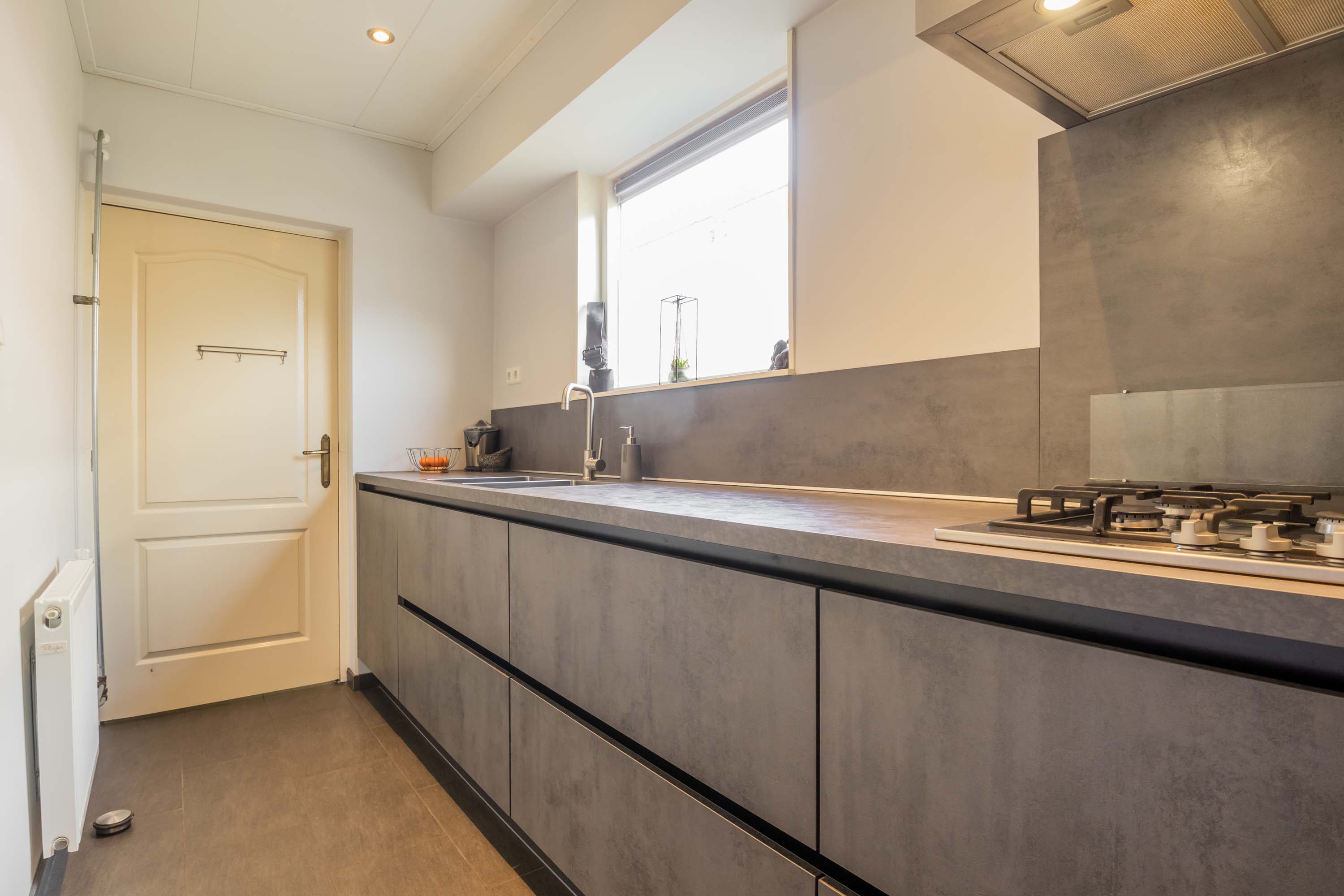 Het eetkamergedeelte is aan de tuinzijde gelegen en van daaruit is via een schuifpui de achtertuin te betreden. Vanuit het eetkamergedeelte is via een deur de keuken bereikbaar. In de keuken is een recent vernieuwde luxe in hoek geplaatste inbouwkeuken geplaatst. De inbouwkeuken beschikt over een gaskookplaat, afzuigkap, combi-oven, koelkast, dubbele spoelbak en een vaatwasser.