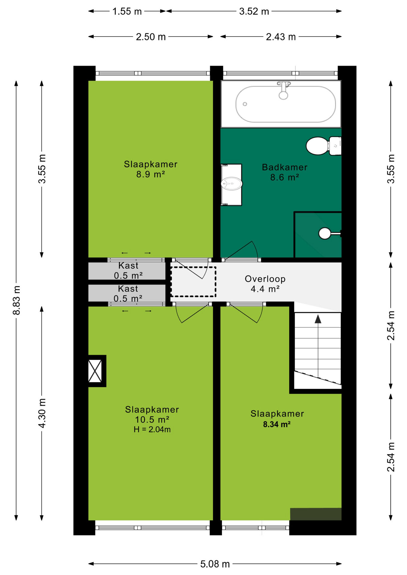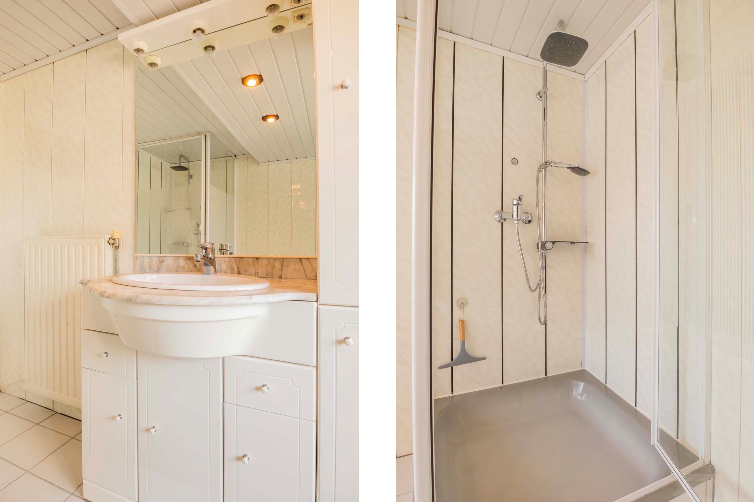 Overloop met toegang met toegang tot de drie mooie slaapkamers en de badkamer. De van originele mansarde kap is aan de achterzijde van de woning gewijzigd door een brede dakkapel, waardoor vel meer bruikbare woonruimte is ontstaan. Twee slaapkamers beschikken over vaste kasten met schuifdeuren. De ruime badkamer is uitgerust met een ligbad, douchecabine, toilet en een wastafel in een meubel met praktische bergruimte.