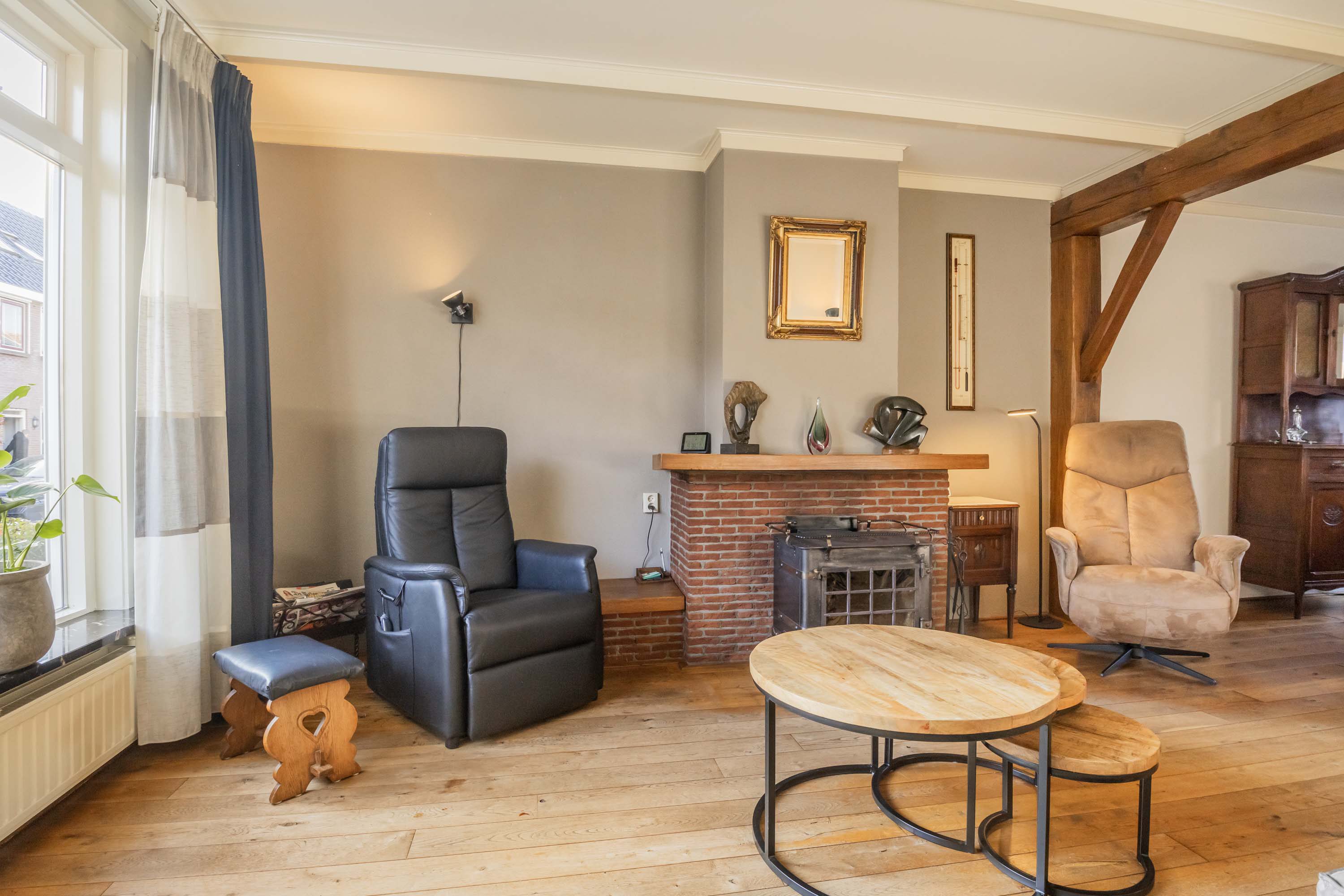 Hal/entree met de meterkast, de trapopgang naar de eerste verdieping en een deur naar de woonkamer. De sfeervolle woonkamer beschikt over een balkenplafon en een schouw met houtkachel, de vloer is afgewerkt met een houten vloer.