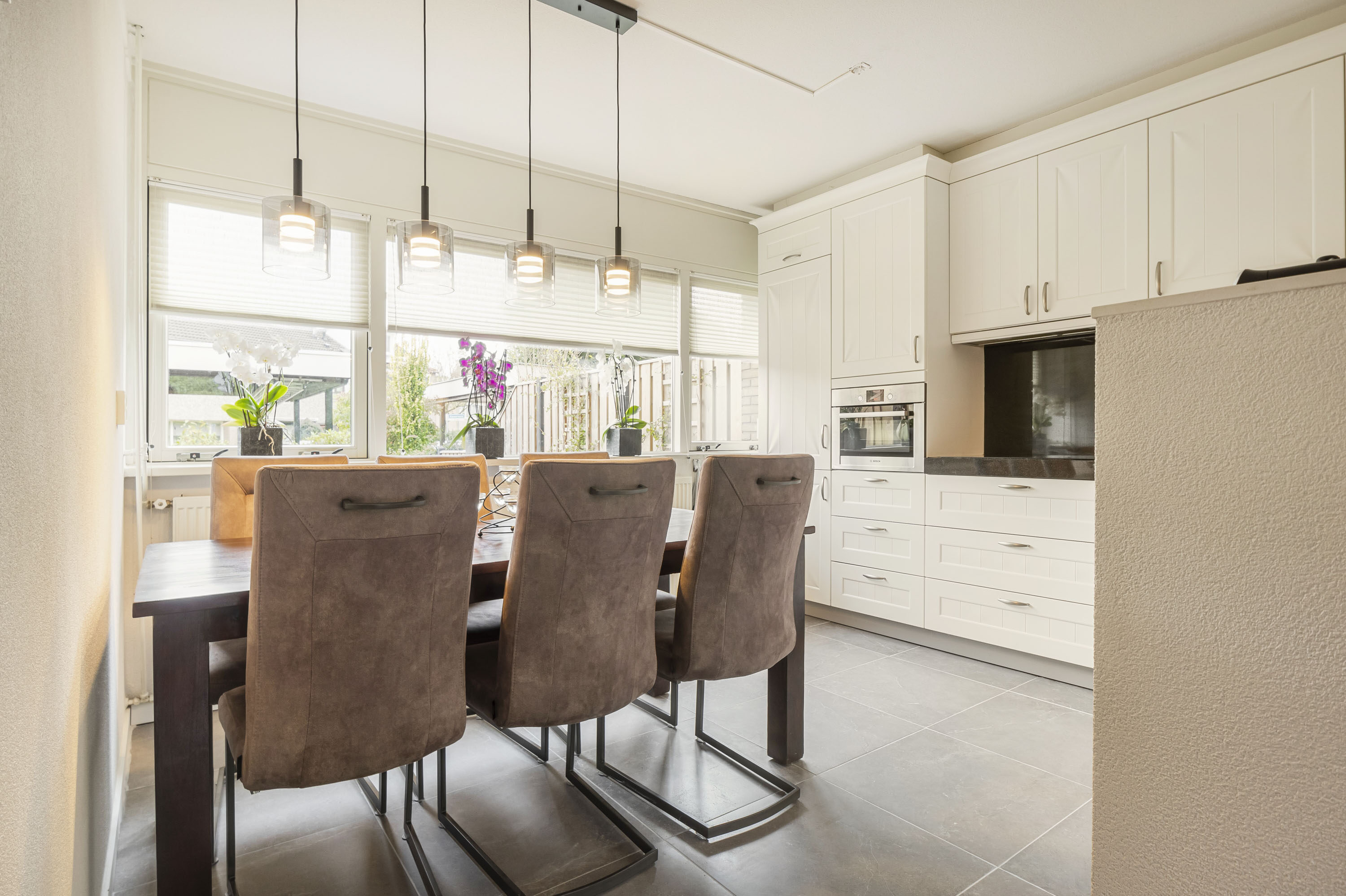 Aan de achterzijde vind je het eetgedeelte en de moderne L-vormige keuken met strakke witte kastjes, een donker marmer werkblad en hoogwaardige inbouwapparatuur, zoals een inductiekookplaat, oven, afzuigkap, koel-vriescombinatie en vaatwasser. Een heerlijke plek om te koken en samen te eten!