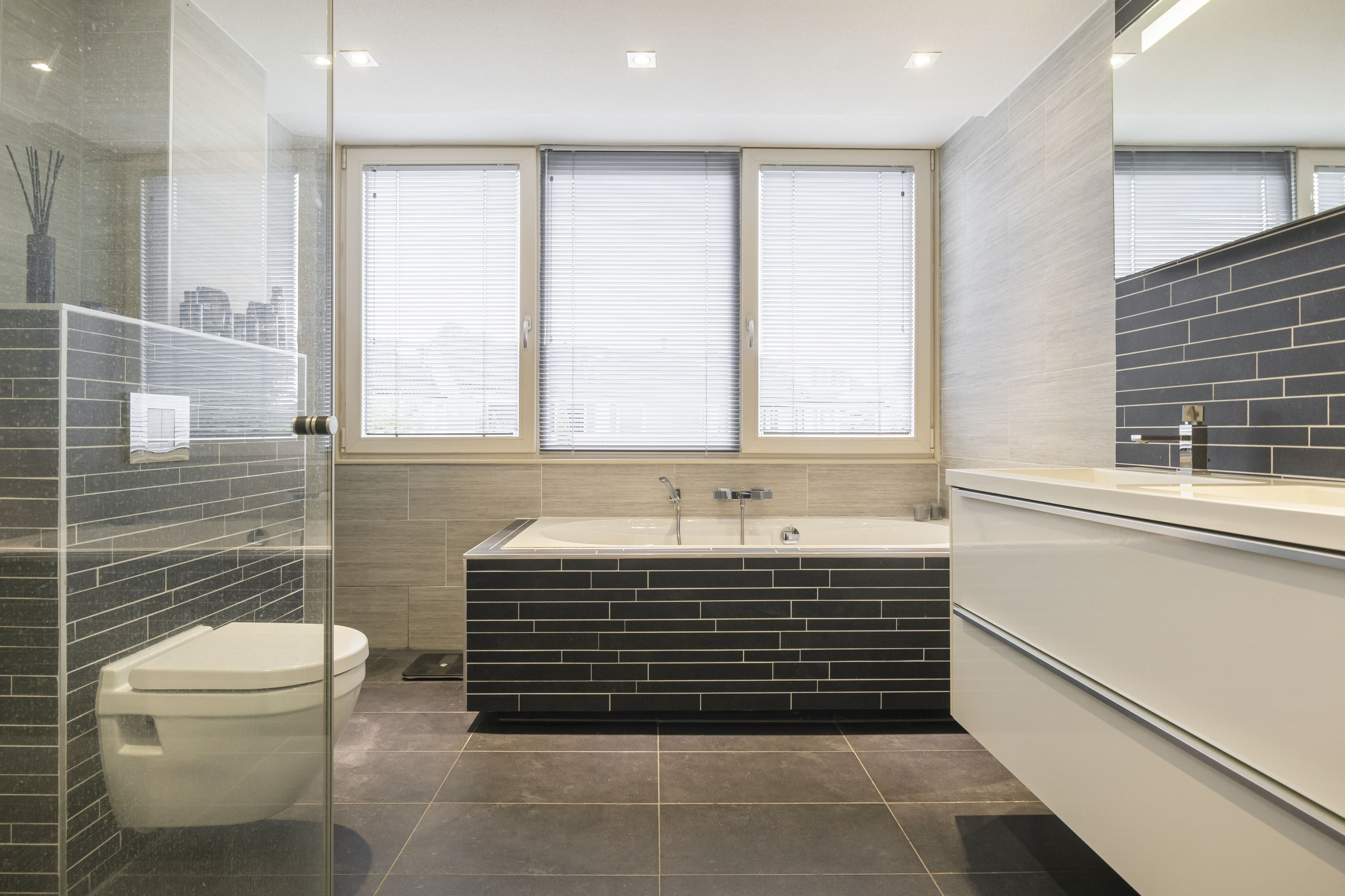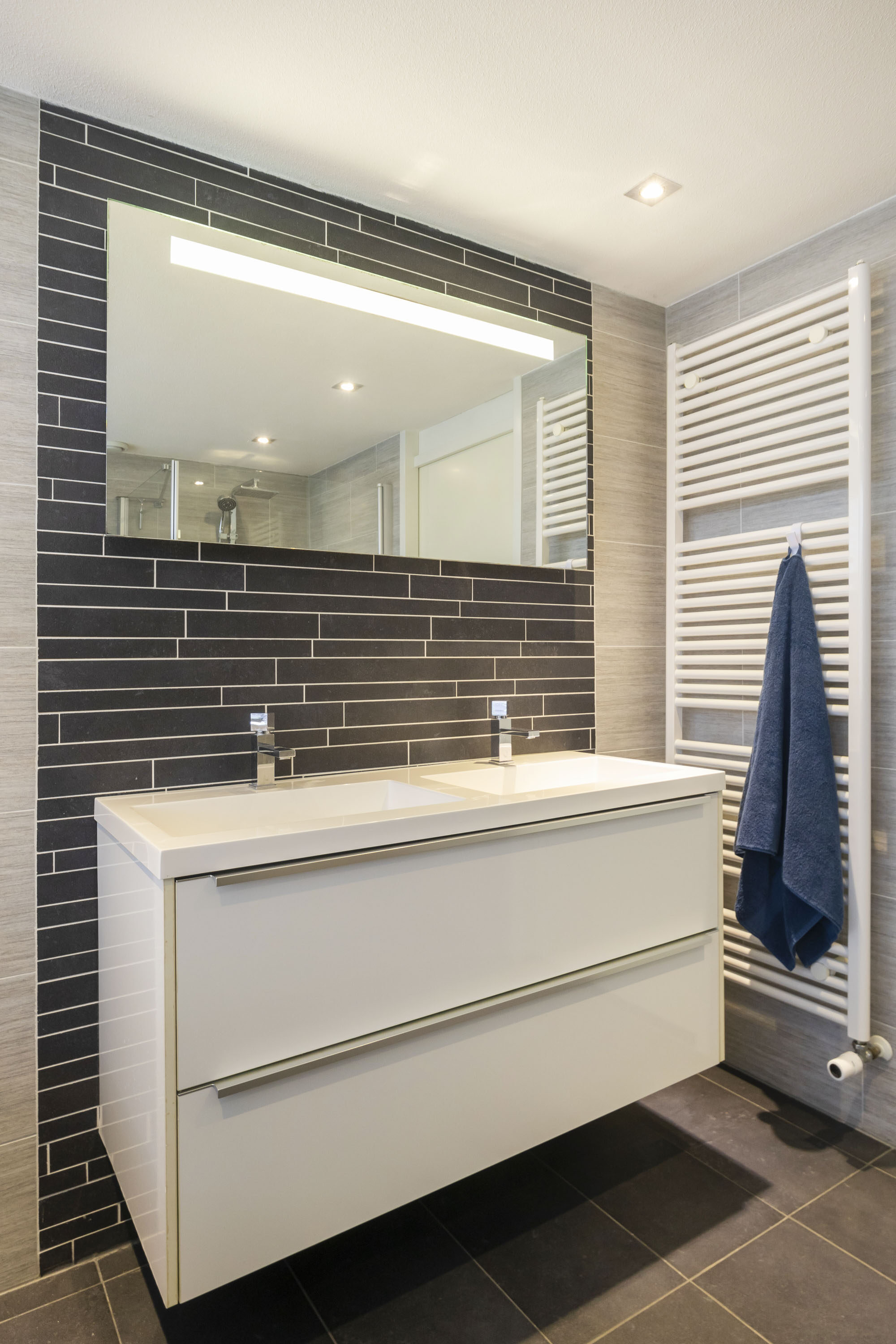 De moderne badkamer (8,6 m²) is compleet ingericht met een wastafelmeubel, tweede toilet, inloopdouche en ligbad. Dankzij het te openen raam geniet je van natuurlijke ventilatie en daglicht.