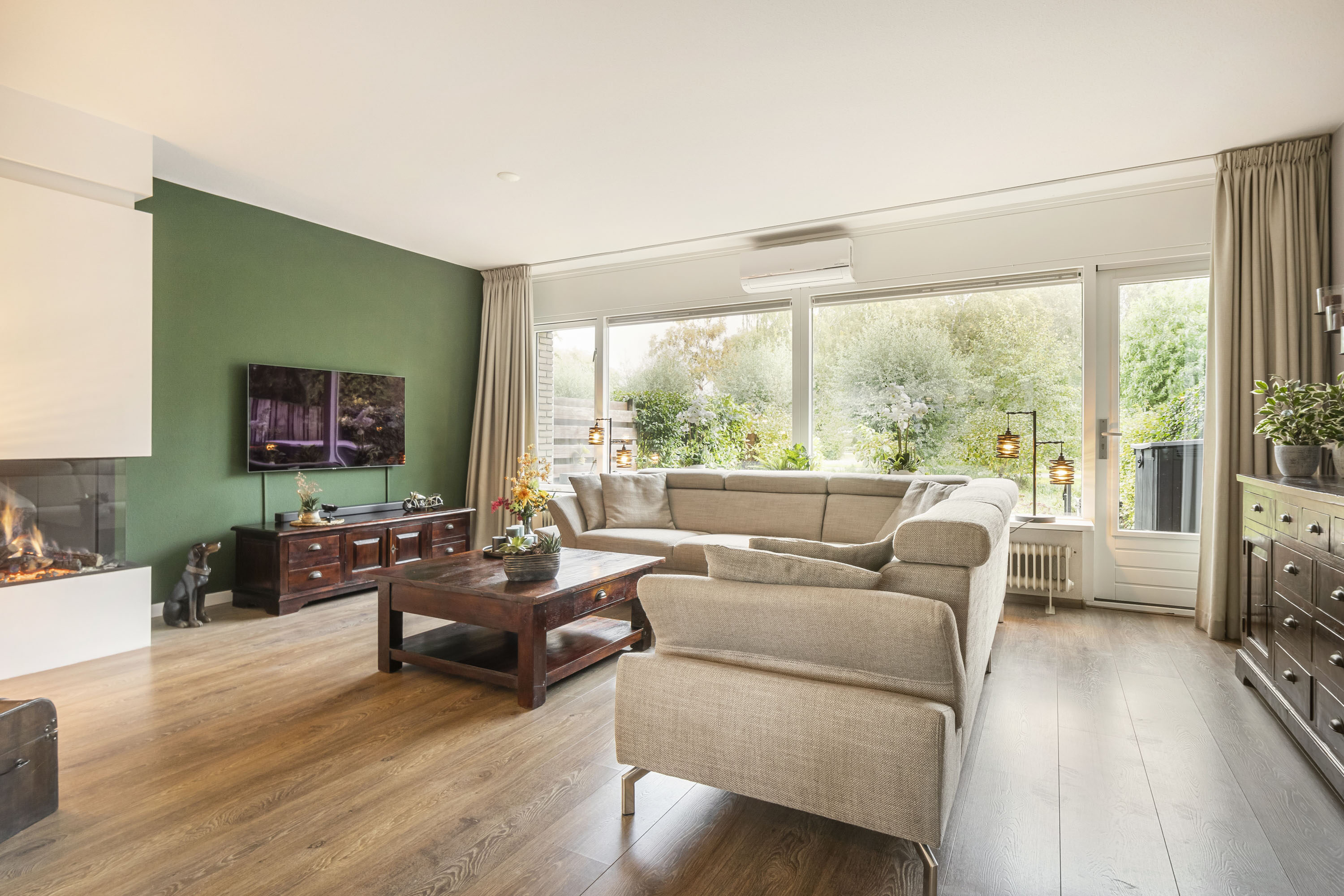 De woonkamer is bovendien voorzien van een airconditioning, die op warme zomerdagen zorgt voor een aangename koelte en in de winter juist heerlijk kan verwarmen. Een comfortabel en energiezuinig systeem dat bijdraagt aan het woongenot het hele jaar door.