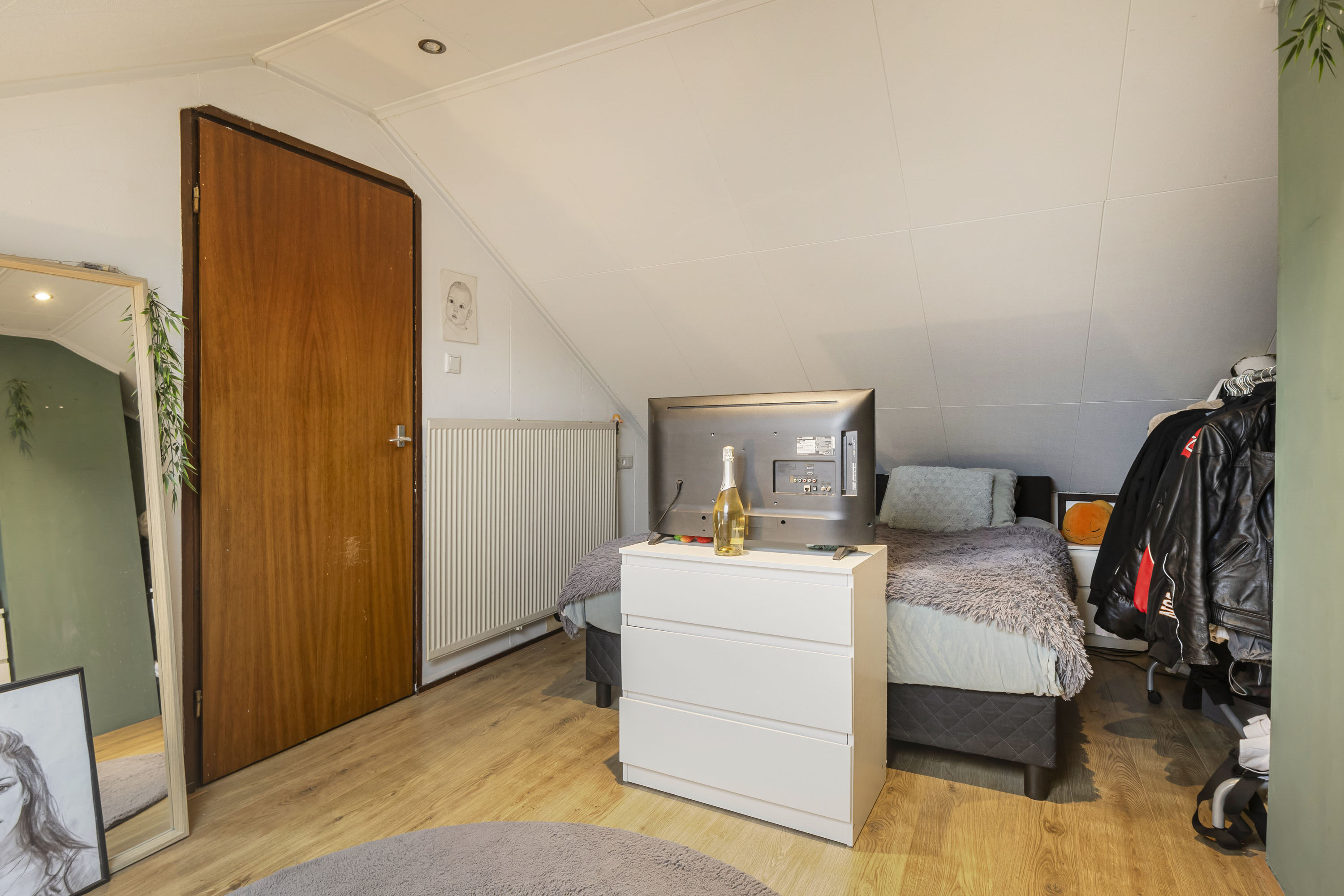 Via een vaste trap bereik je de zolderverdieping. Hier bevindt zich een ruime vierde slaapkamer (10,6 m²), ideaal als logeerkamer, werkruimte of hobbykamer. Op de overloop zijn de aansluitingen voor wasmachine en droger aanwezig en de beide grote dakramen zorgen voor veel lichtinval.