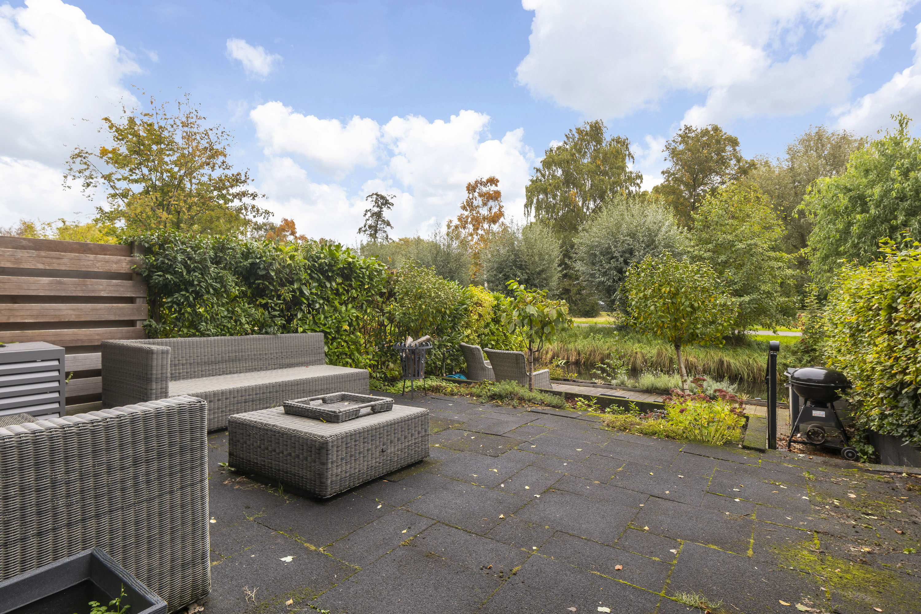 De fraai aangelegde tuin (58 m²) ligt op het oosten en grenst direct aan het water – een heerlijke plek om te ontspannen en te genieten van de zon. Er is voldoende ruimte voor een loungehoek en een eettafel om gezellig buiten te zitten. Hier ervaar je iedere dag het vakantiegevoel aan huis.