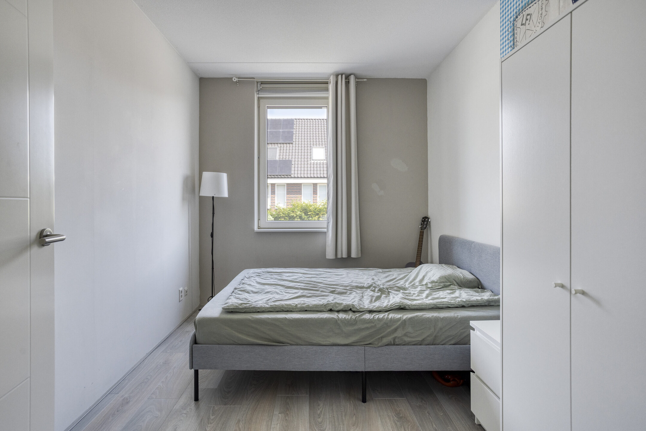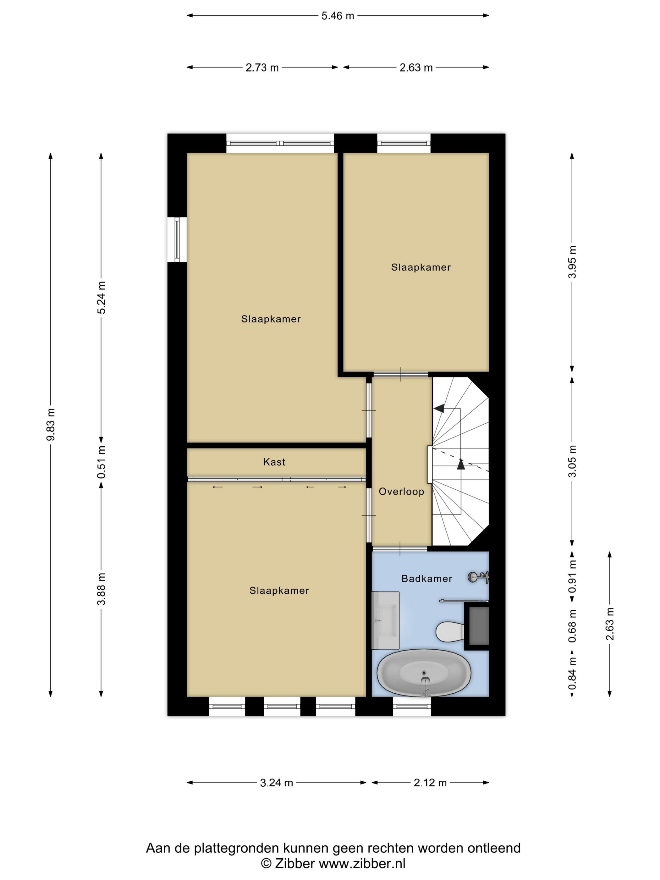 Via de vaste trap kom je uit op de overloop, die toegang biedt tot drie slaapkamers met respectievelijke afmetingen van 12,9 m², 14,9 m² en 10,3 m². Alle slaapkamers hebben een te openen raam, waarvan één slaapkamer extra is voorzien van ingebouwde kastruimte. De badkamer van 5,4 m² is modern afgewerkt met antracietkleurige tegels en beschikt over een wastafelmeubel, douche, toilet en ligbad. Ook hier is een raam aanwezig, wat zorgt voor natuurlijke ventilatie.