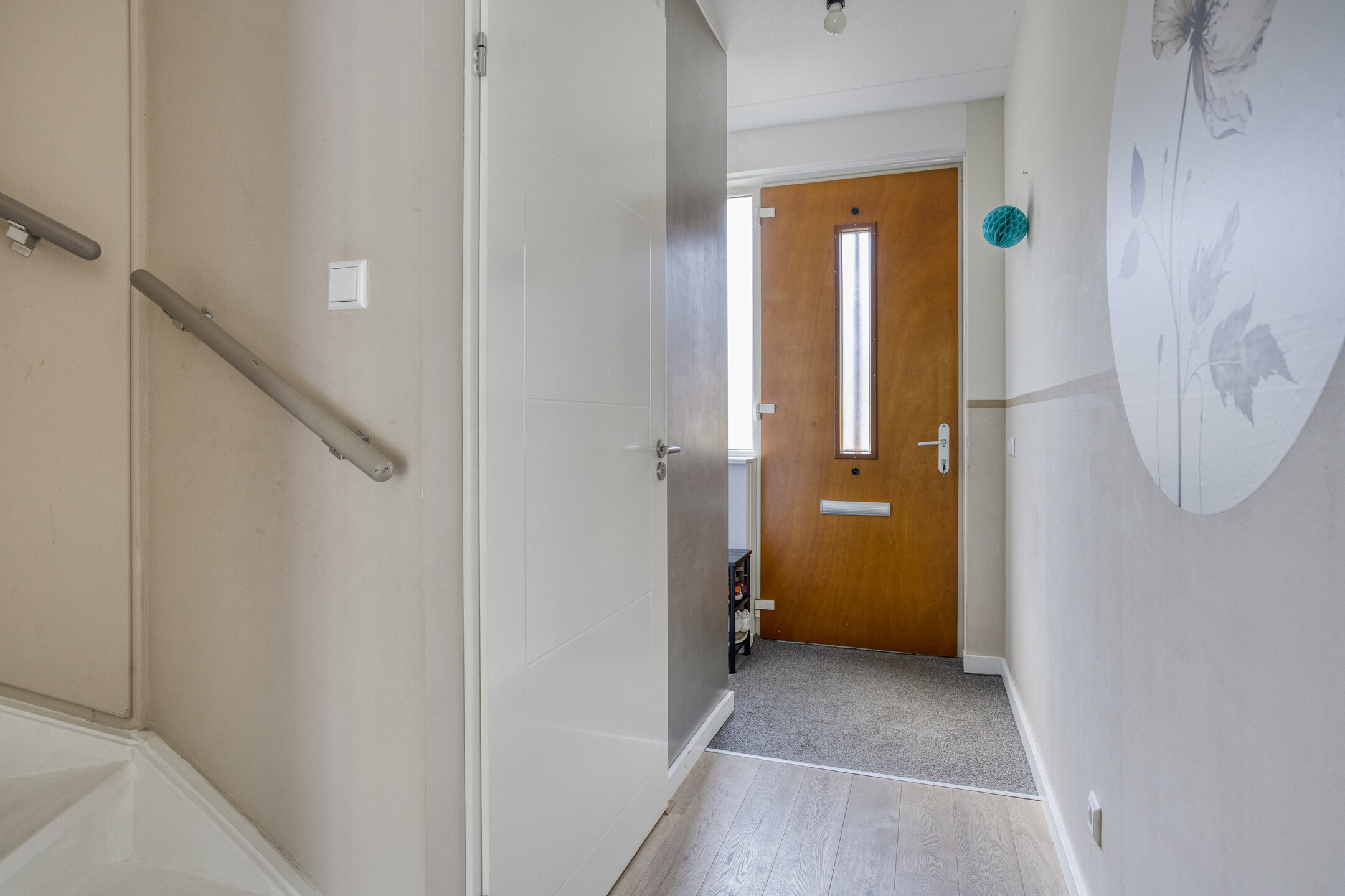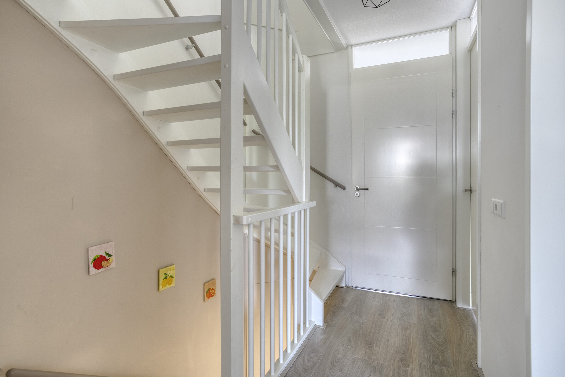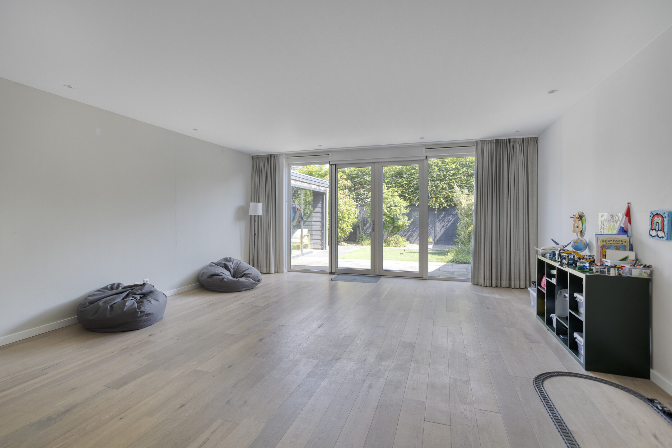 Via de entree, waar zich de meterkast en een modern toilet bevinden, betreed je de sfeervolle woonkamer. De woonkamer is ruim opgezet en wordt gekenmerkt door een grote glazen pui, die niet alleen zorgt voor een prachtig natuurlijk lichtinval, maar ook directe toegang biedt tot de achtertuin. Het strakke plafond is voorzien van inbouwverlichting, wat bijdraagt aan een moderne en afgewerkte uitstraling.