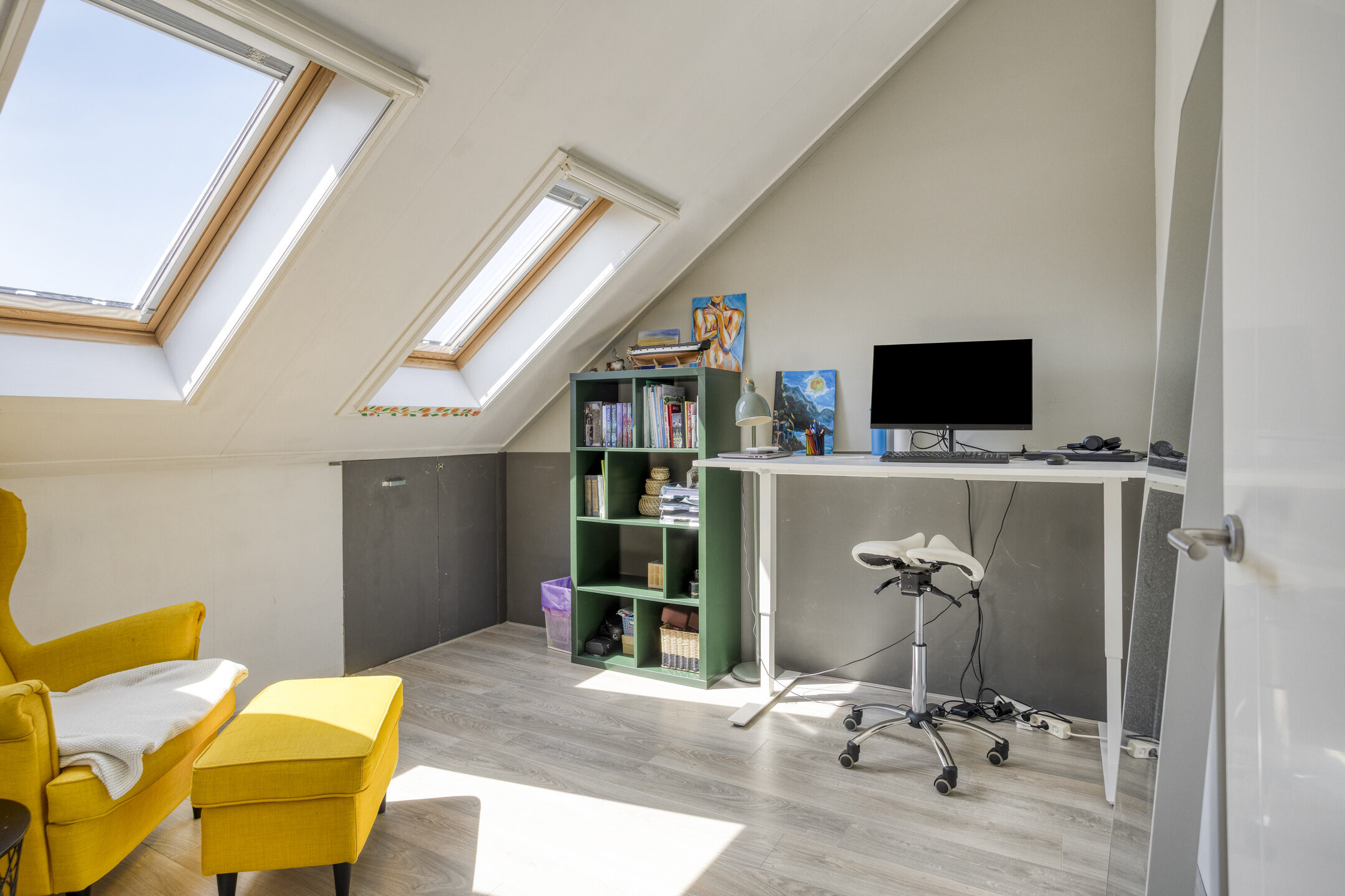 De zolder is bereikbaar via een vaste trap en biedt drie extra kamers, met afmetingen van 8,7 m², 10,6 m² en 6 m². Twee van deze kamers wordt momenteel gebruikt als werkkamer. Daarnaast bevinden zich op deze verdieping de aansluitingen voor de wasmachine en droger. De zolder is voorzien van een combinatie van een dakkapel en dakramen, wat zorgt voor volop daglicht.