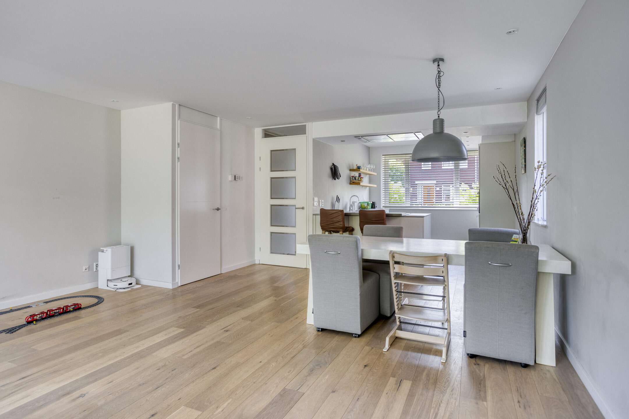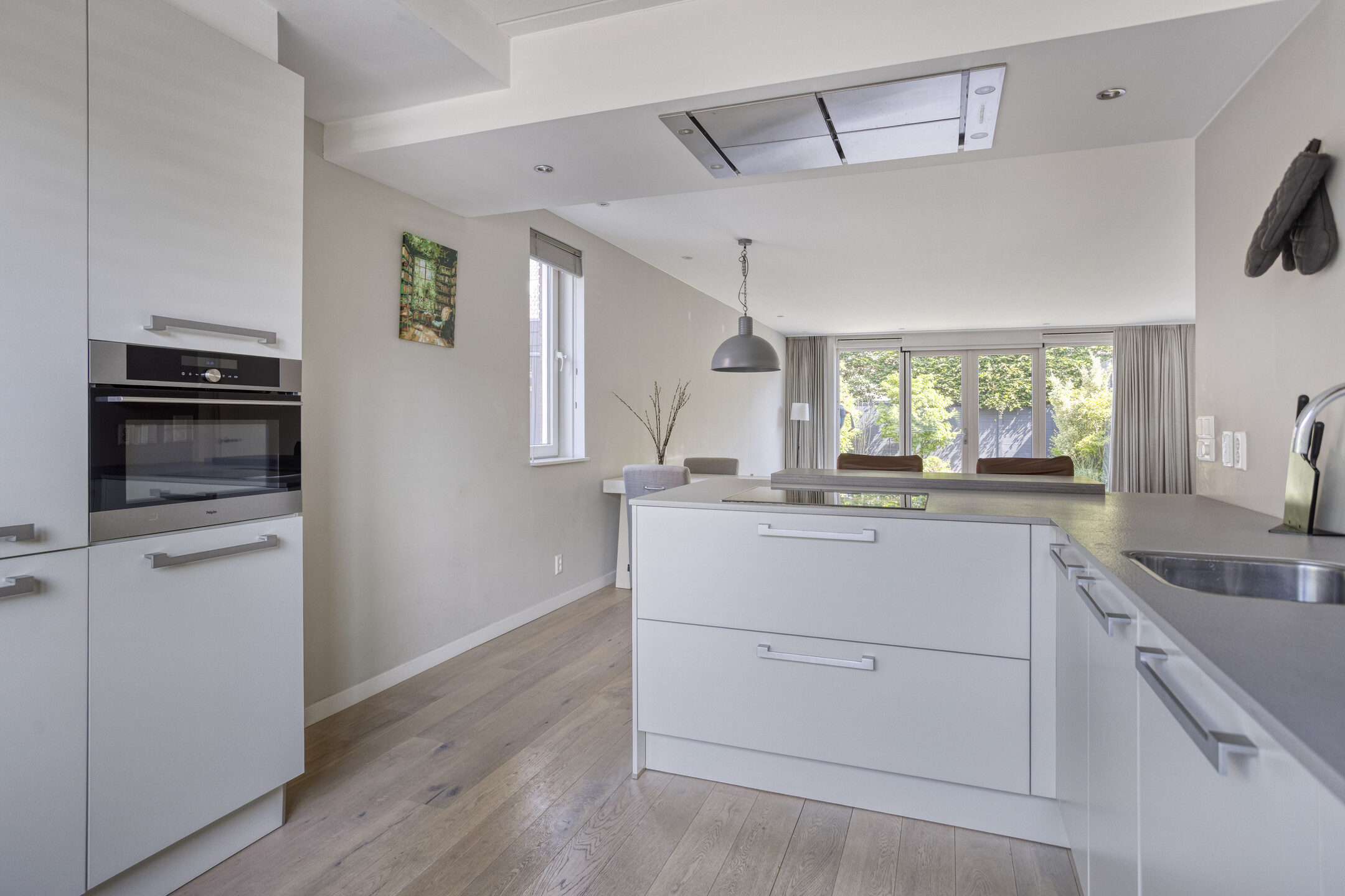Vanuit de woonkamer loop je door naar het eetgedeelte en de aangrenzende keuken. Hier is meer dan genoeg ruimte voor een grote eettafel, ideaal voor gezellige diners met familie of vrienden. De L-vormige keuken is stijlvol ingericht met witte keukenkastjes en een lichtgrijs aanrechtblad, en is volledig uitgerust met diverse inbouwapparaten. Denk daarbij aan een inductiekookplaat, een afzuigkap, een combi-oven, een koelkast en een vriezer. Daarnaast beschikt ook de keuken over een grote raampartij, die zorgt voor een prettige lichtinval en een extra ruimtelijk gevoel.