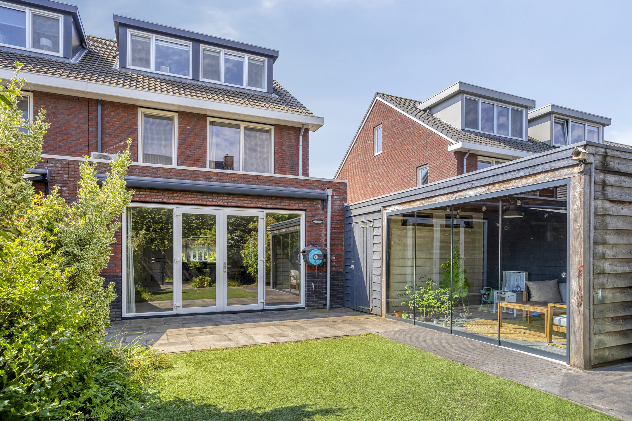 De fraai aangelegde tuin is gelegen op het oosten, wat betekent dat je in de ochtend en vroege middag kunt genieten van heerlijk zonlicht. De tuin is voorzien van diverse groenstroken en beplanting. Verder is er een sfeervolle veranda, ideaal om 's avonds buiten te zitten of te dineren, ongeacht het weer. Bovendien is de tuin ook eenvoudig bereikbaar via de garage. Deze veelzijdige buitenruimte nodigt uit om te ontspannen en te genieten van privacy.
