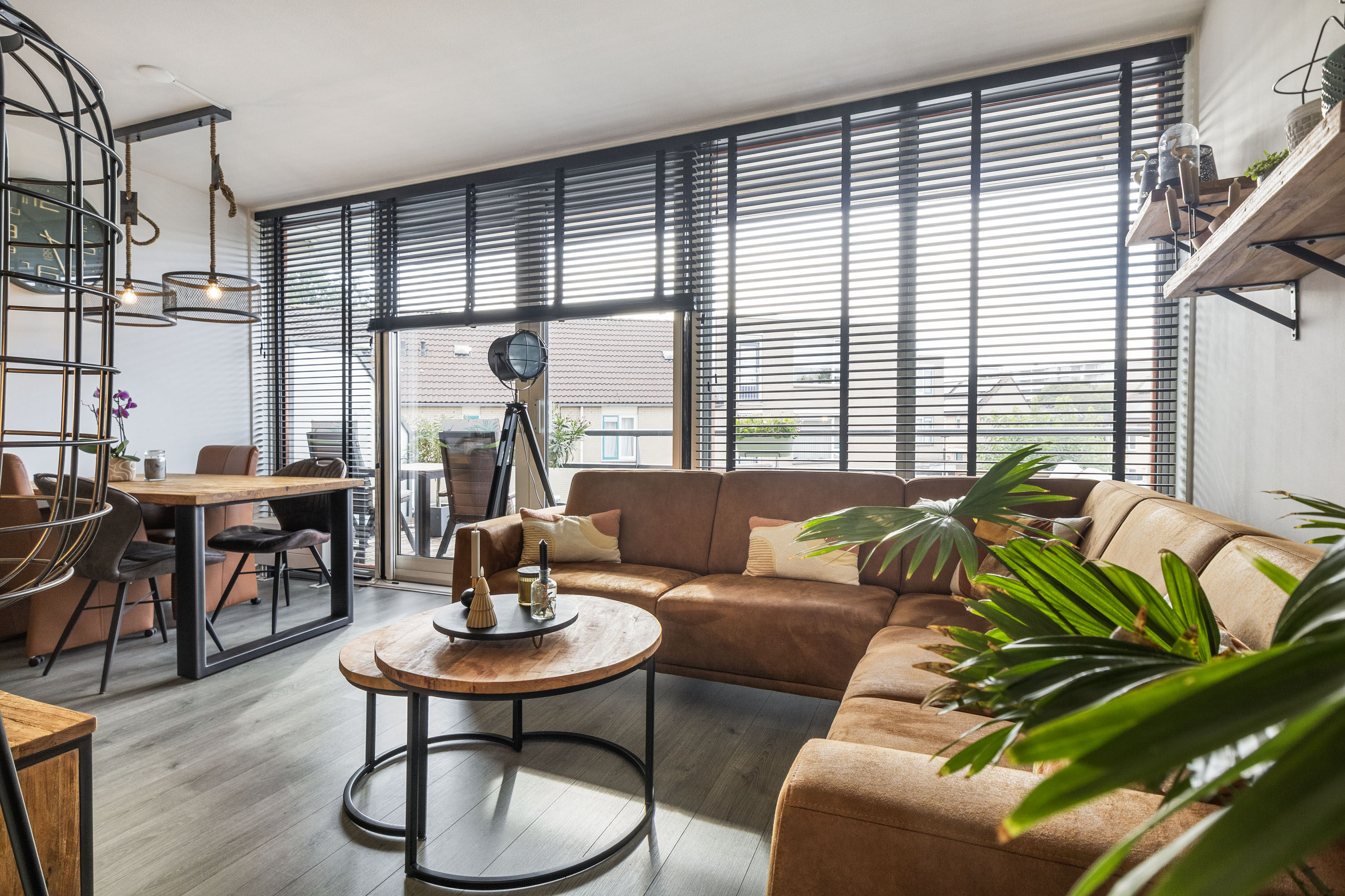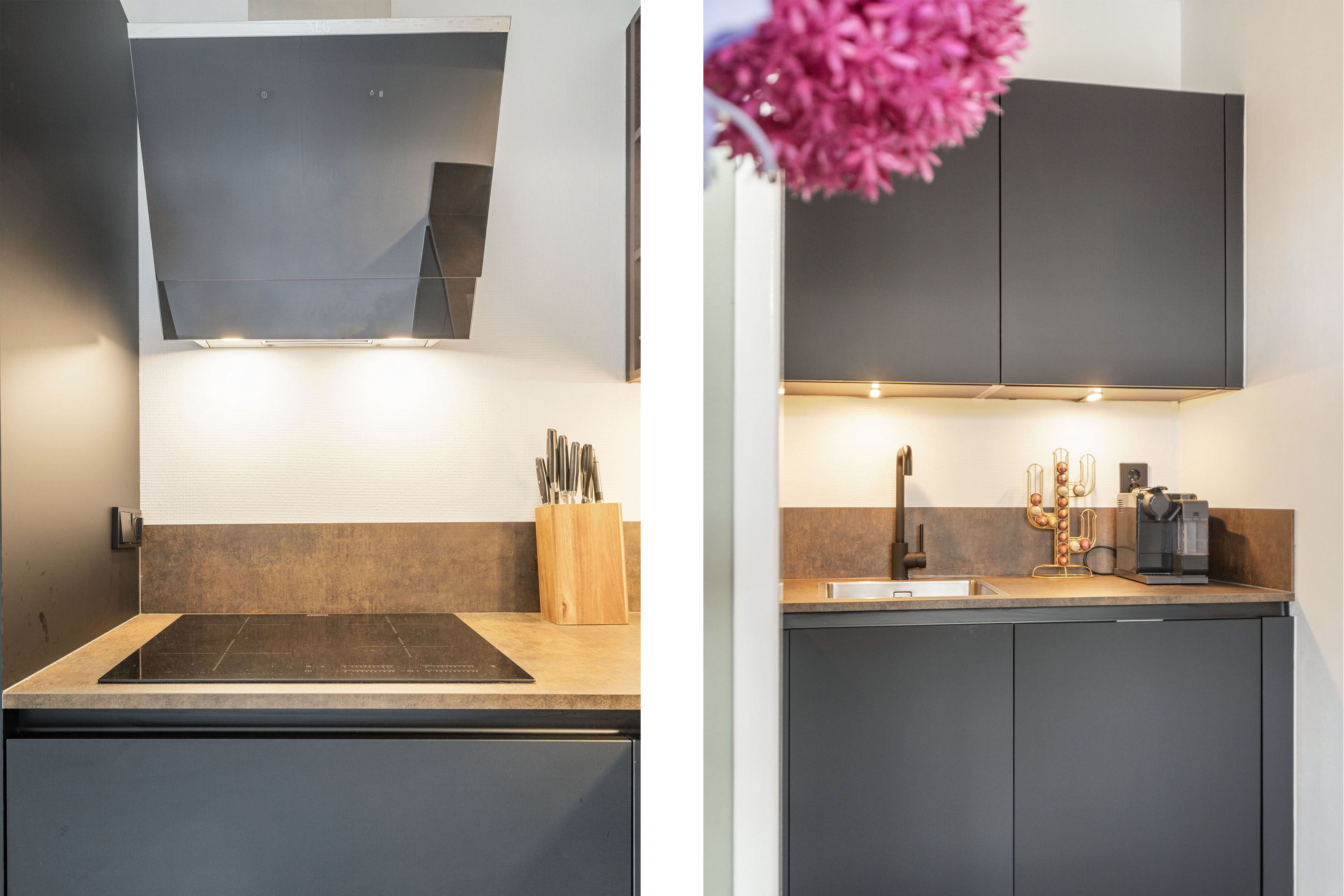 Via de ruime entree, waar tevens de meterkast bevindt, kom je in de lichte woonkamer terecht. Dankzij de grote raampartij aan de achterzijde beschikt de ruimte over genoeg natuurlijk licht. Er is volop plek voor een comfortabele hoekbank en een tv-meubel. Het aangrenzende eetgedeelte biedt voldoende ruimte voor een ruime eettafel. Vanuit deze zone bereik je de L-vormige compacte keuken, uitgevoerd in mat zwart met een licht werkblad. De moderne keuken uit 2022 is uitgerust met diverse inbouwapparatuur, zoals een kookplaat, afzuigkap, combi-oven, koelkast en vaatwasser.