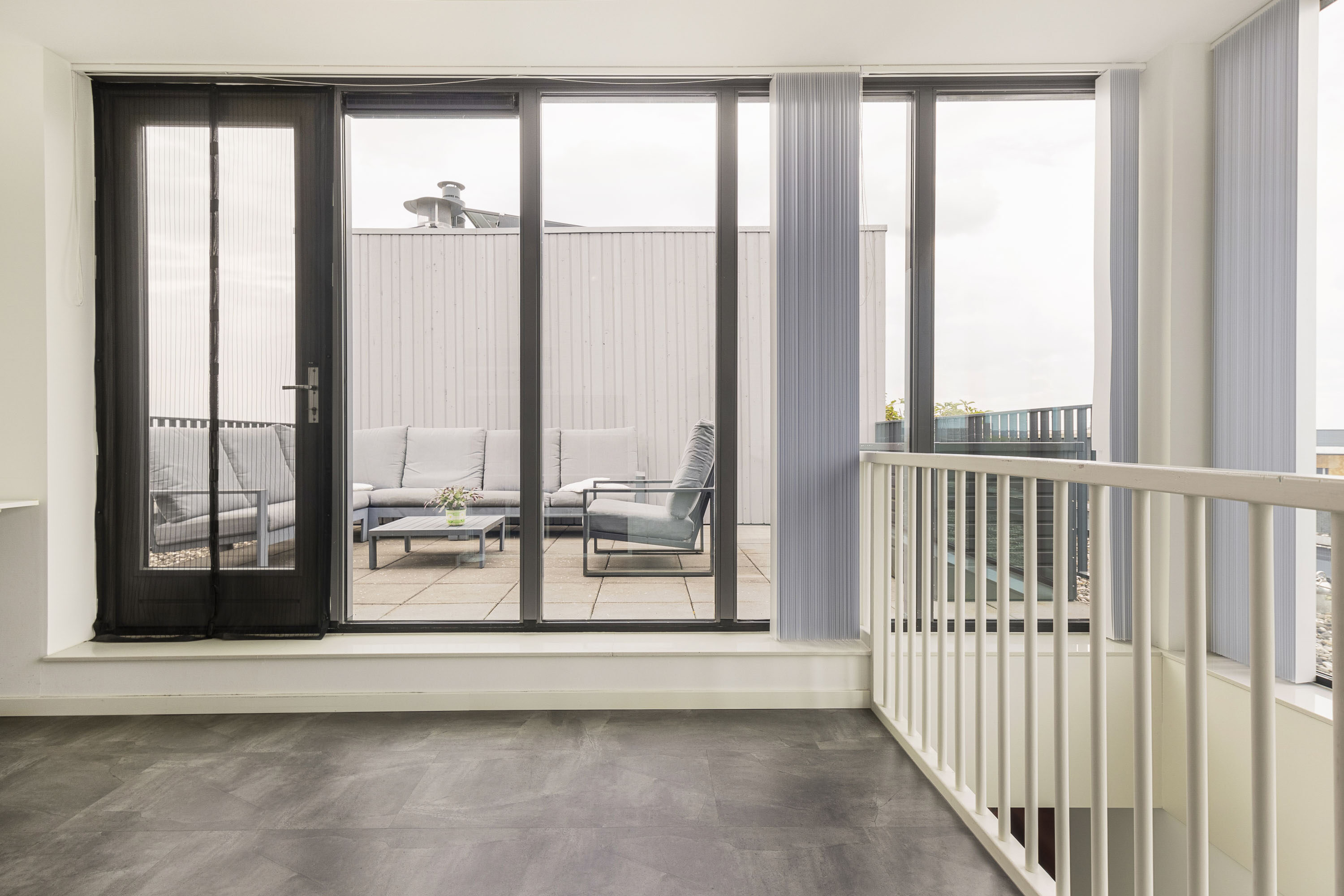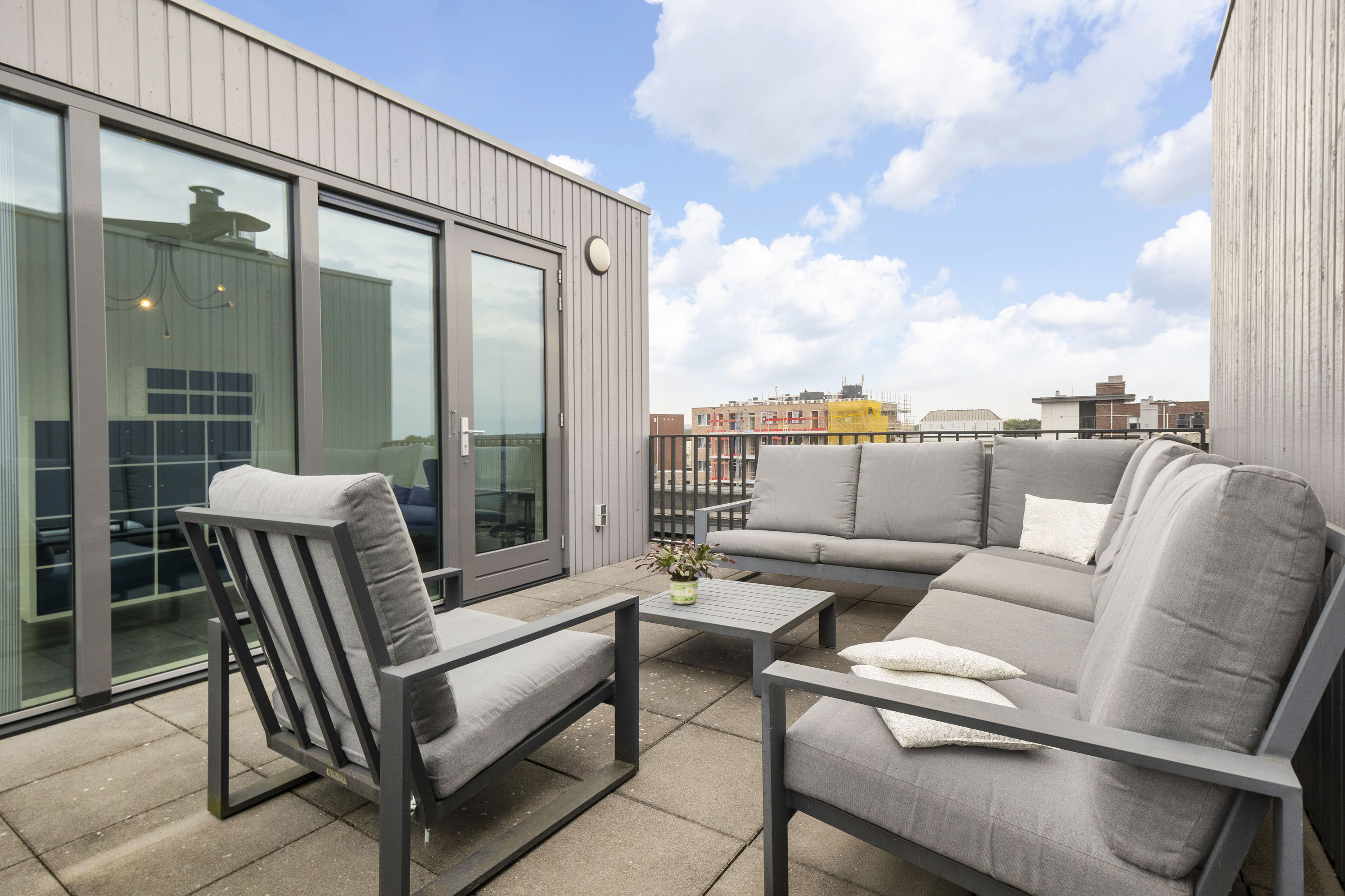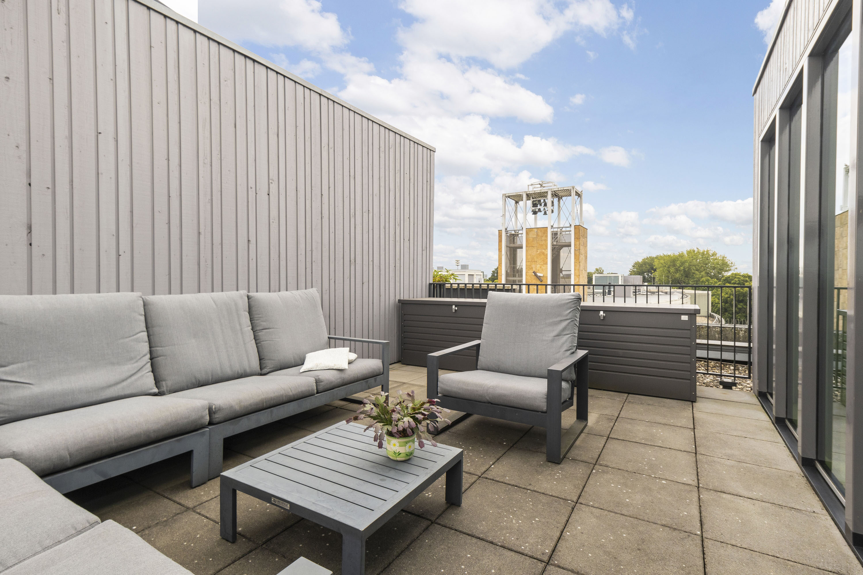Het dakterras en biedt veel ruimte om buiten te zitten en te genieten van zon en uitzicht.